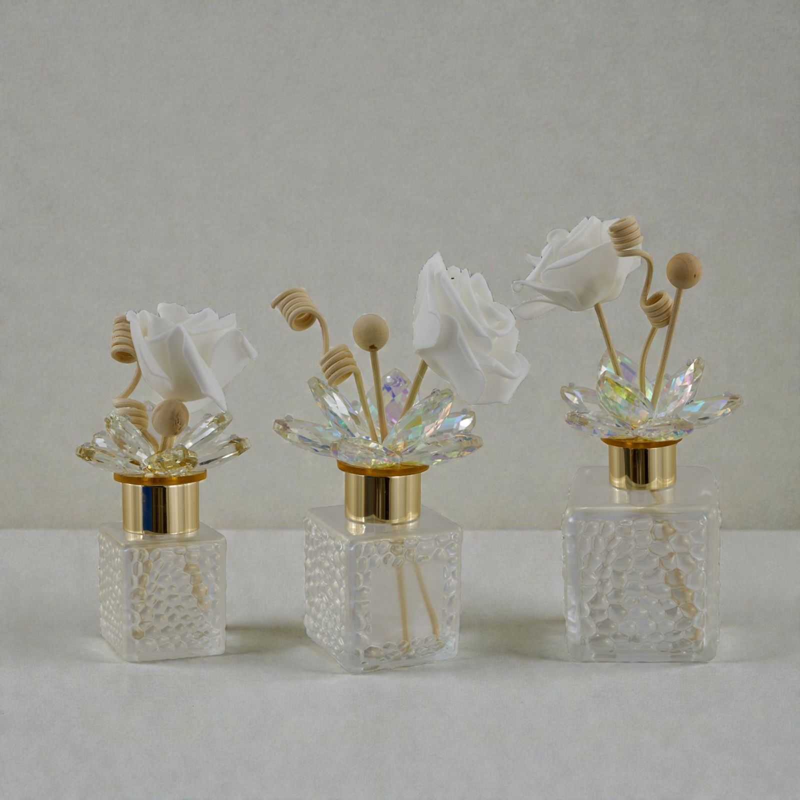 Vuoi sorprendere i tuoi ospiti con una bomboniera elegante e raffinata? Il nostro diffusore essenza in vetro particolare a bolle è perfetto per matrimoni, anniversari e ogni occasione speciale. Il tappo dorato, arricchito da delicati petali in Swarovski, dona luce e stile, rendendo questa bomboniera un ricordo unico e raffinato.