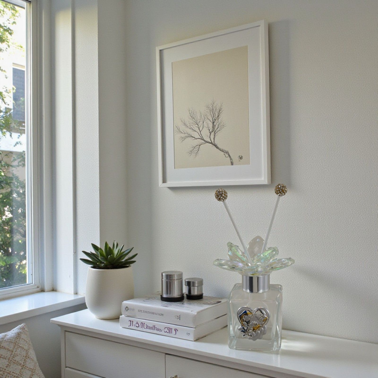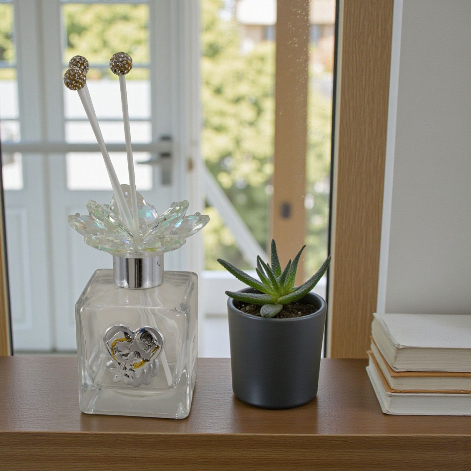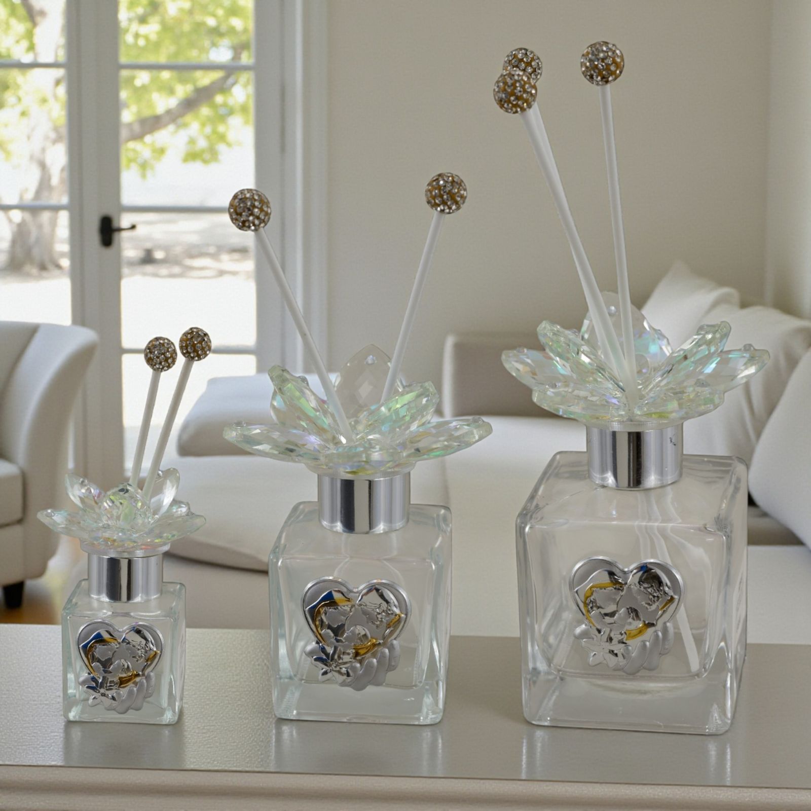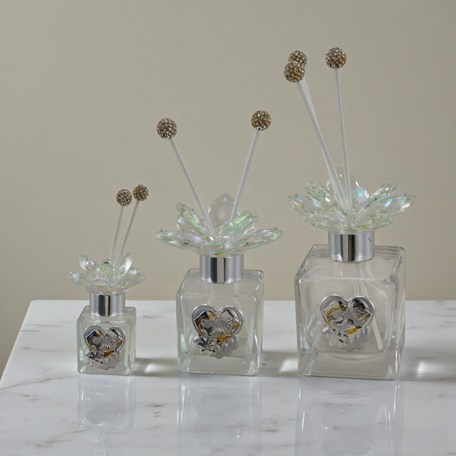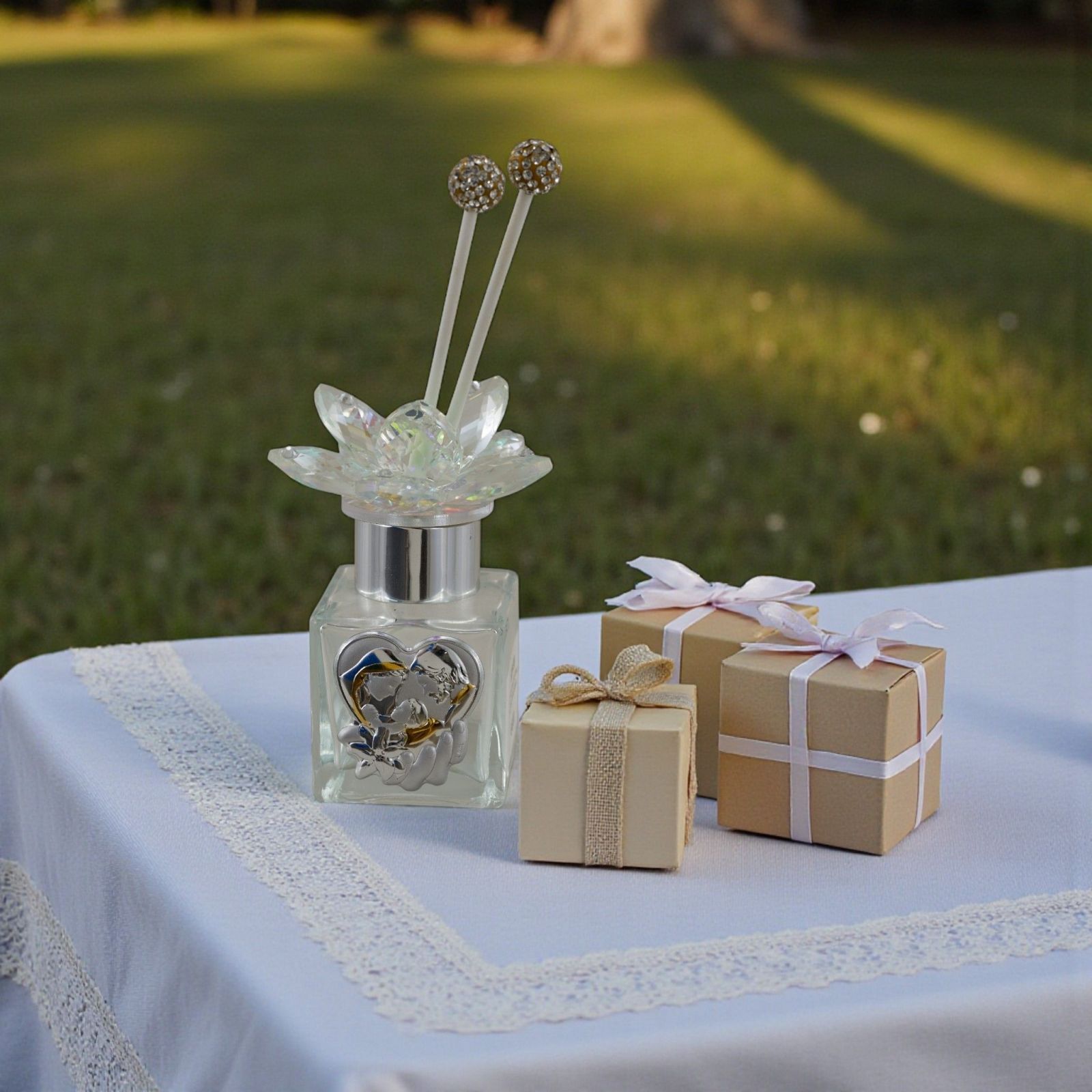 Realizzato in vetro con dettagli in swarovski e placchetta argentata con rifiniture dorate, questo diffusore non è solo bello da vedere, ma porta con sé un significato speciale. È un piccolo gesto che racconta cura, affetto e devozione, trasformando la bomboniera in un ricordo prezioso che accompagna chi lo riceve nella quotidianità. Le bacchette per la diffusione e la elegante scatola regalo sono incluse nel prezzo, pronte per essere consegnate agli invitati senza ulteriori pensieri.