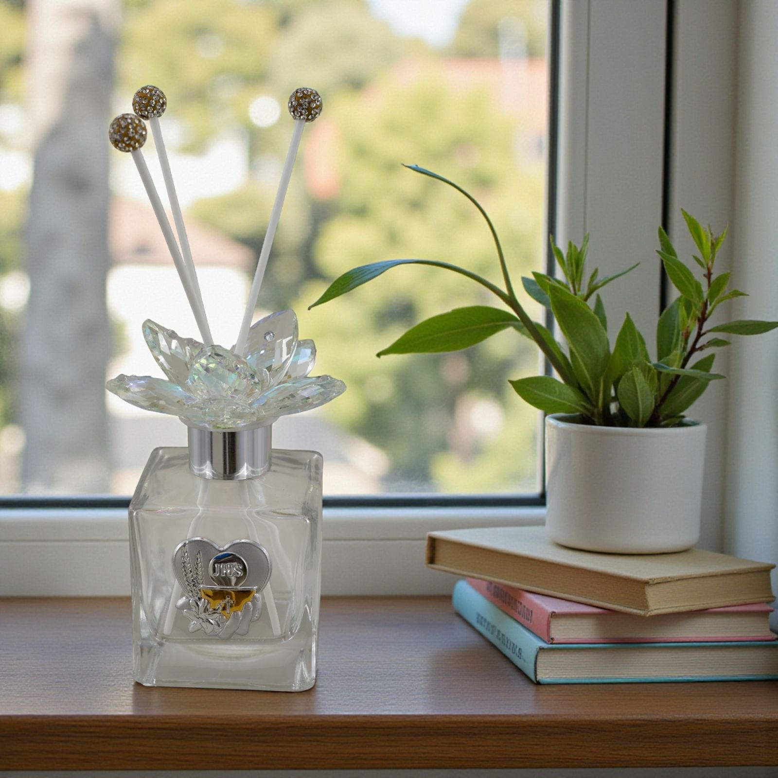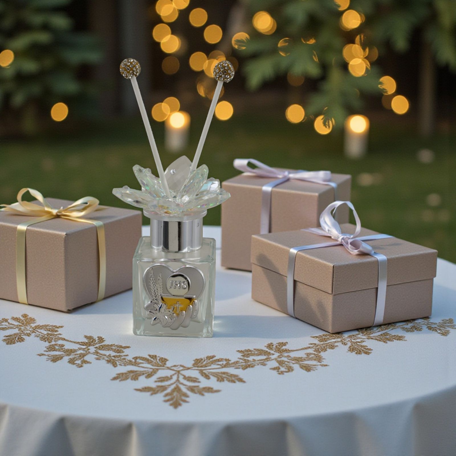 Un dono che parla al cuore dei tuoi invitati: questo diffusore ambiente è la scelta ideale per celebrare la Prima Comunione. Il tappo color argento con fiore in swarovski e la delicata placchetta a forma di cuore con i simboli sacri del calice e dell’ostia rendono questa bomboniera un oggetto unico, elegante e ricco di significato, pensato per sorprendere e emozionare chi lo riceve.