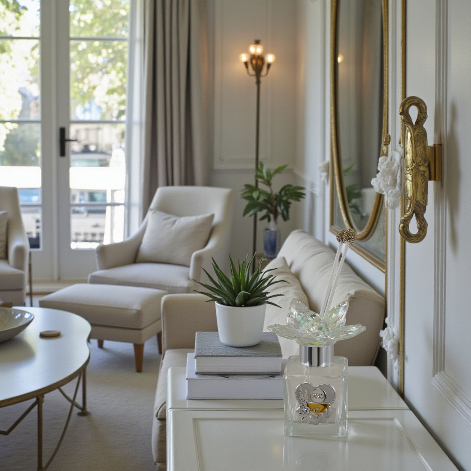 Realizzato in vetro con dettagli in swarovski e placchetta argentata con rifiniture dorate, questo diffusore non è solo un regalo bello da vedere, ma un simbolo di affetto e spiritualità. Le bacchette e la scatola regalo sono incluse nel prezzo, pronte per essere consegnate agli invitati come un pensiero completo e curato.