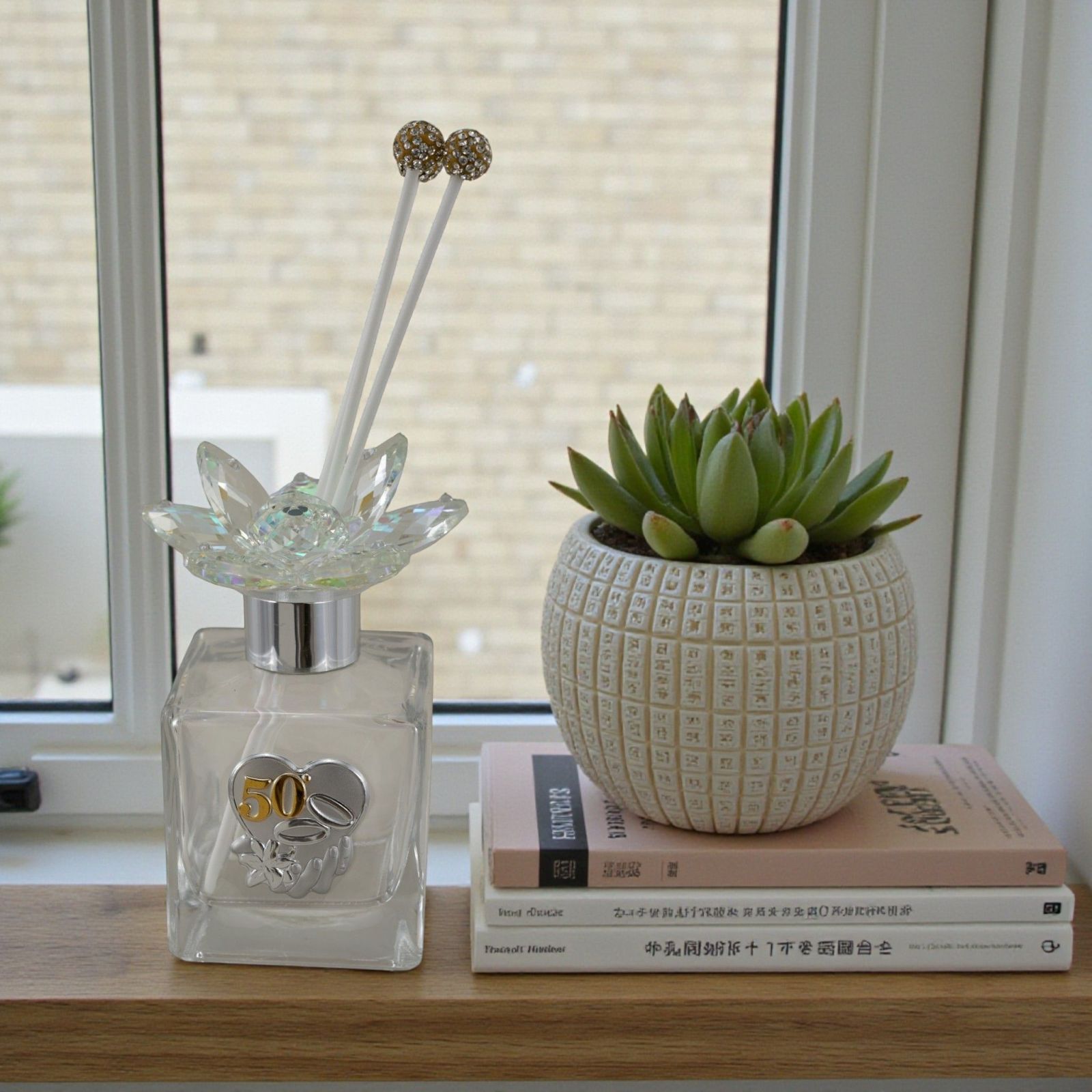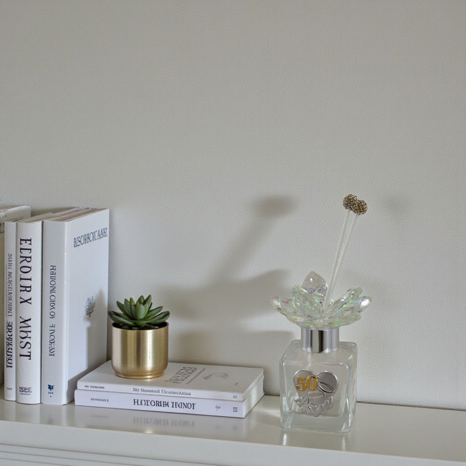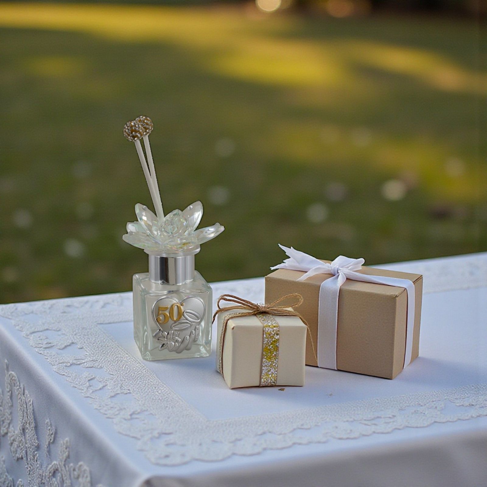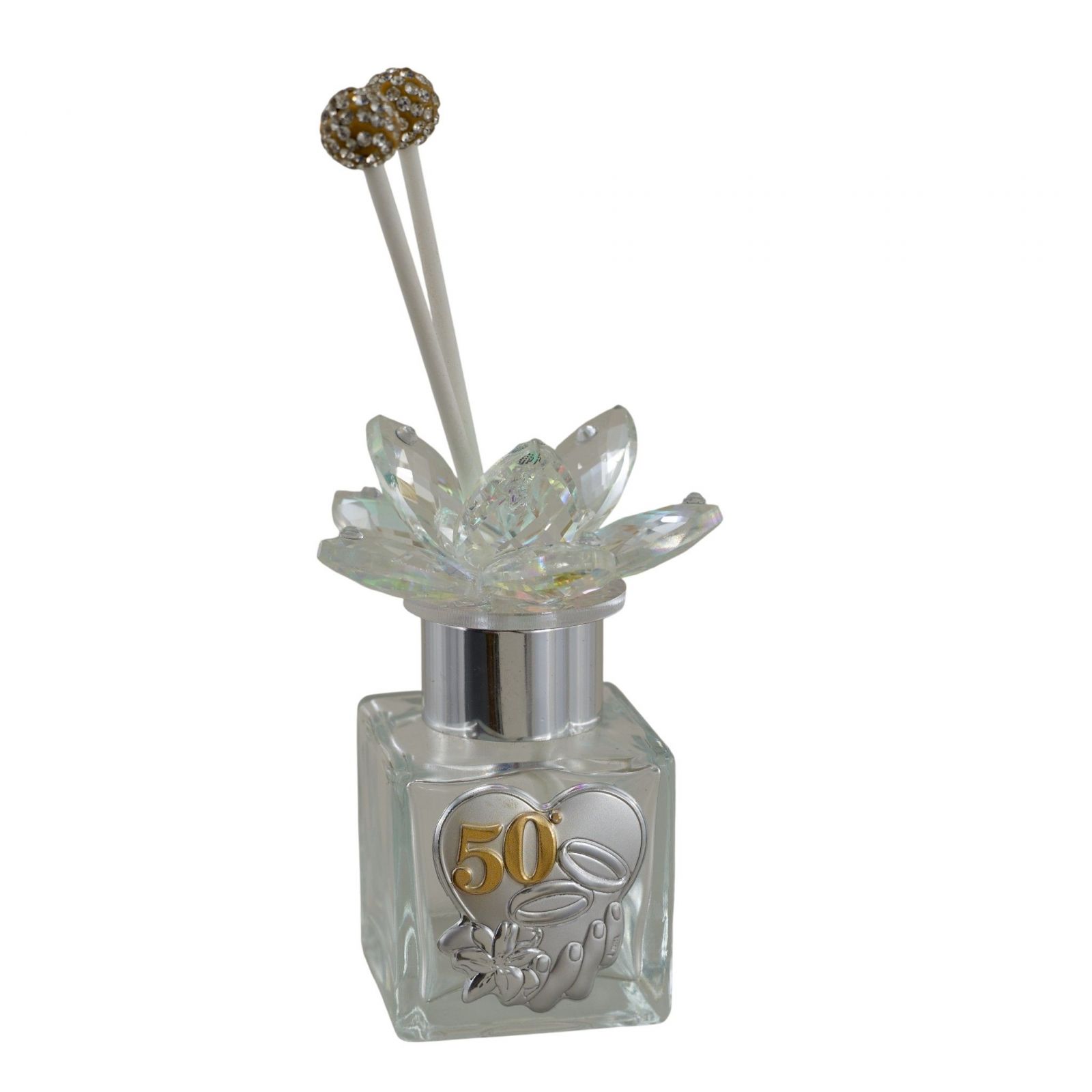 Celebra un amore che dura da 50 anni con questo elegante profumatore ambiente, un dono raffinato e ricco di significato. Il tappo color argento impreziosito da un fiore in swarovski e la placchetta a forma di cuore con le fedi e il numero 50° con dettagli color oro rendono questa bomboniera un ricordo prezioso, perfetto per emozionare i tuoi invitati durante un anniversario così speciale.