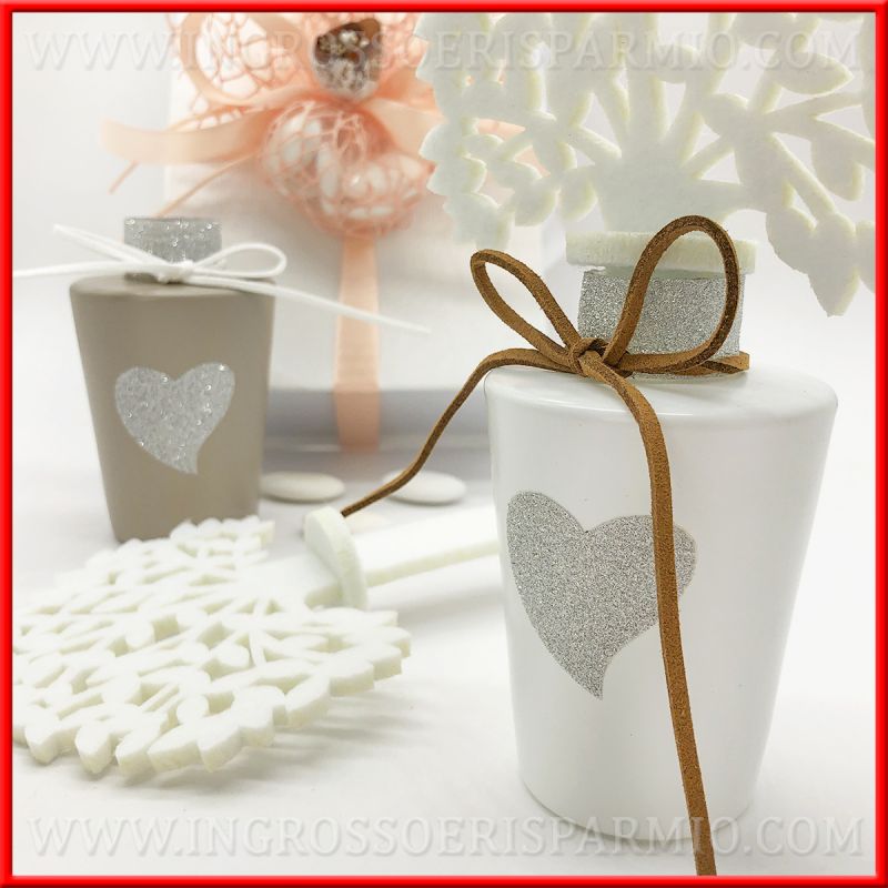 Diffusori per ambiente con porta profumo a forma di vaso bianco o tortora (a seconda del modello scelto) decorato da un cuore glitterato argento e brucia essenze a forma di albero della vita in feltro bianco che, assorbendo il profumo, lo diffonderà nell'ambiente.