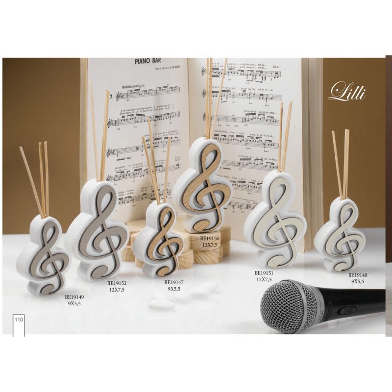 Profumatori per ambienti bomboniere a forma di chiavi di violino, in resina e polvere di marmo bianca e legno.