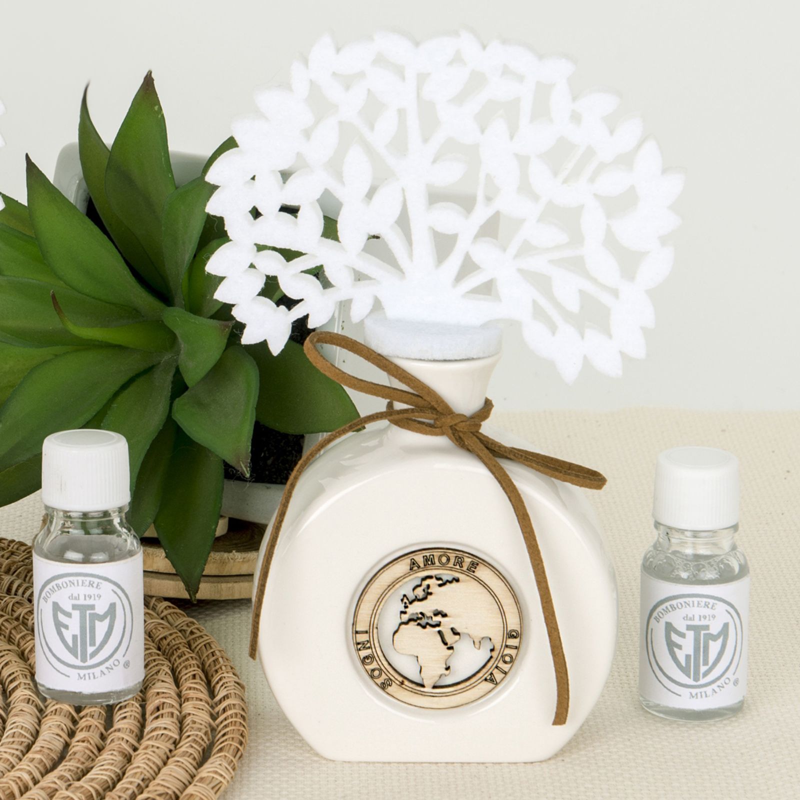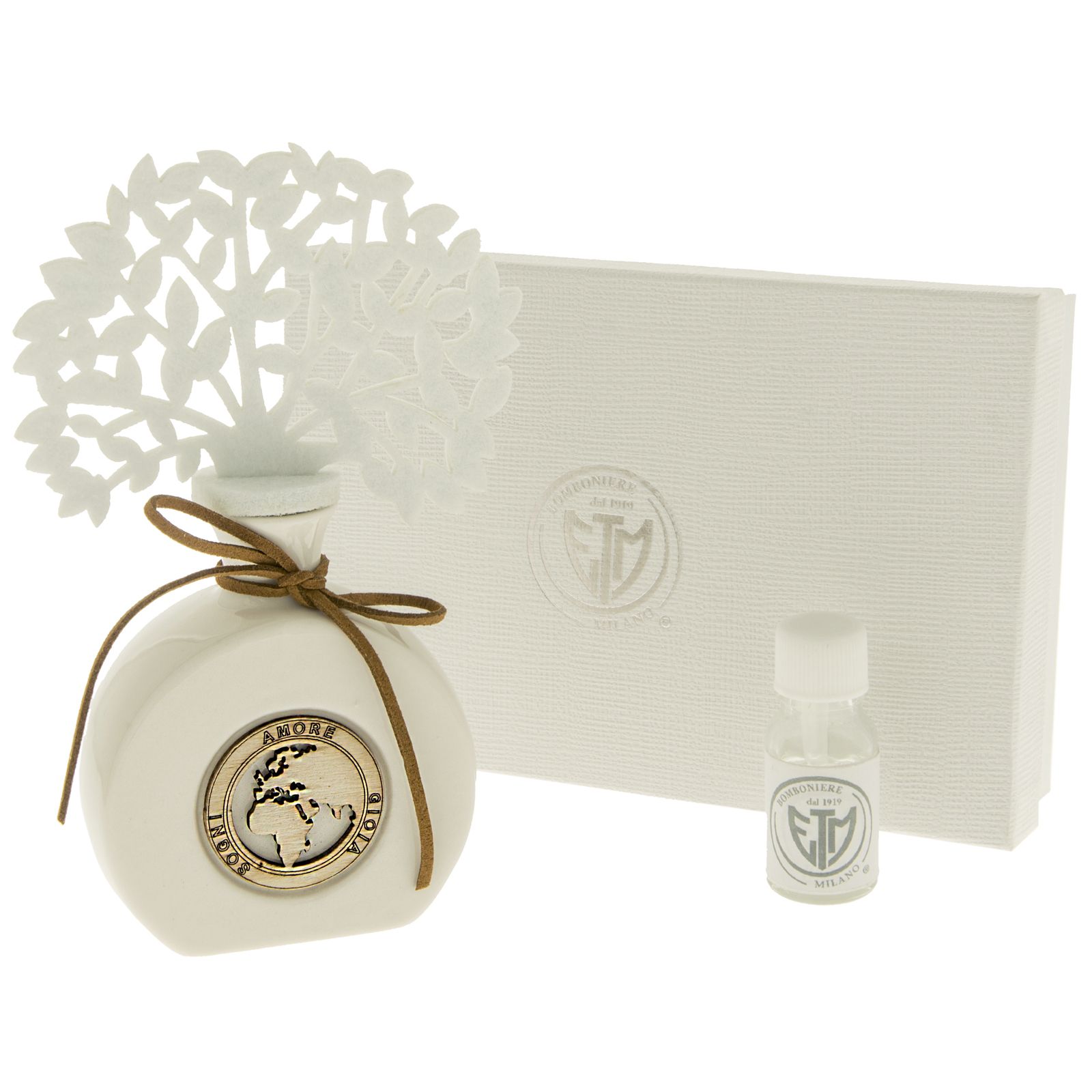 Ecco i nostri diffusori per ambiente in porcellana bianca finissima con applicazione frontale in legno con mappamondo circondato dalle espressioni "Amore", "Gioia", "Sogni". Il diffusore vero e proprio, a forma di albero della vita è realizzato in panno e assorbe direttamente l'essenza versata all'interno rilasciandola gradualmente.