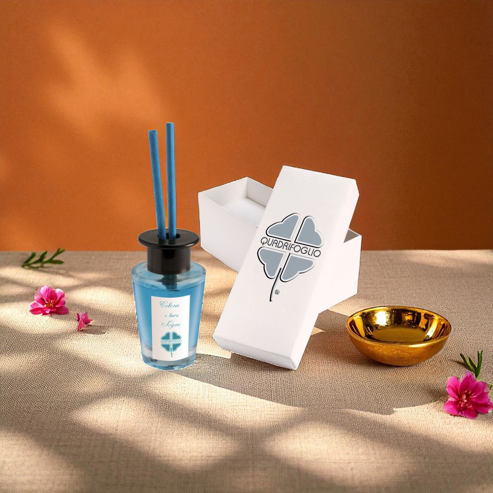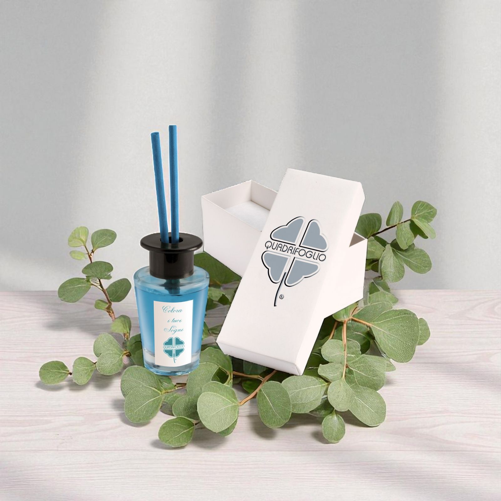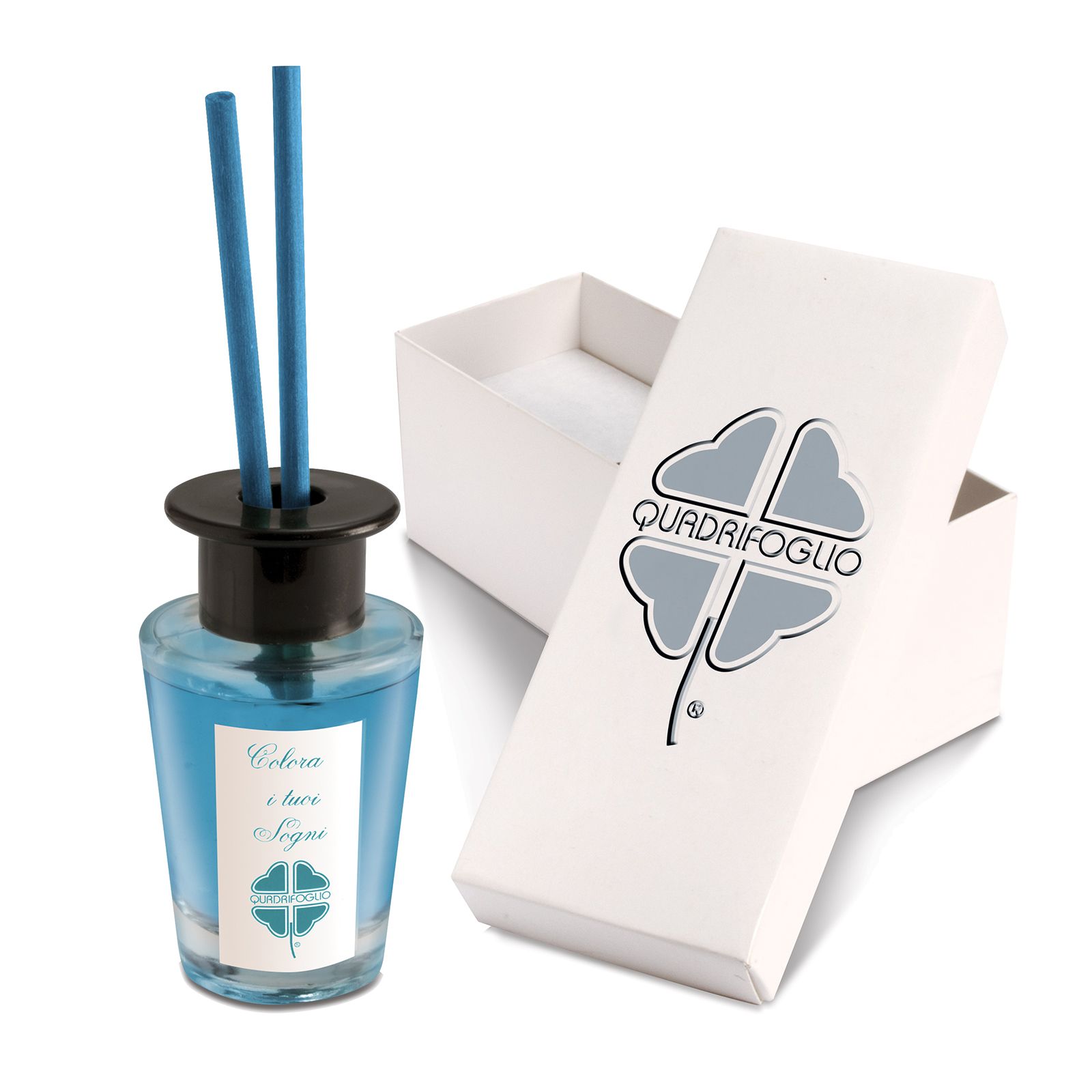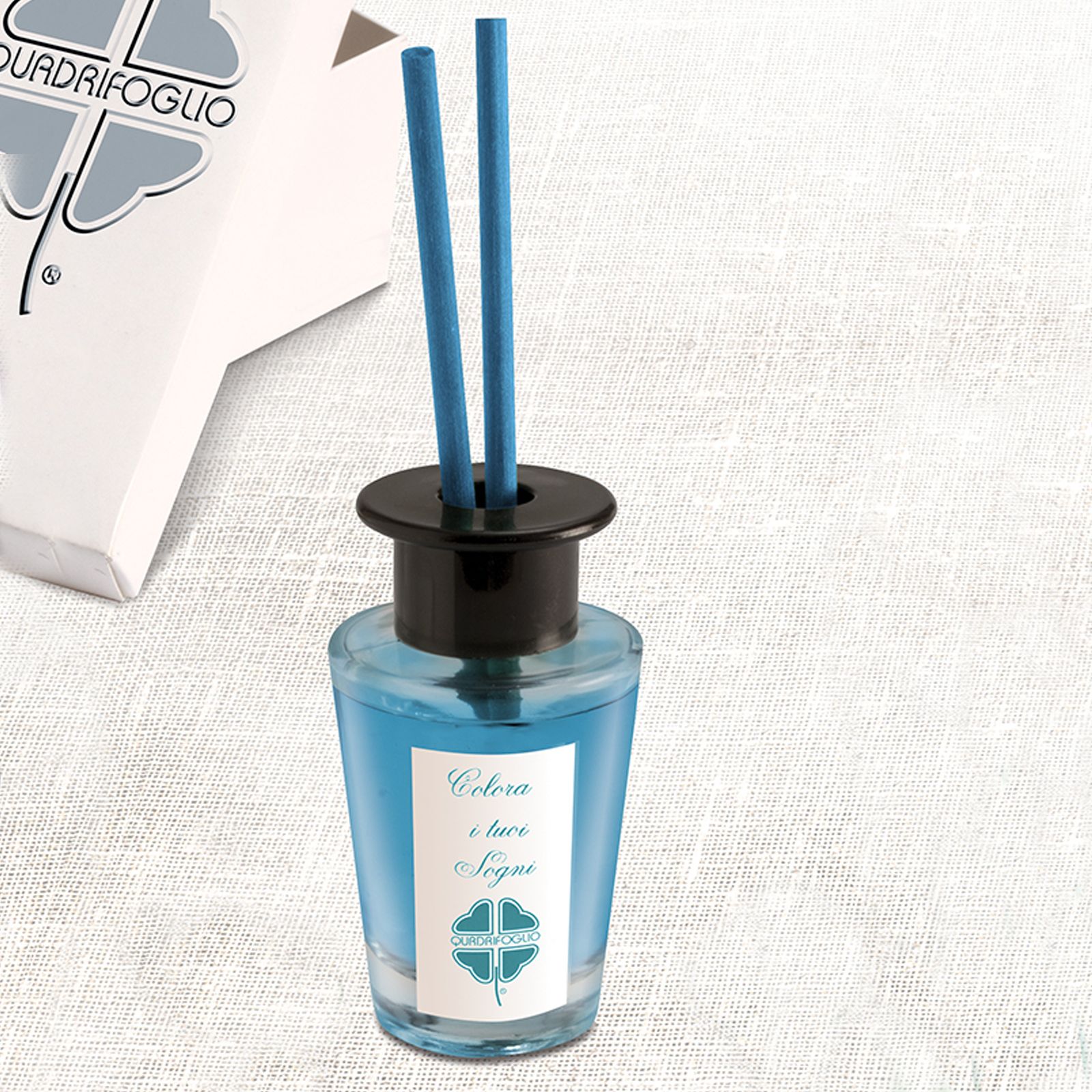 Diffusore di aromi per ambienti di forma cilindrica in vetro con tappo forato in plastica nera, già provvisto di essenza all'interno e bacchette per la diffusione. L'essenza è di colore blu e sulla parte esterna è presente un'etichetta che riporta la frase "Colora i tuoi sogni".