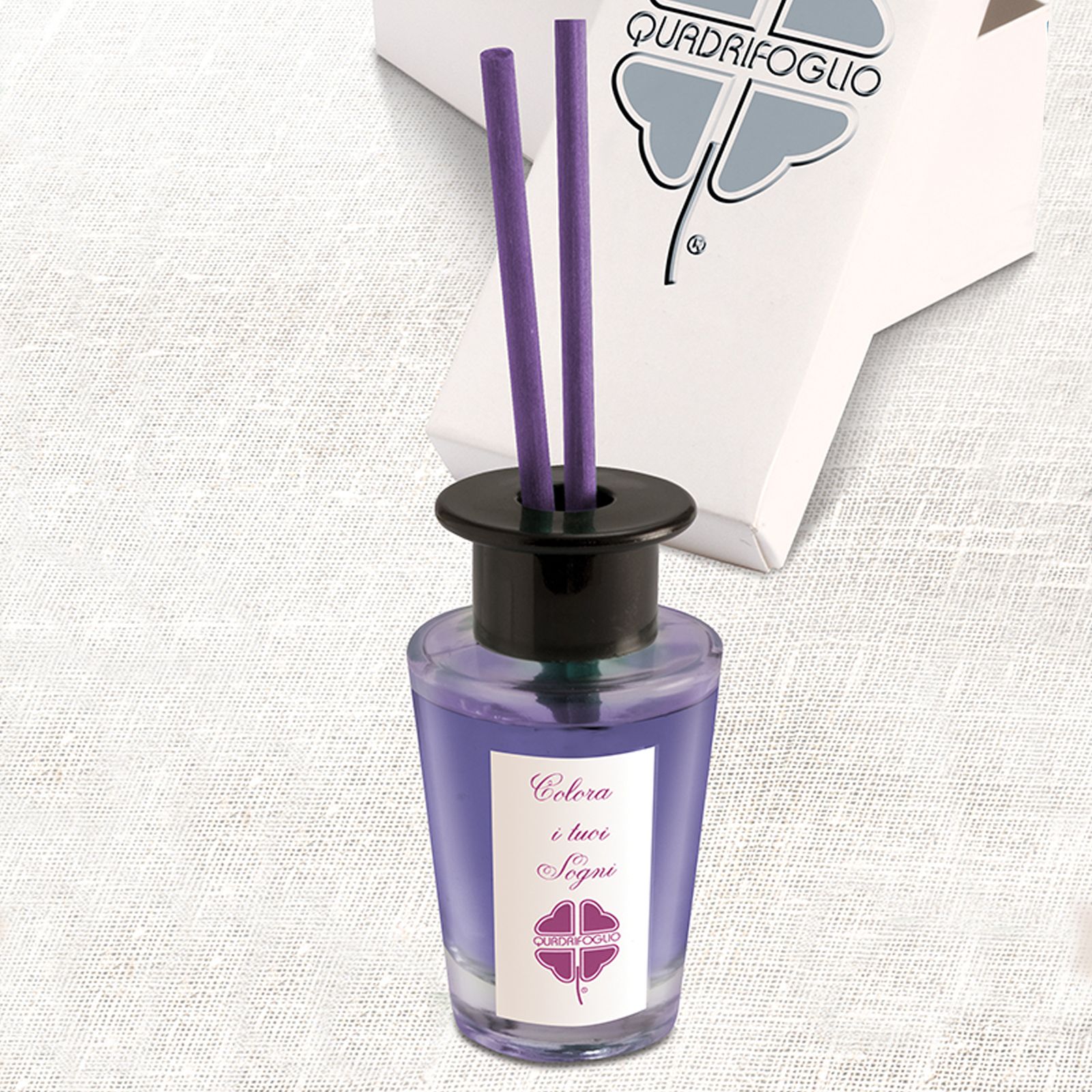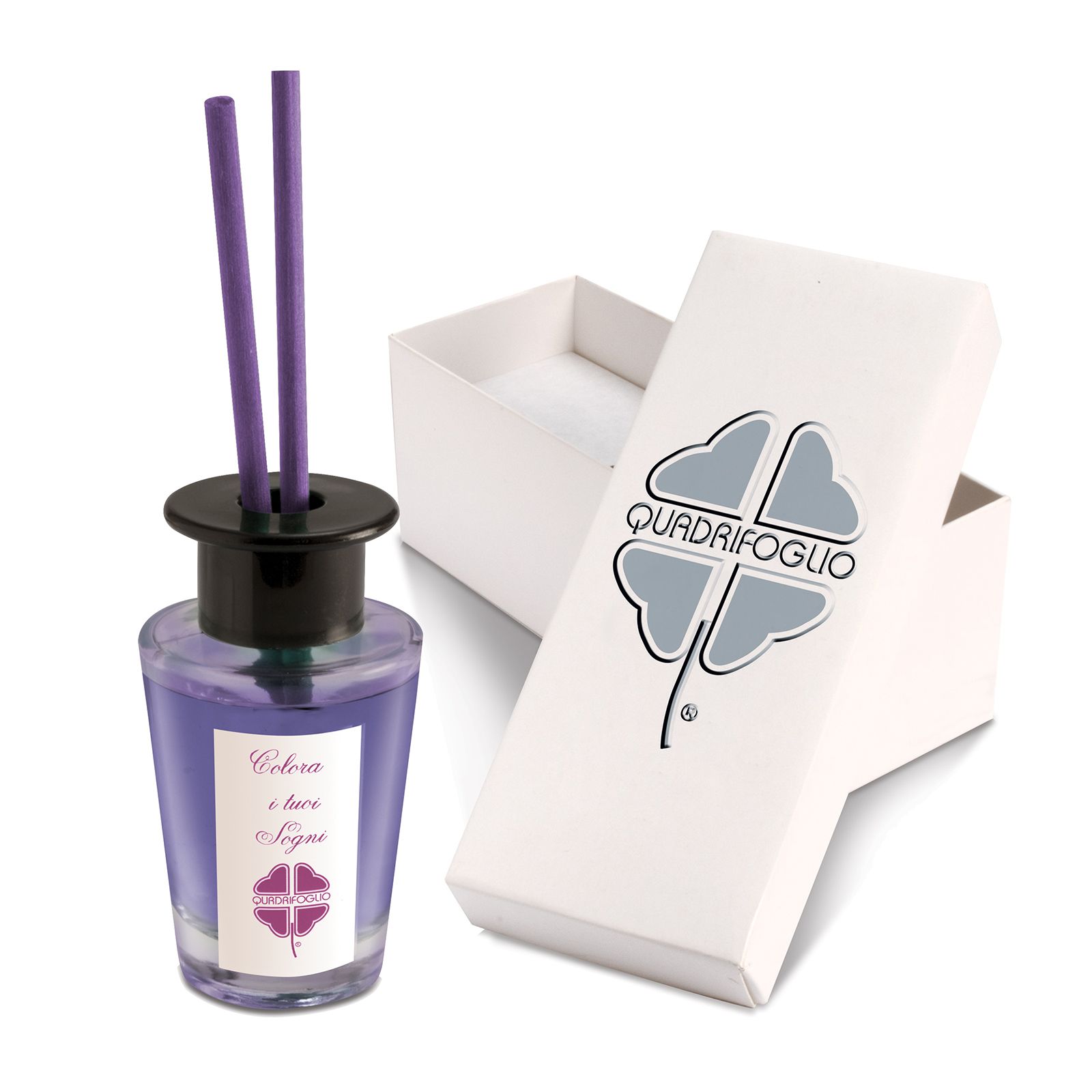 Diffusori per ambiente in vetro trasparente a base cilindrica, con tappo nero forato in plastica e frase “Colora i tuoi sogni” su etichetta bianca. Bastoncini e liquido aromatico color lavanda compresi nel prezzo!