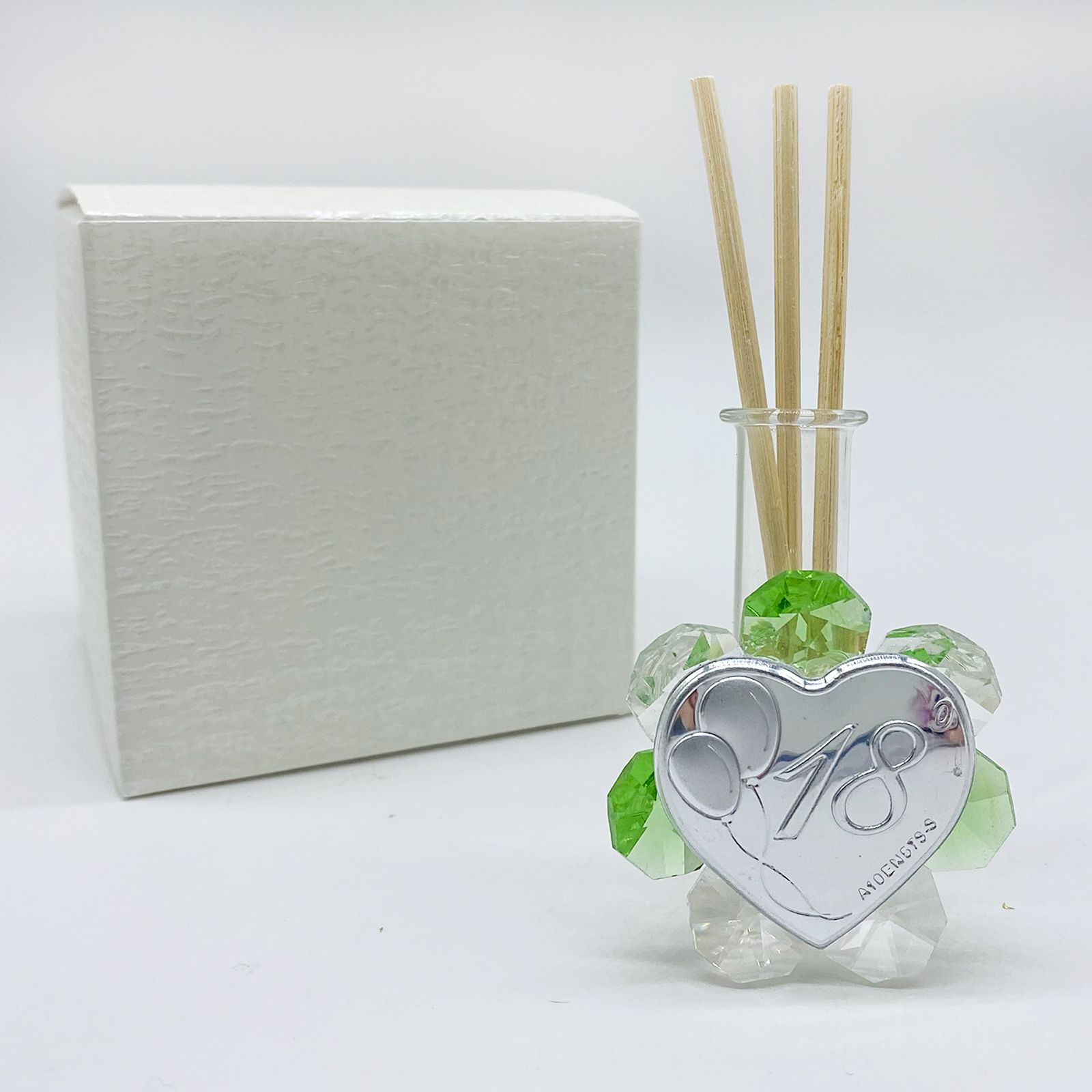 Acquista subito questi diffusori di aromi in vetro e cristallo con un'originale placchetta a forma di cuore in metallo argentato con all'interno un'incisione a sbalzo raffigurante il numero 18 e dei palloncini. Dietro al fiore di cristallo è presente la fiala in vetro trasparente dentro cui versare le essenze profumate.