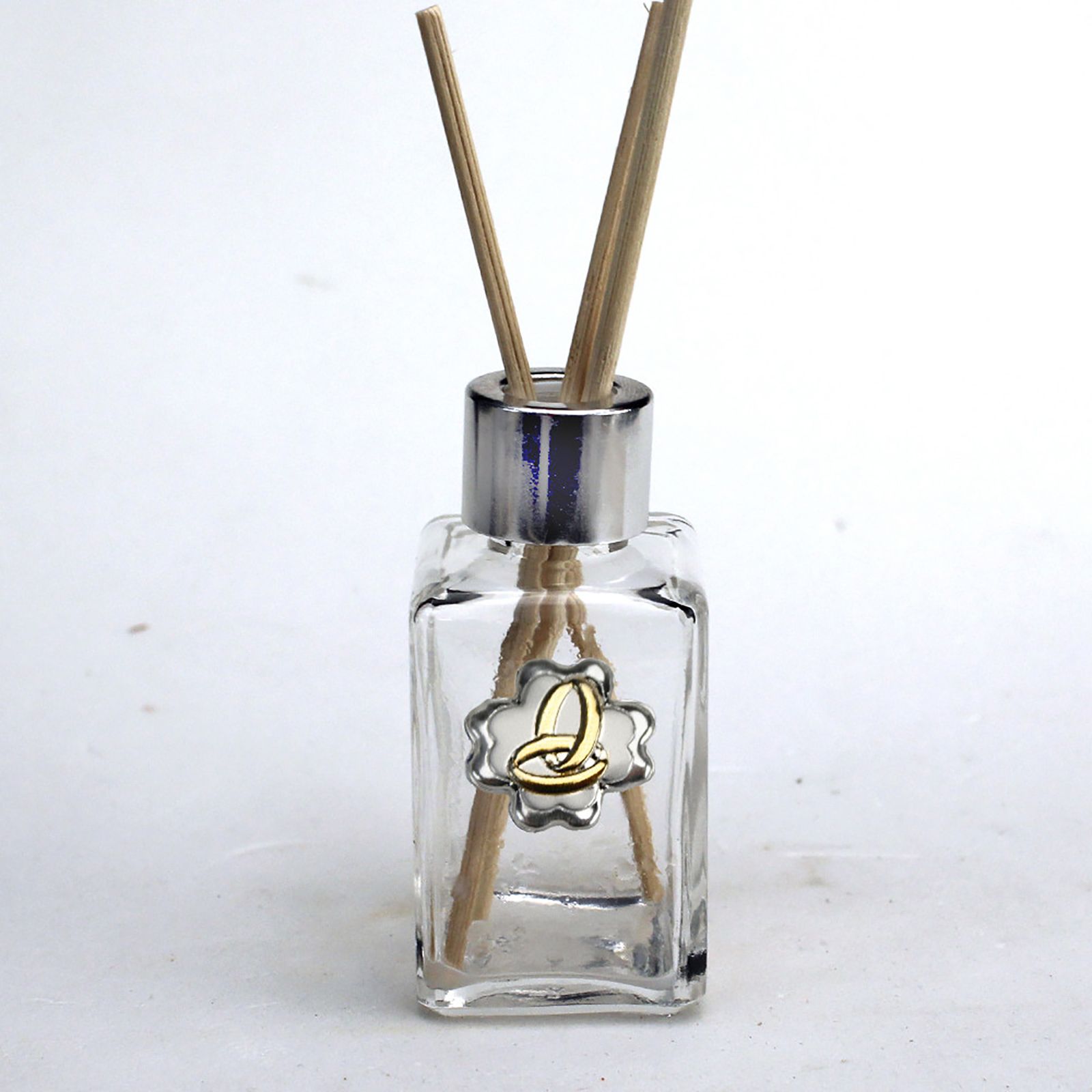 Acquista i nostri profumatori in vetro trasparente che presentano frontalmente una placchetta in finitura argentata a forma di quadrifoglio che racchiude al suo interno un'incisione a sbalzo con raffigurate due fedi intrecciate in colore oro.