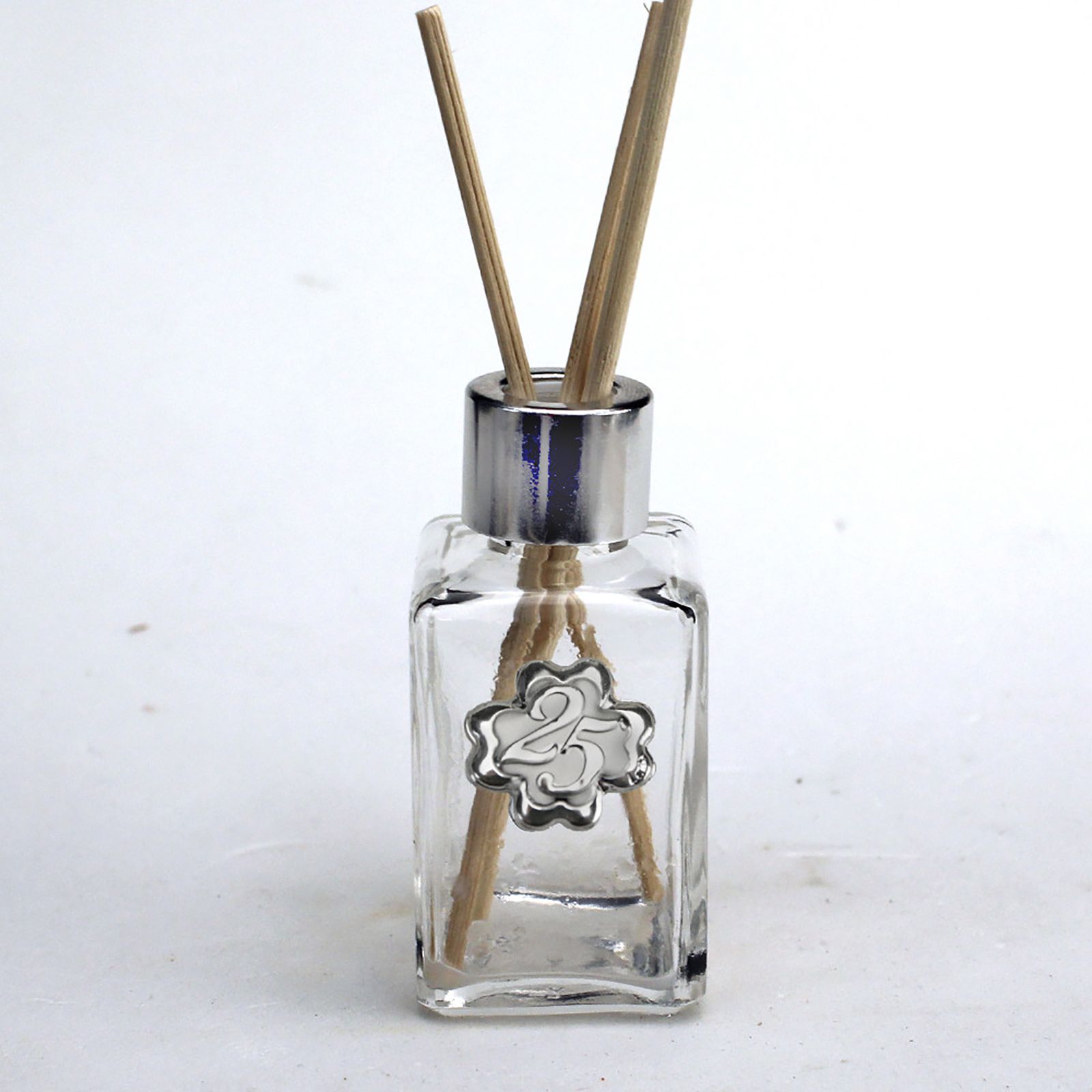 Disponibili sul nostro store questi profumatori per ambienti in vetro trasparente, con tappo forato argentato e placchetta centrale in metallo della stessa tonalità a forma di quadrifoglio, che racchiude all'interno il numero 25 realizzato con incisione a sbalzo.