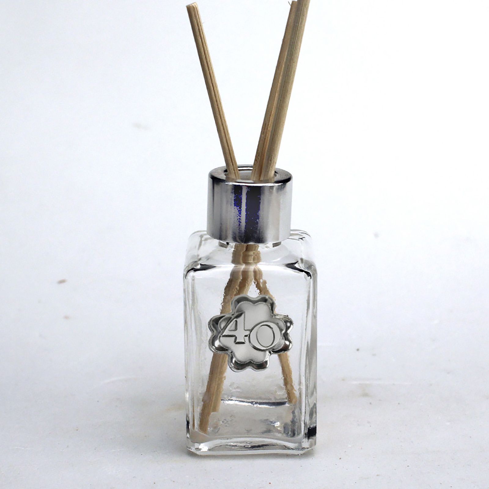 Solo per te disponibili online questi profumatori per ambiente in vetro con tappo e lamina a forma di quadrifoglio argentata che racchiude all'interno un'incisione a sbalzo raffigurante il numero 40.