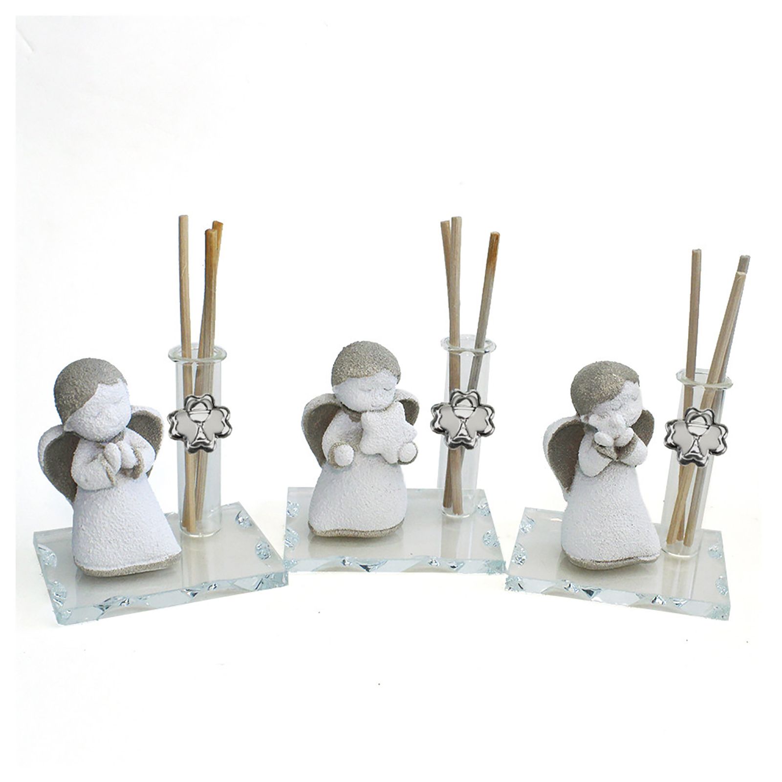 Disponibili per te questi profumatori con base in vetro lavorato, fiala con applicazione in lamina a forma di quadrifoglio con Calice ed Ostia e un piccolo angioletto in resina in 3 varianti assortite (non selezionabili singolarmente).