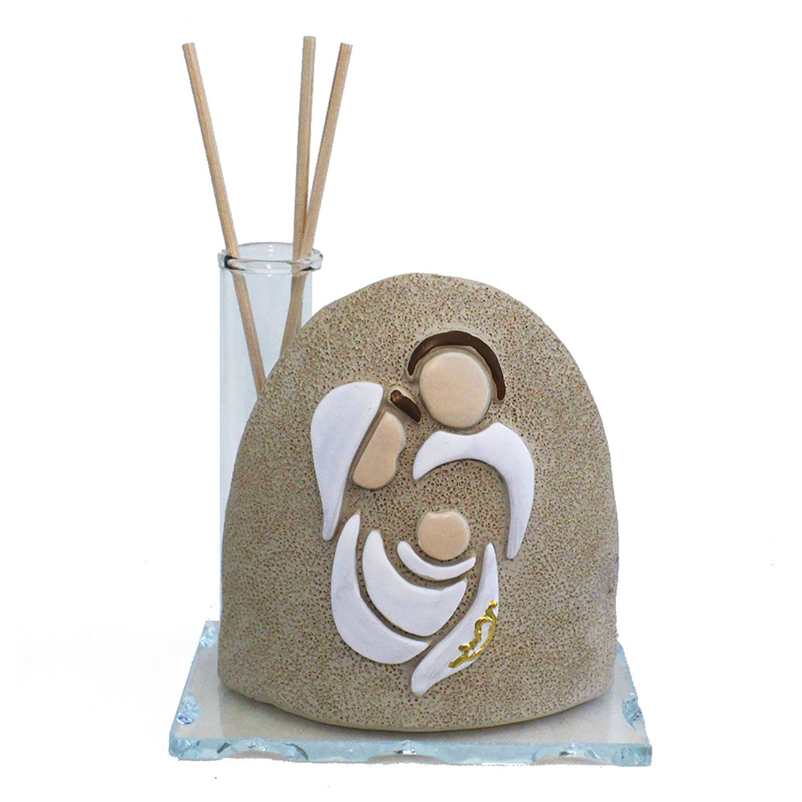 Bomboniere Sacra Famiglia in resina, effetto pietra, con provetta porta profumi ambienti e bastoncini il legno, da utilizzare come diffusori d'essenze. Sul lato frontale del profumatore è raffigurata l'immagine Sacra Famiglia stilizzata, moderna.