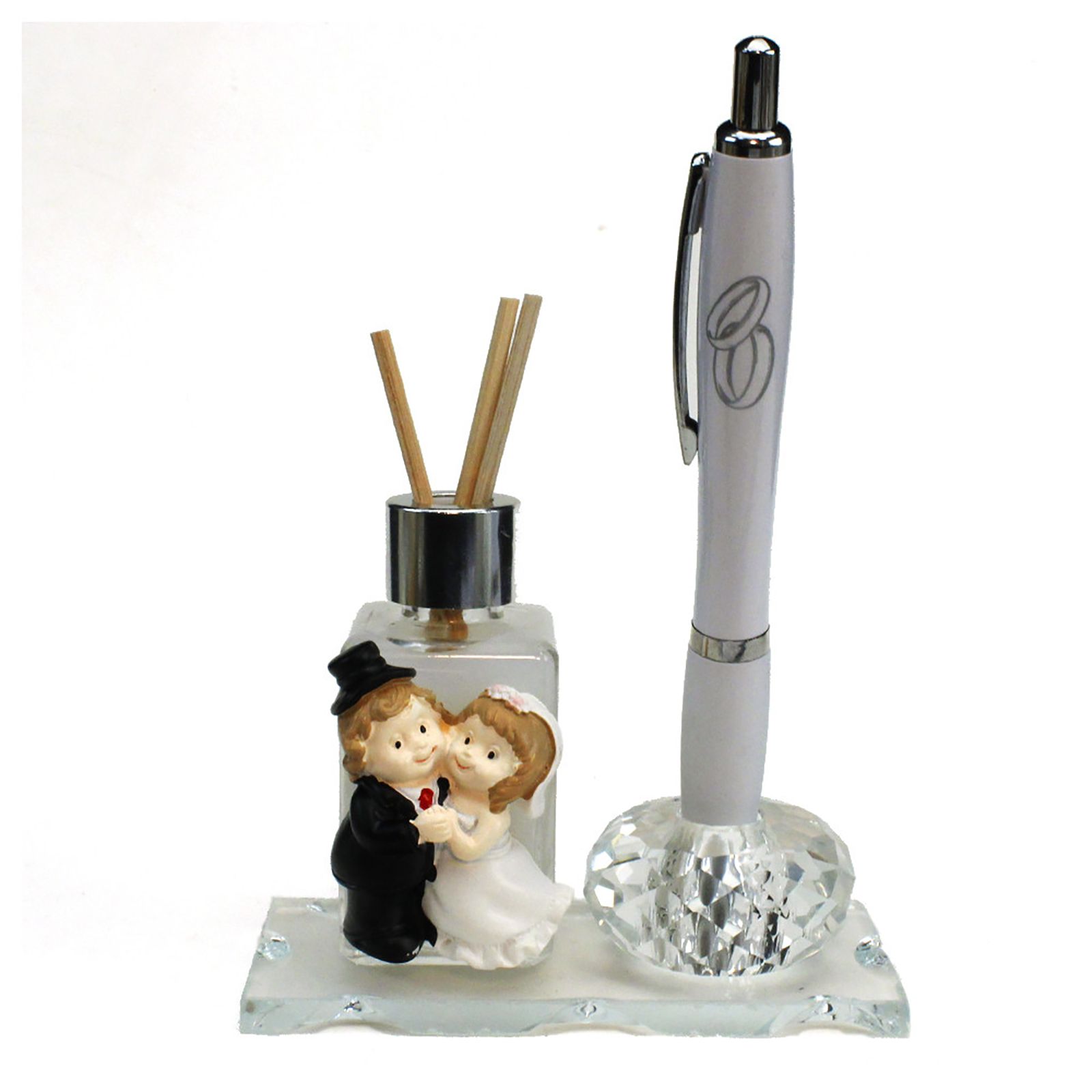 Scegli questi profumatori per ambienti in vetro a flacone con due teneri sposini abbracciati in resina. Sulla base in vetro è applicato un portapenne in cristallo con all'interno già una penna in omaggio per te!
