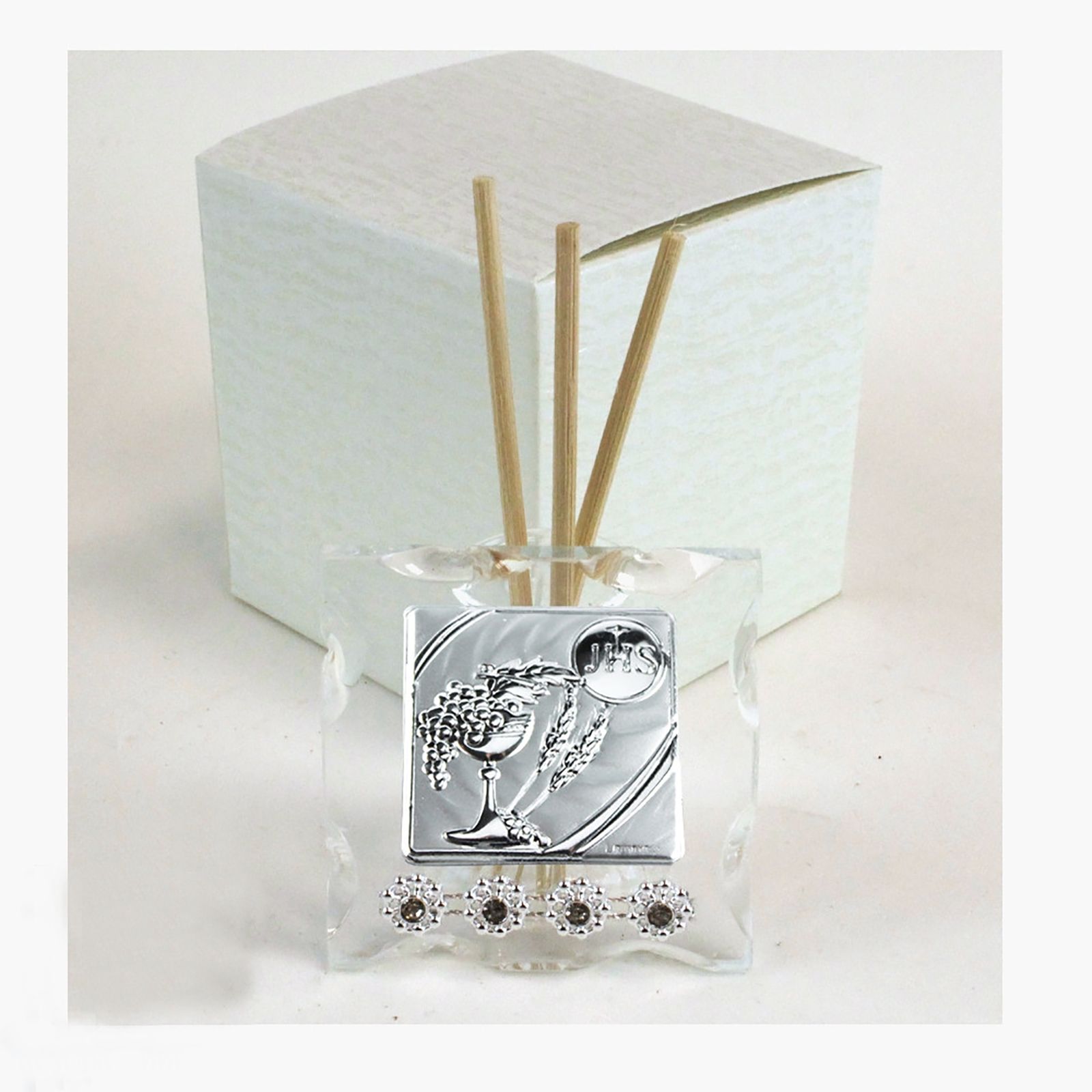 Scegli questi incantevoli profumatori per ambienti in vetro con fiala, che presentano sulla parte frontale una piastrina in lamina argentata con incisione a sbalzo raffigurante calice, spighe di grano e uva, tre simboli della Comunione. Sotto la lamina sono presenti 4 strass brillanti.