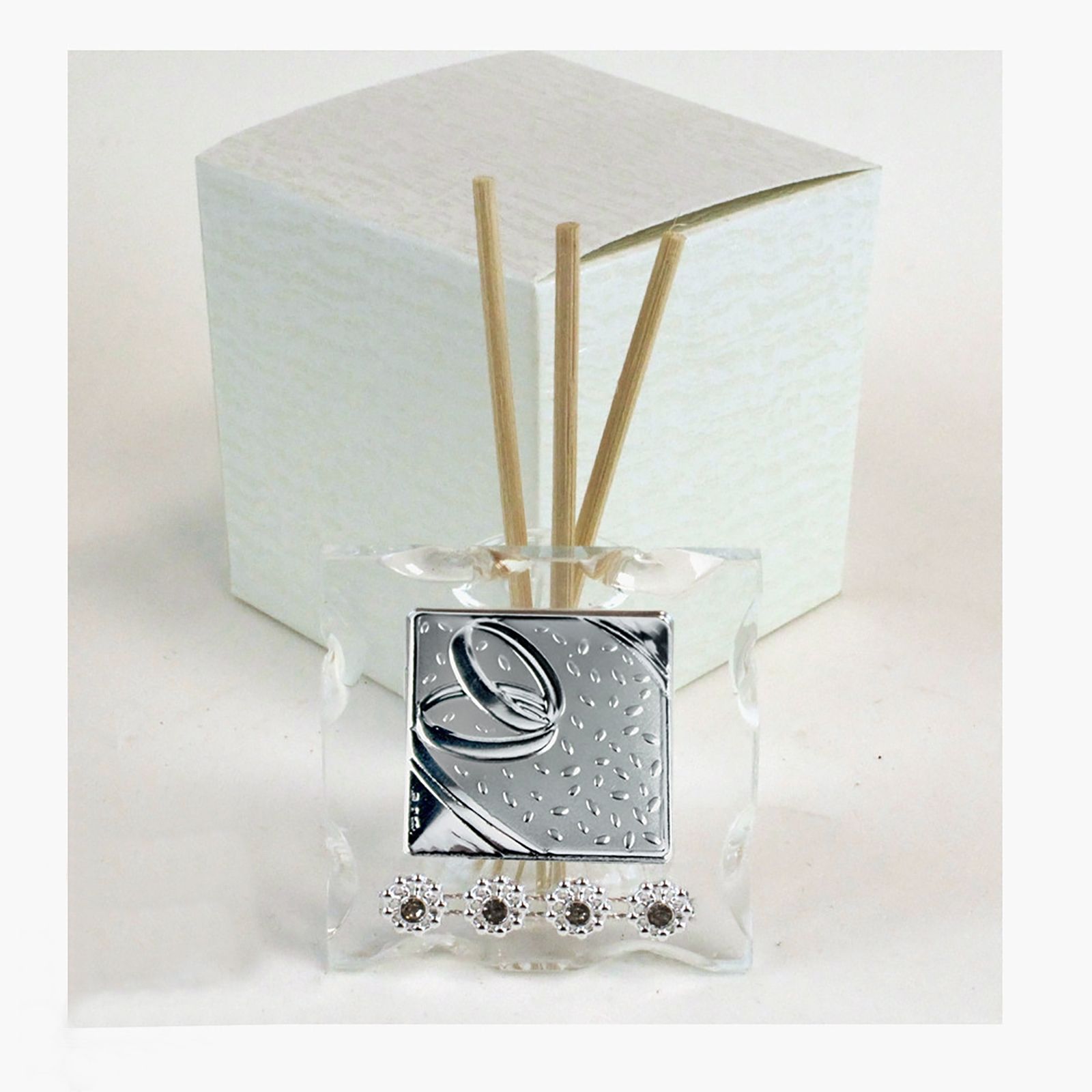 Diffusori di essenze in vetro lavorato con fiala e placca in lamina argentata raffigurante due fedi intrecciate con piccoli chicchi di riso sullo sfondo. Sulla base in vetro inoltre sono applicati 4 piccoli e brillantissimi strass.