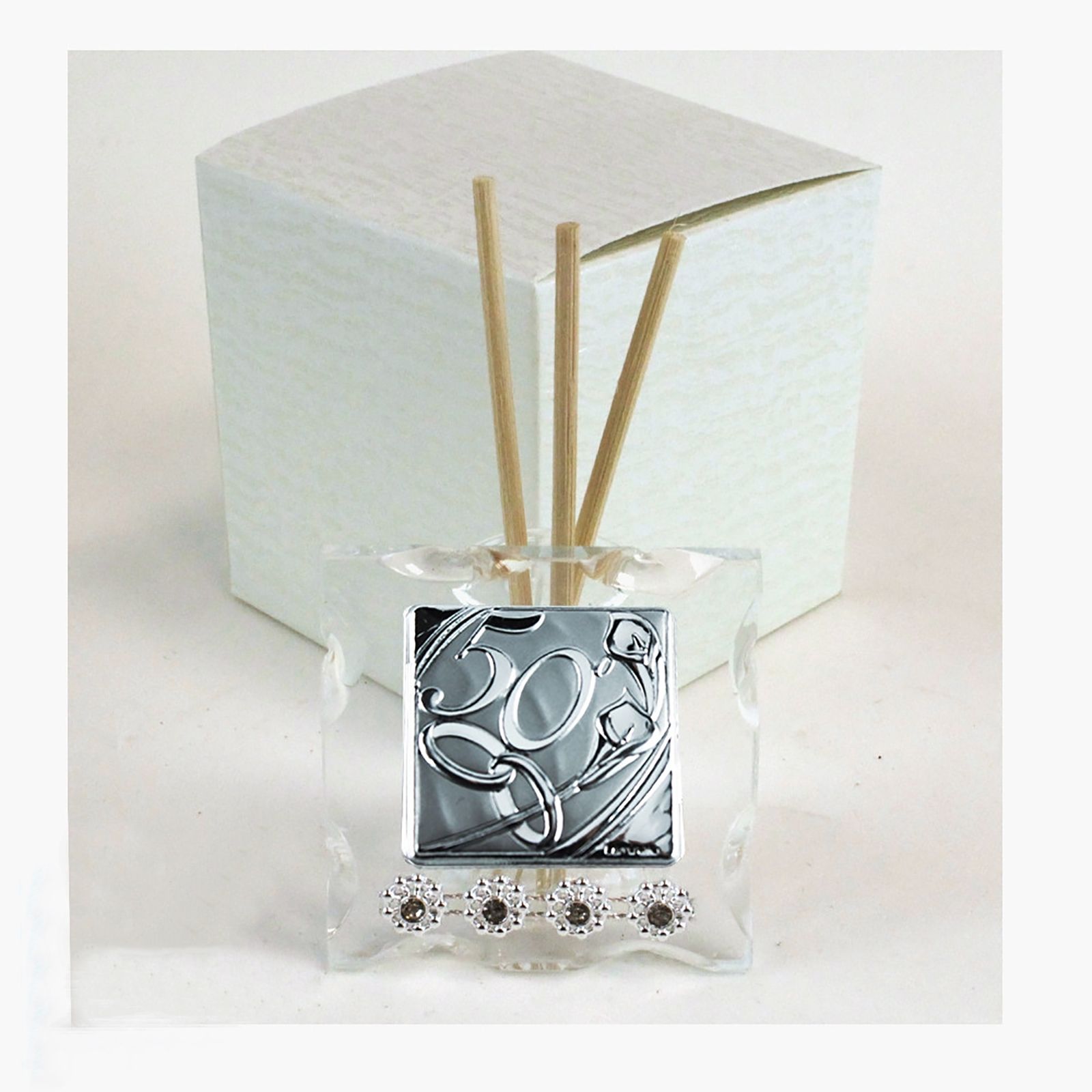 Acquista online i nostri profumatori a fiala in vetro, che riportano frontalmente una piastrina in lamina con incisione a sbalzo il numero 50, due fedi intrecciate e delle calle. Nella parte inferiore, il diffusore per ambienti è decorato con 4 brillantissimi strass.