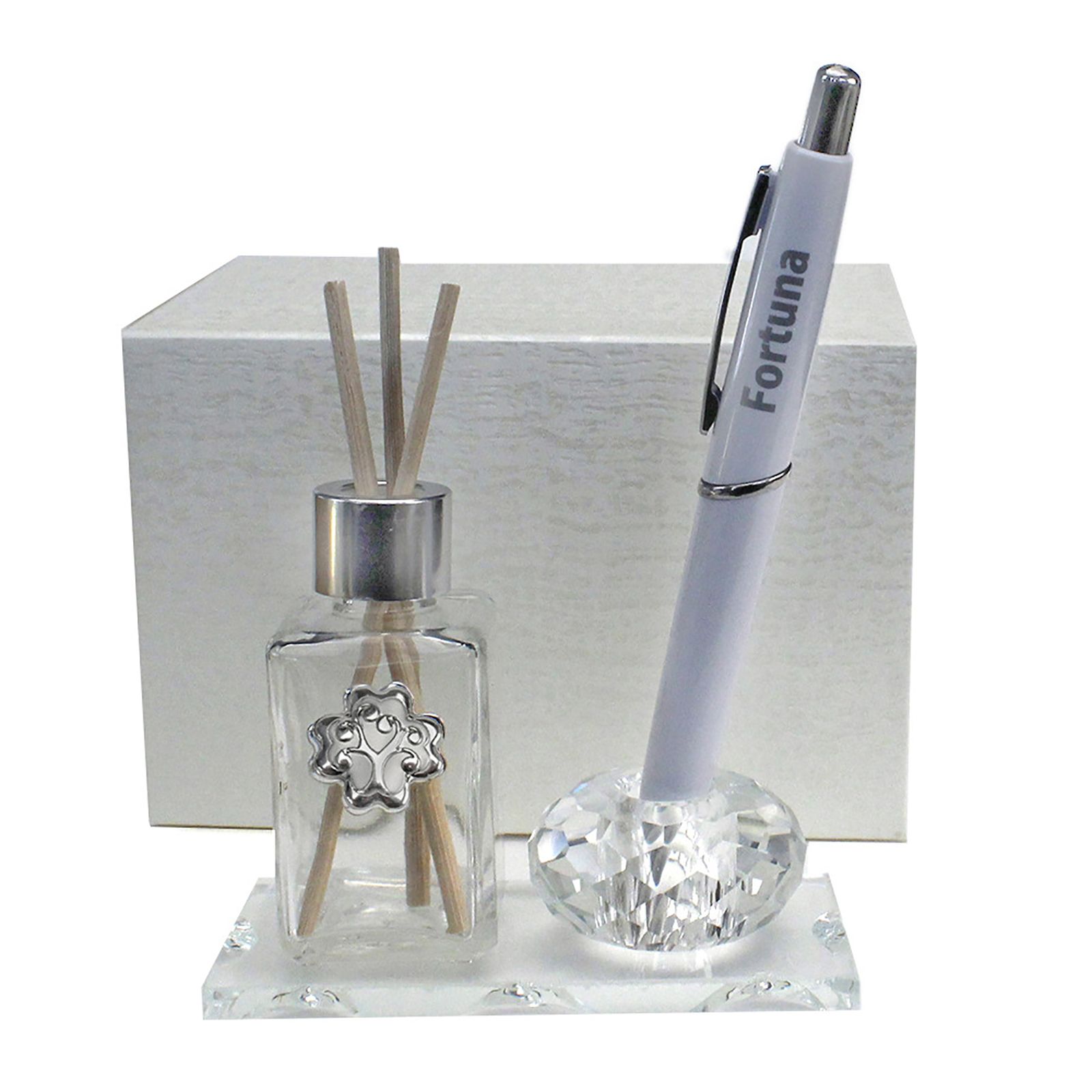 Come i nostri profumatori per ambienti in vetro con base lavorata, flacone cilindrico con placchetta argentata a forma di quadrifoglio con incisione a sbalzo raffigurante l'albero della vita. Accanto al flacone è presente un piccolo portapenne in cristallo lavorato con già all'interno una penna a sfera in omaggio per te! (Le penne a sfera saranno assortite in quattro varianti, con riportate le espressioni: Fortuna, Salute, Amore, Ricchezza.