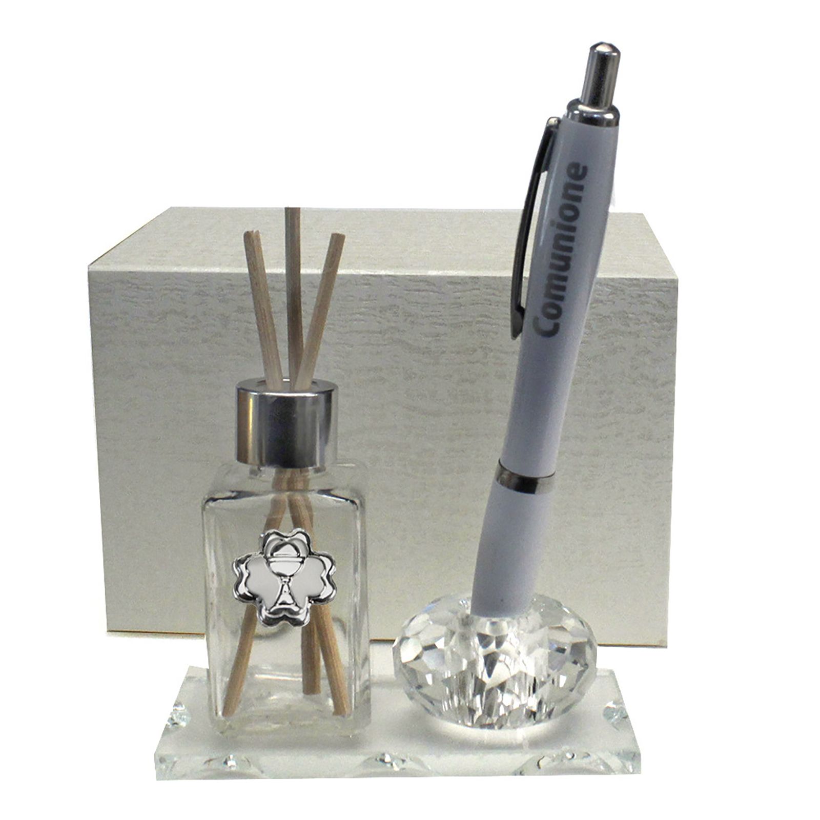 Disponibili per te questi profumatori per ambiente con base e flaconcino in vetro, su cui è presente una placchetta in lamina a forma di quadrifoglio, con all'interno un'incisione a sbalzo raffigurante il calice con l'ostia. Accanto alla bottiglietta, si trova un portapenne in cristallo all'interno del quale è già presente una penna a sfera con la scritta "Comunione" che troverai fornita in omaggio.