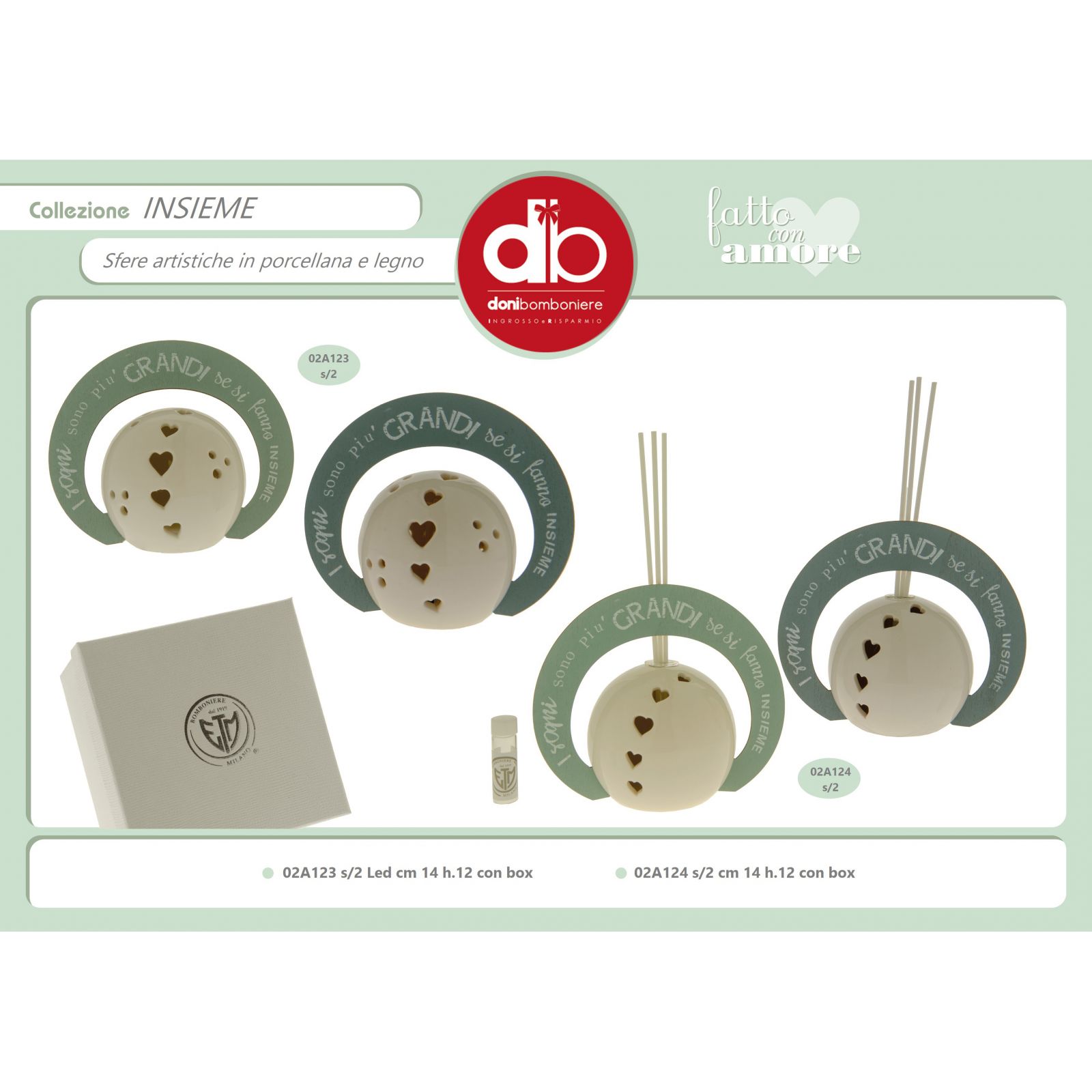 Eleganti diffusori di aromi in porcellana bianca effetto lucido a forma di sfera con trafori a forma di cuore che percorrono il profumatore in tutta la sua lunghezza. Nella parte superiore è presente il foro all'interno del quale è inserita la provetta in vetro per le essenze. Tutto l'oggetto è poi percorso da un arco in legno naturale su cui sono impressa la frase: "I sogni sono più grandi se si fanno insieme".