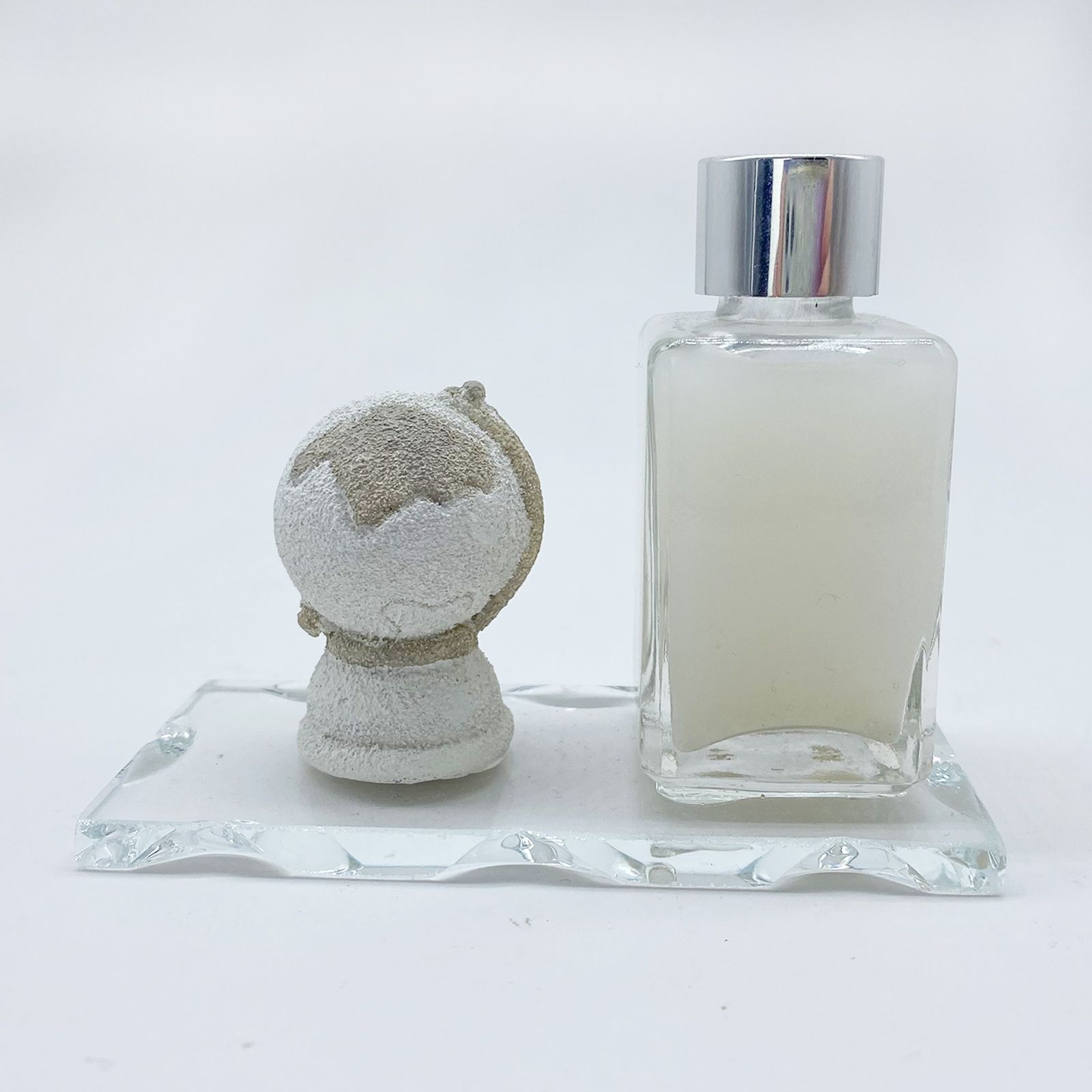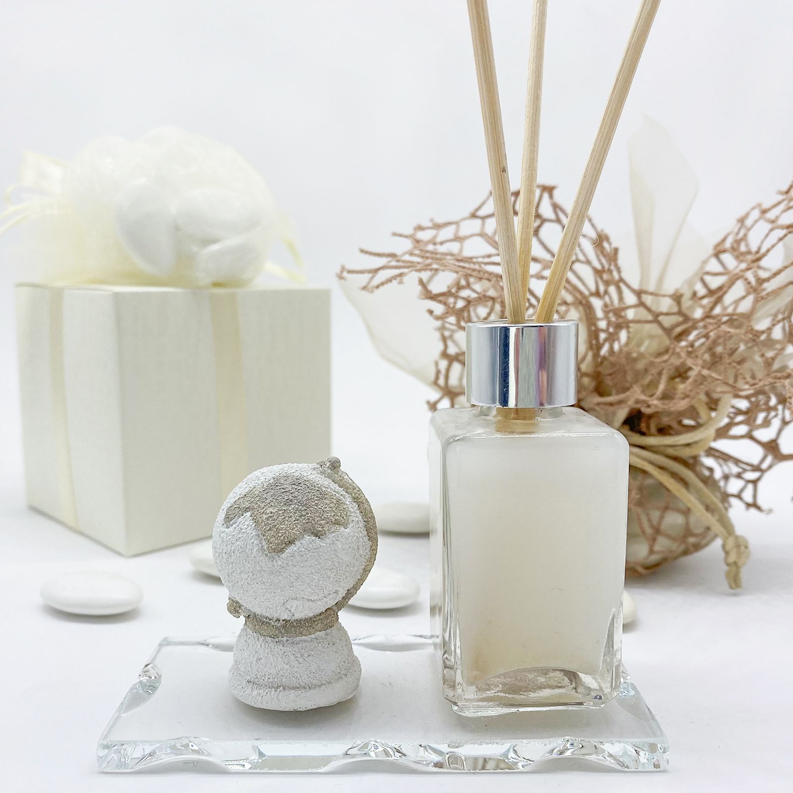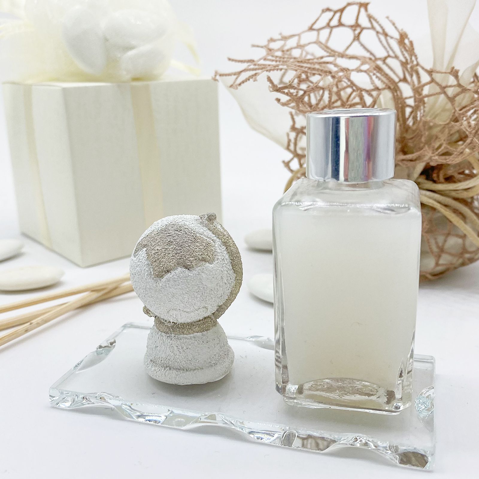 Profumatori per ambiente con base in vetro a lavorazione cristallo e statuina a forma di piccolo mappamondo in resina effetto biscuit color crema con dettagli tortora.
