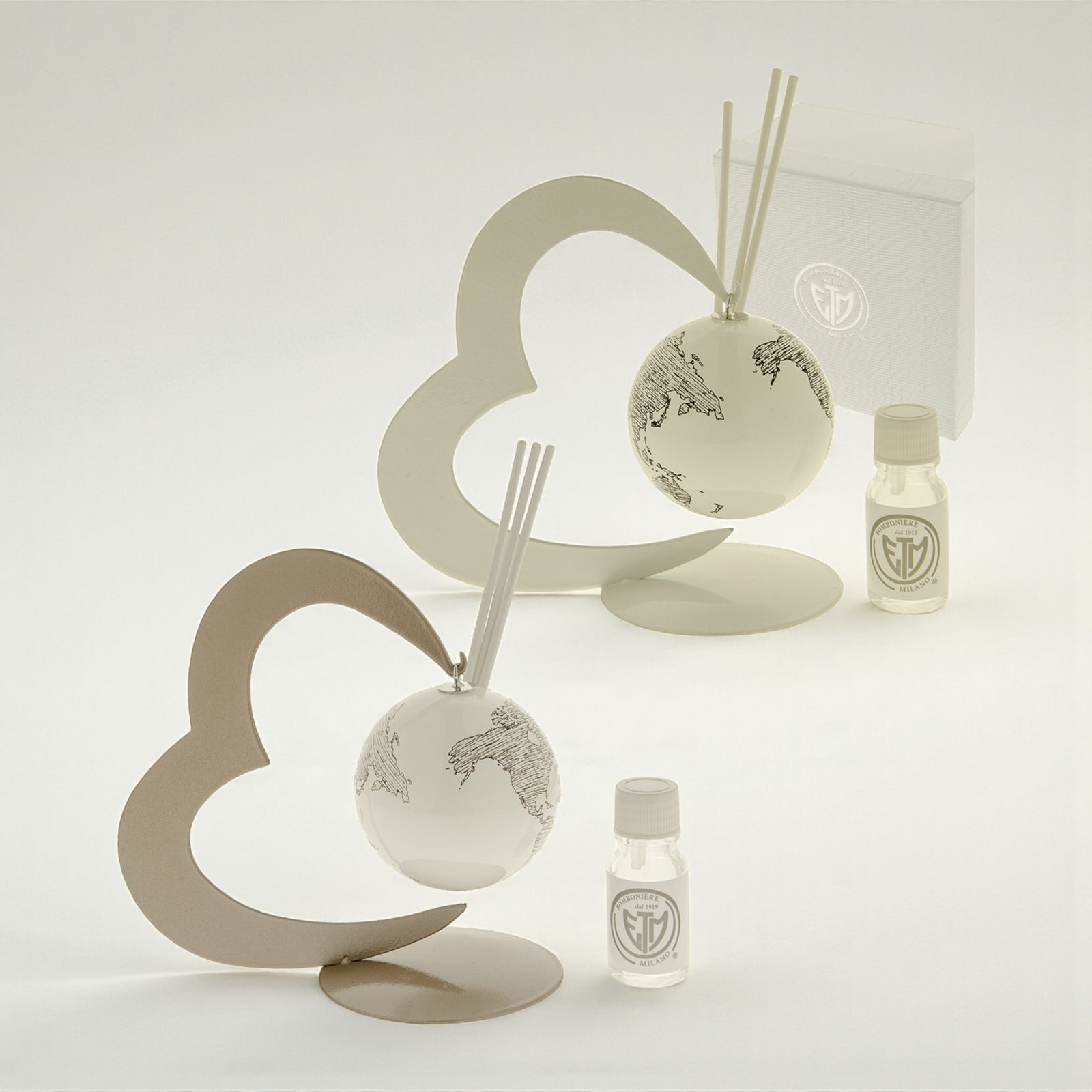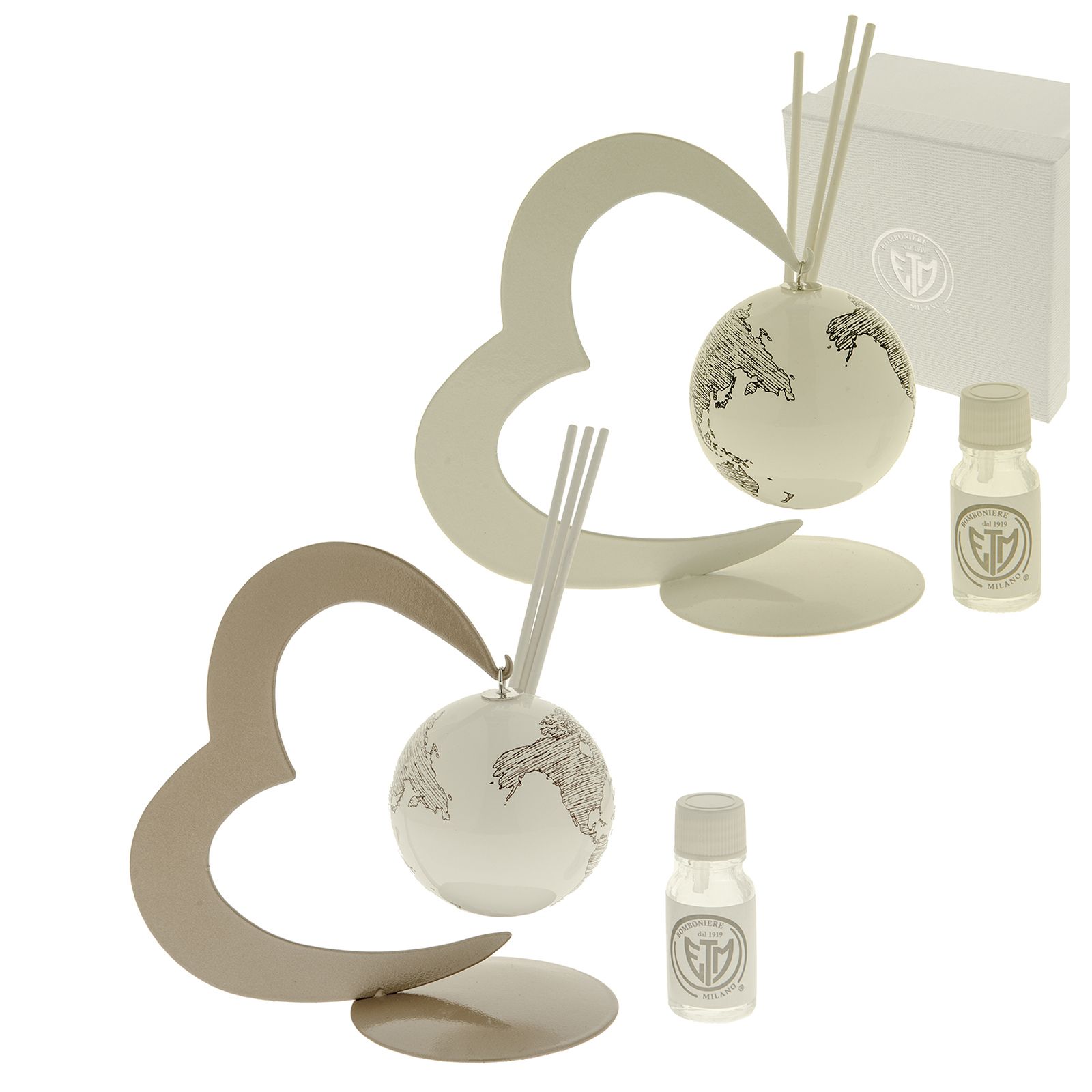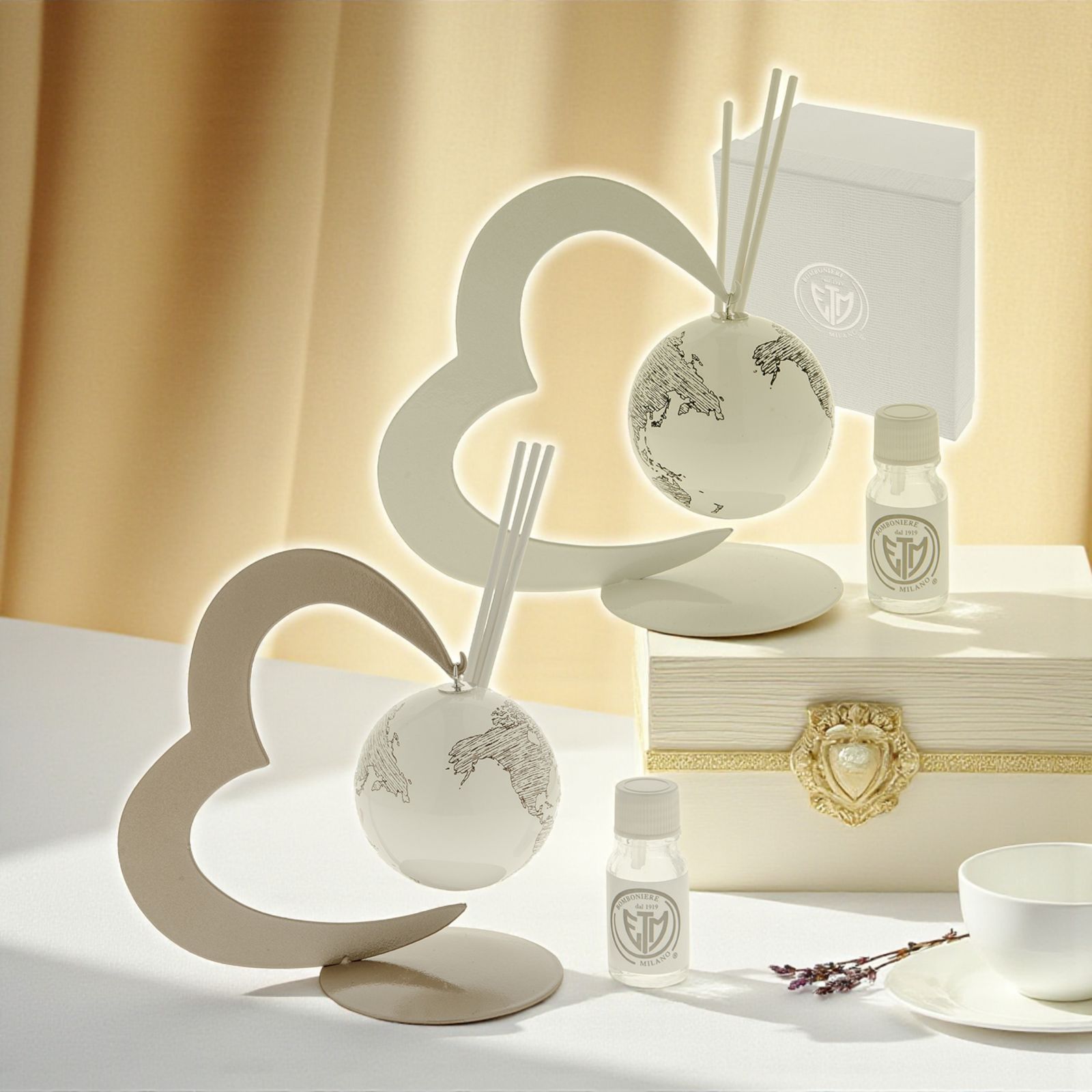 Disponibili per te questi eleganti profumatori per ambienti a forma di mappamondo in vetro, con supporto in metallo in due varianti assortite: color tortora e bianco.