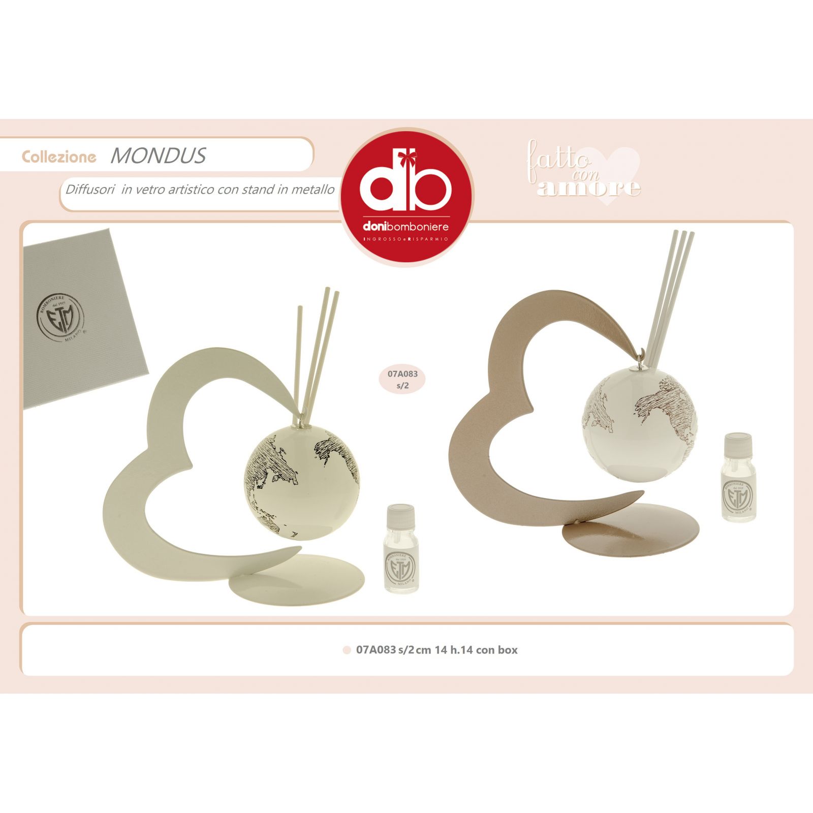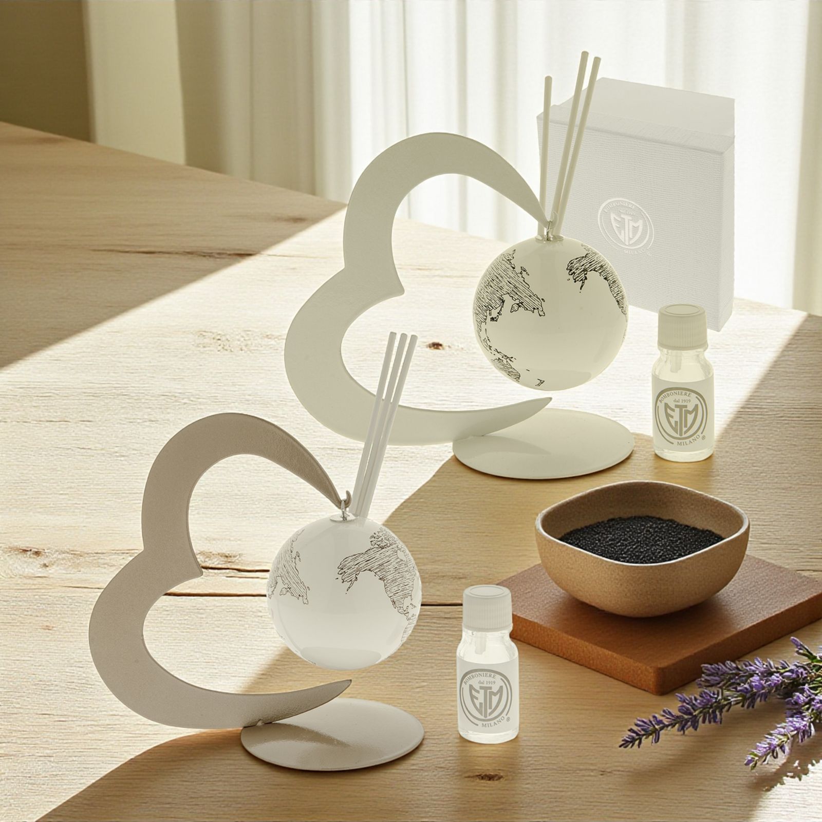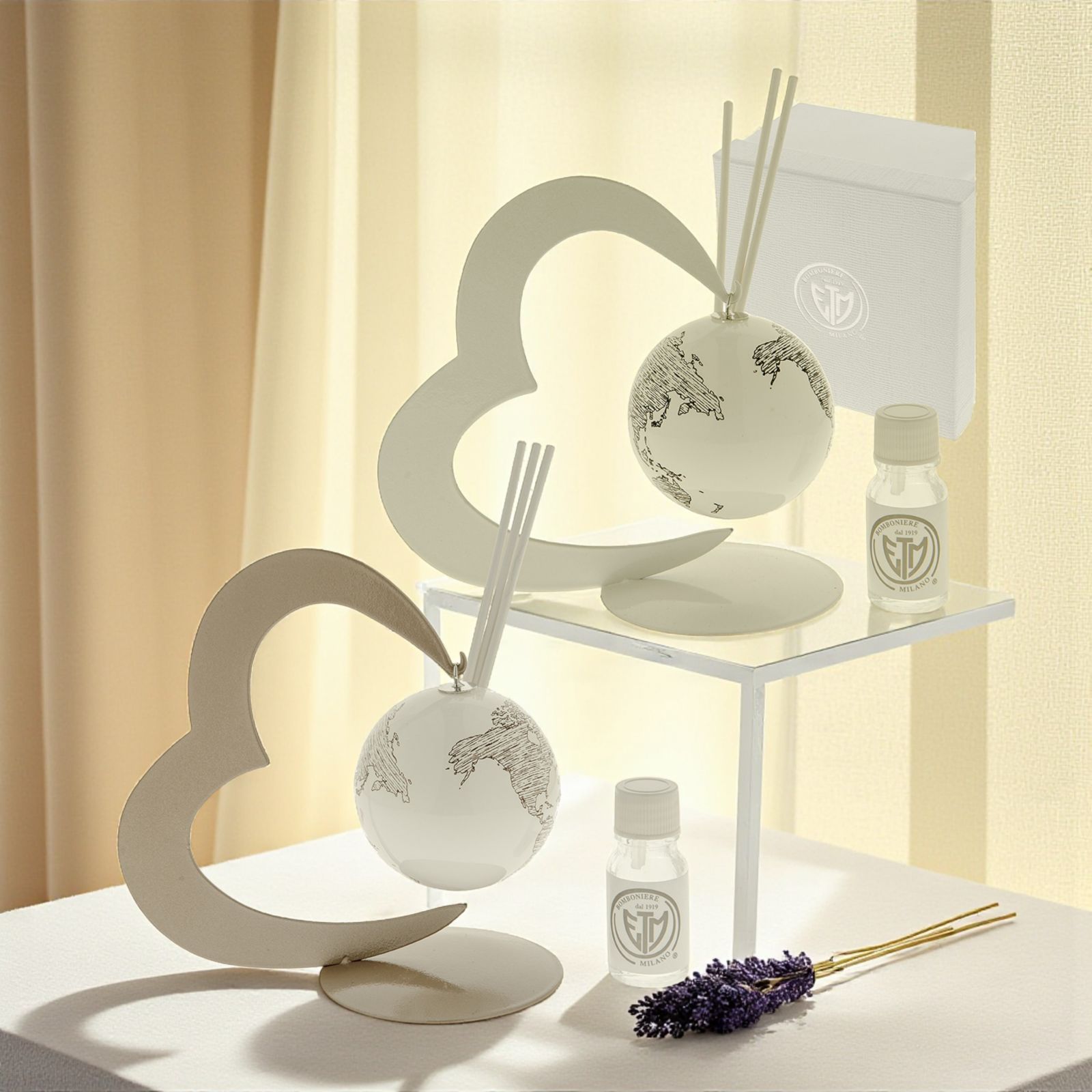 Disponibili per te questi eleganti profumatori per ambienti a forma di mappamondo in vetro, con supporto in metallo in due varianti assortite: color tortora e bianco.