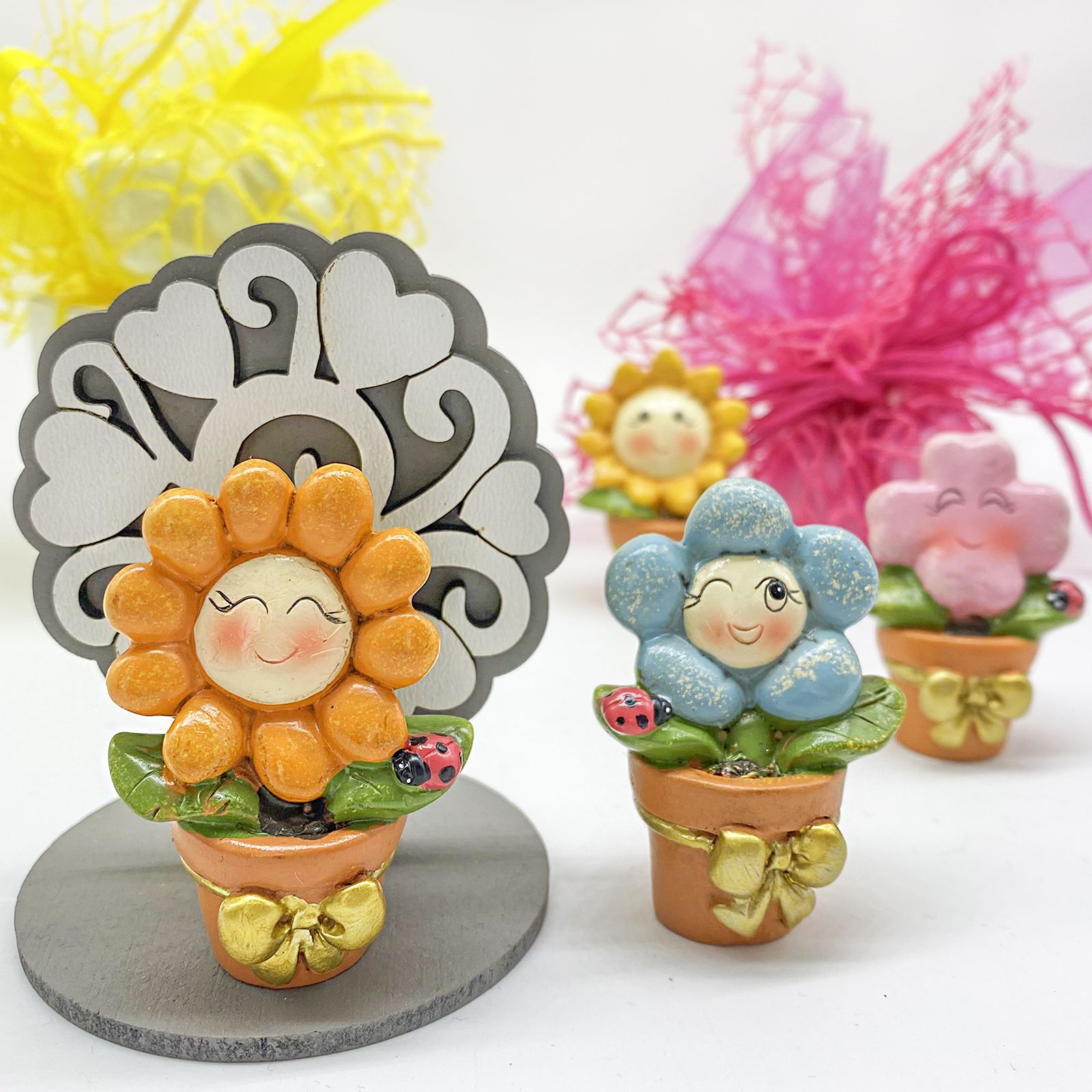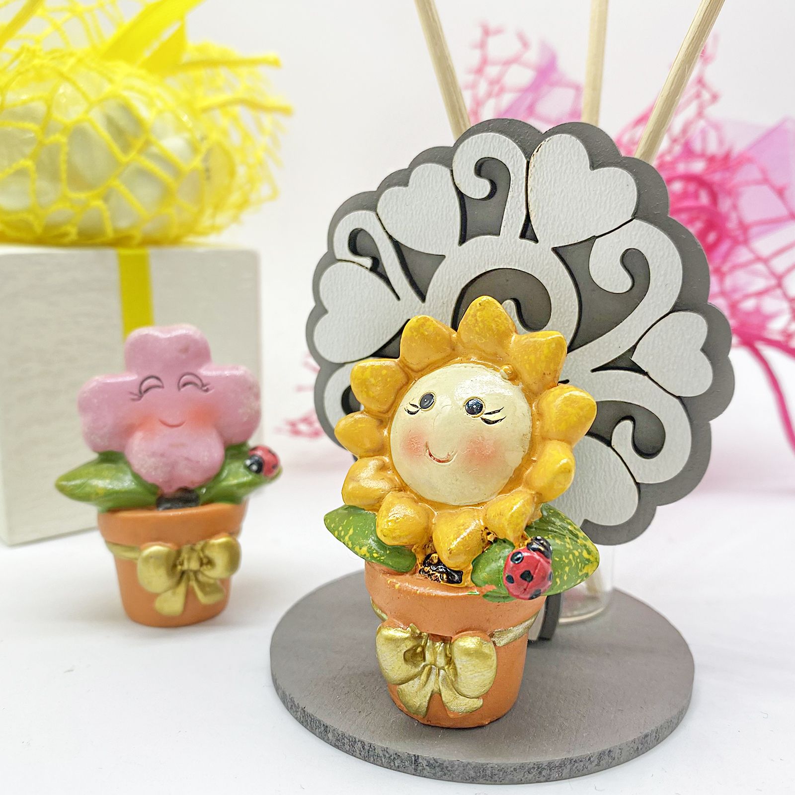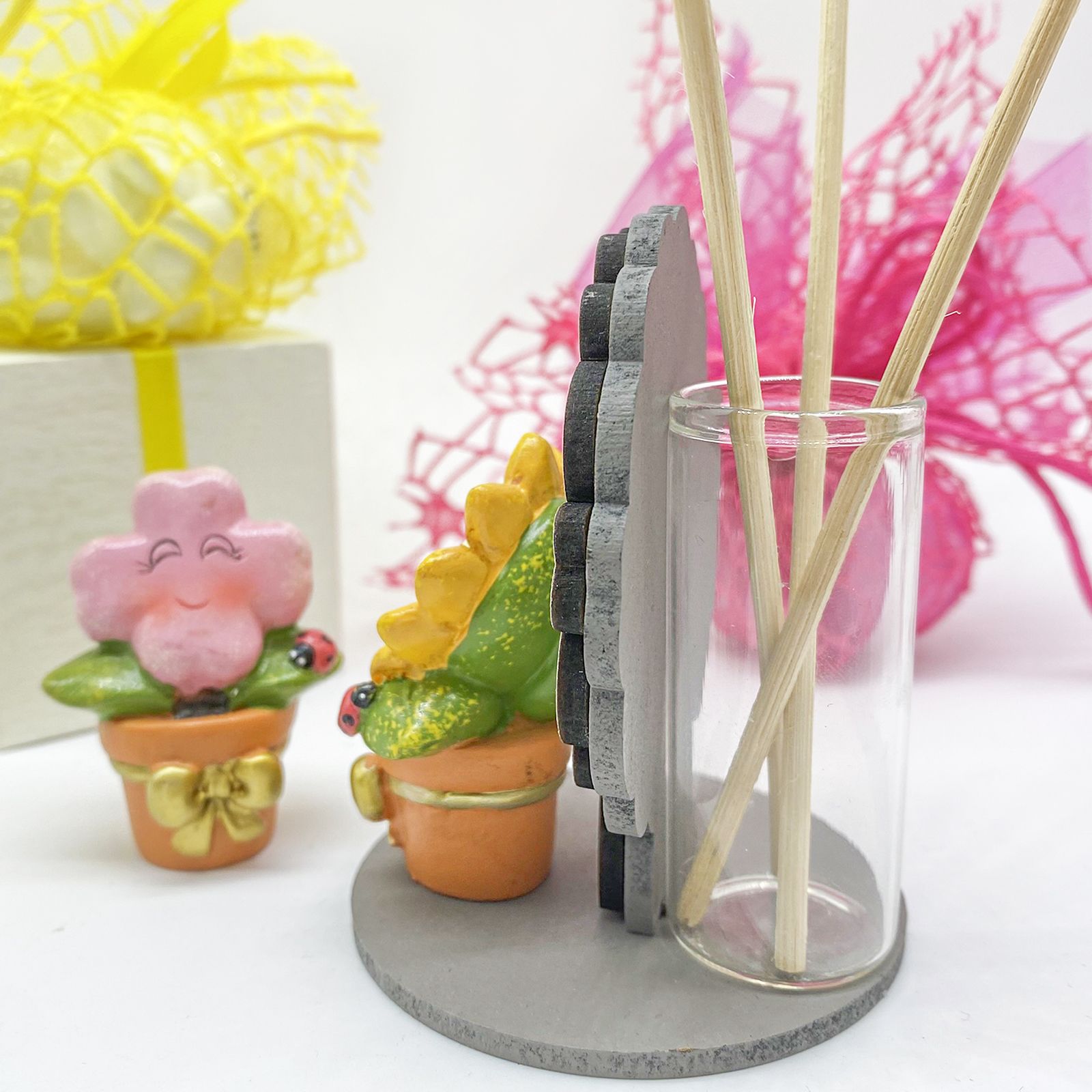 Profumatore per ambienti a fiala con albero della vita color tortora e bianco e frontalmente dei simpatici vasi con fiore in resina in 4 varianti assortite, diverse per colori e modello.