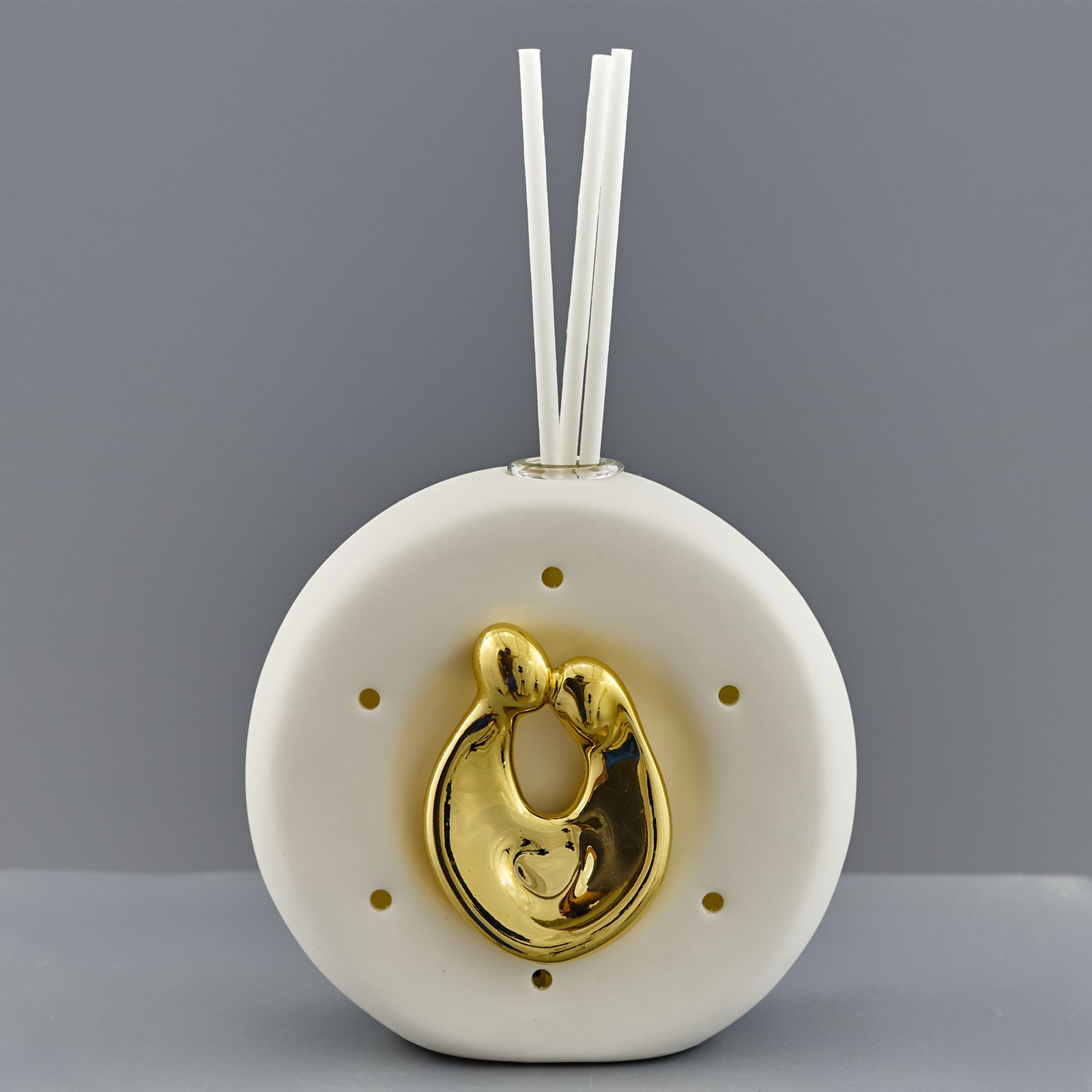 Acquista questi eleganti profumatori per ambienti di forma circolare, bianchi, con all'interno una raffigurazione stilizzata della sacra famiglia in color oro.