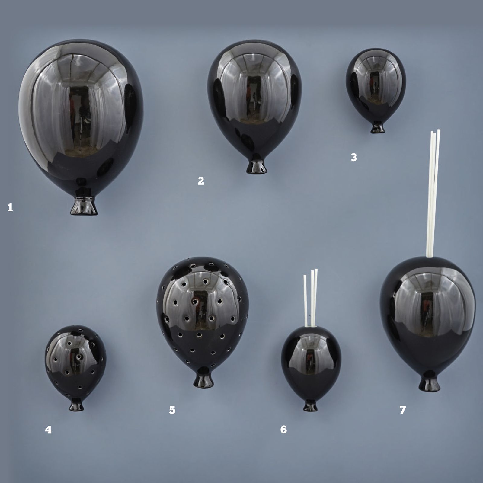 Abbiamo scelto per te i nostri palloncini da muro in porcellana, di colore nero, selezionabili in tre modelli e con dimensioni diverse: ornamentali, con profumatore o con luce led!