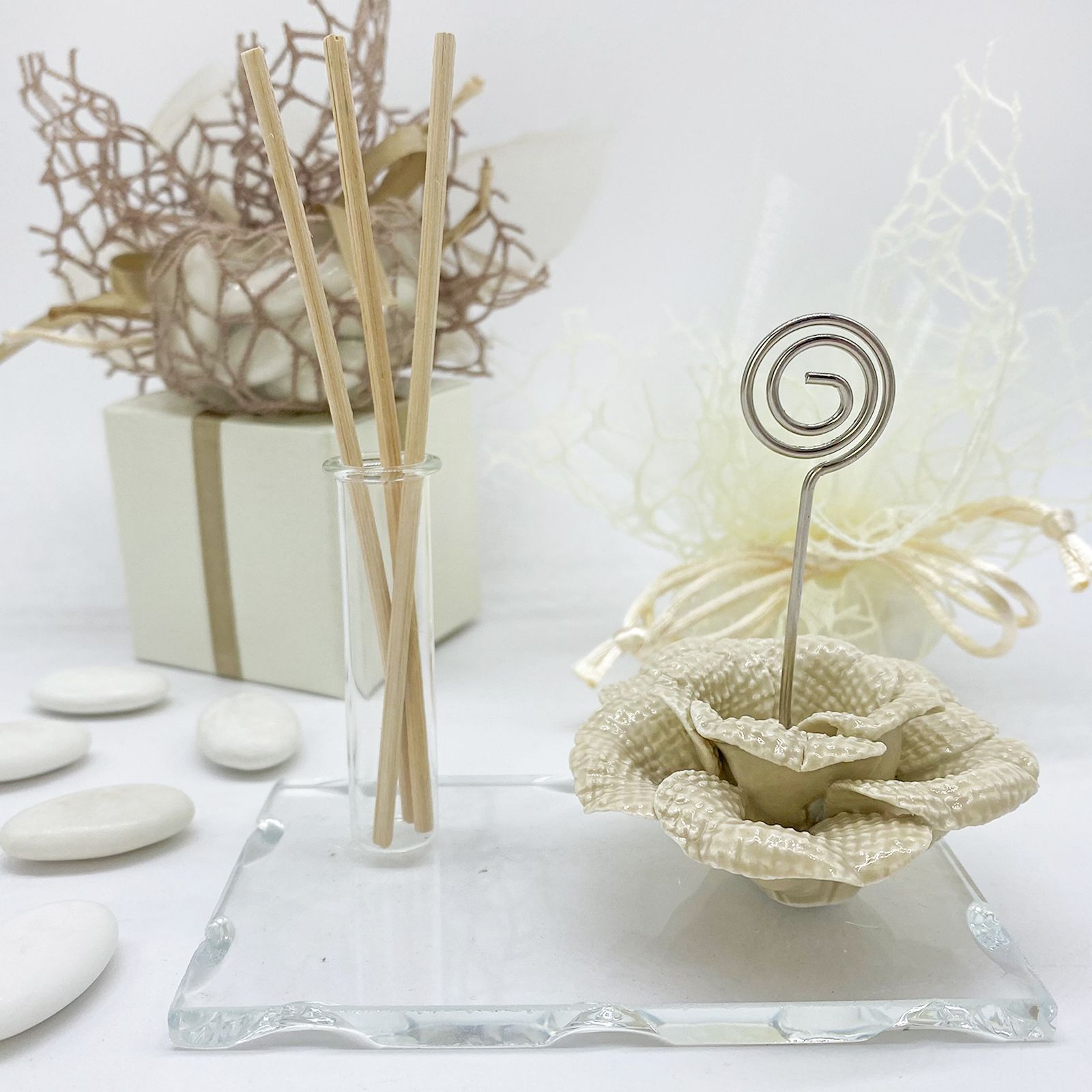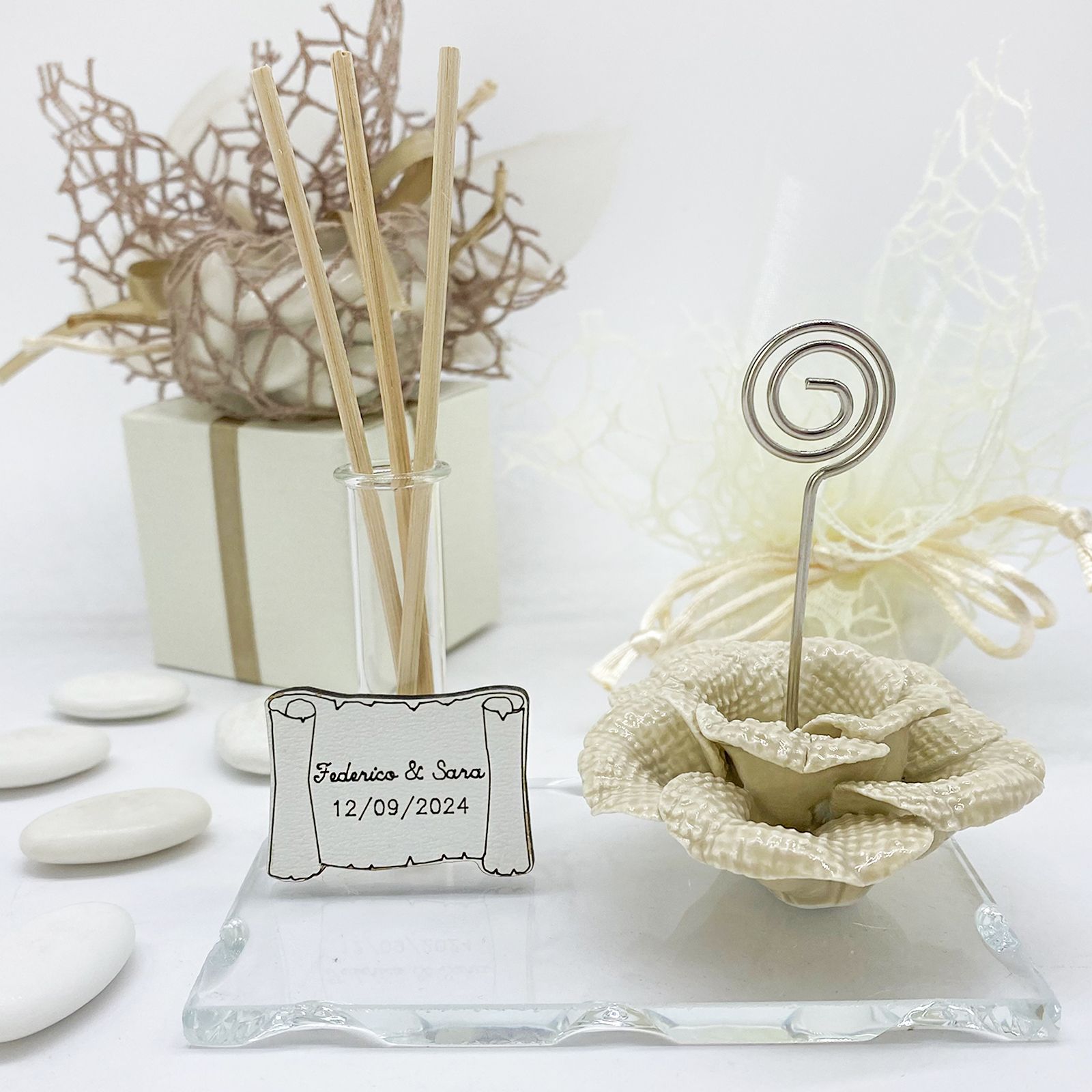 Oltre alla base in vetro con profumatore e memoclip a forma di rosa, è possibile aggiungere una pergamena personalizzata, incisa con nome e data, per rendere il regalo ancora più speciale e unico.