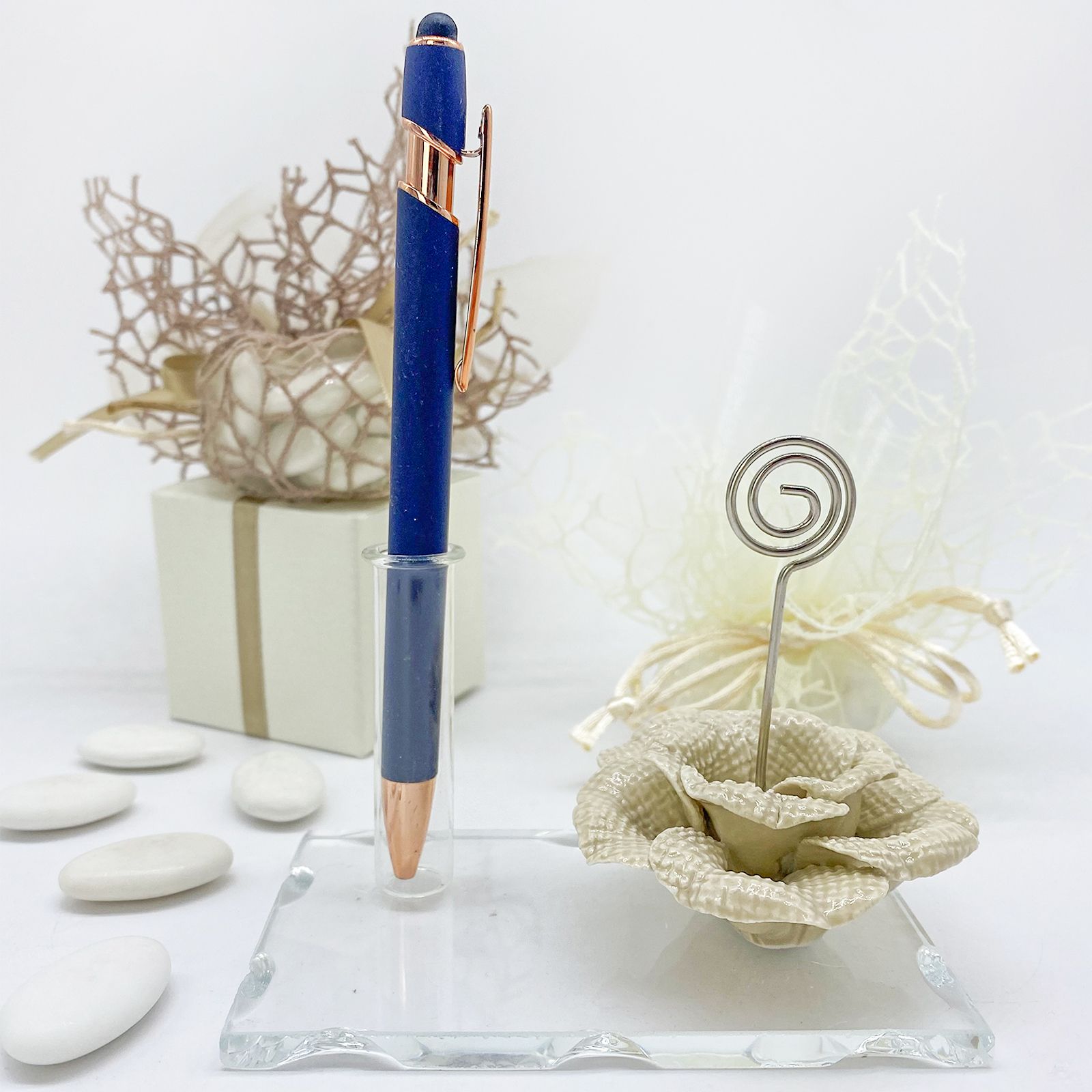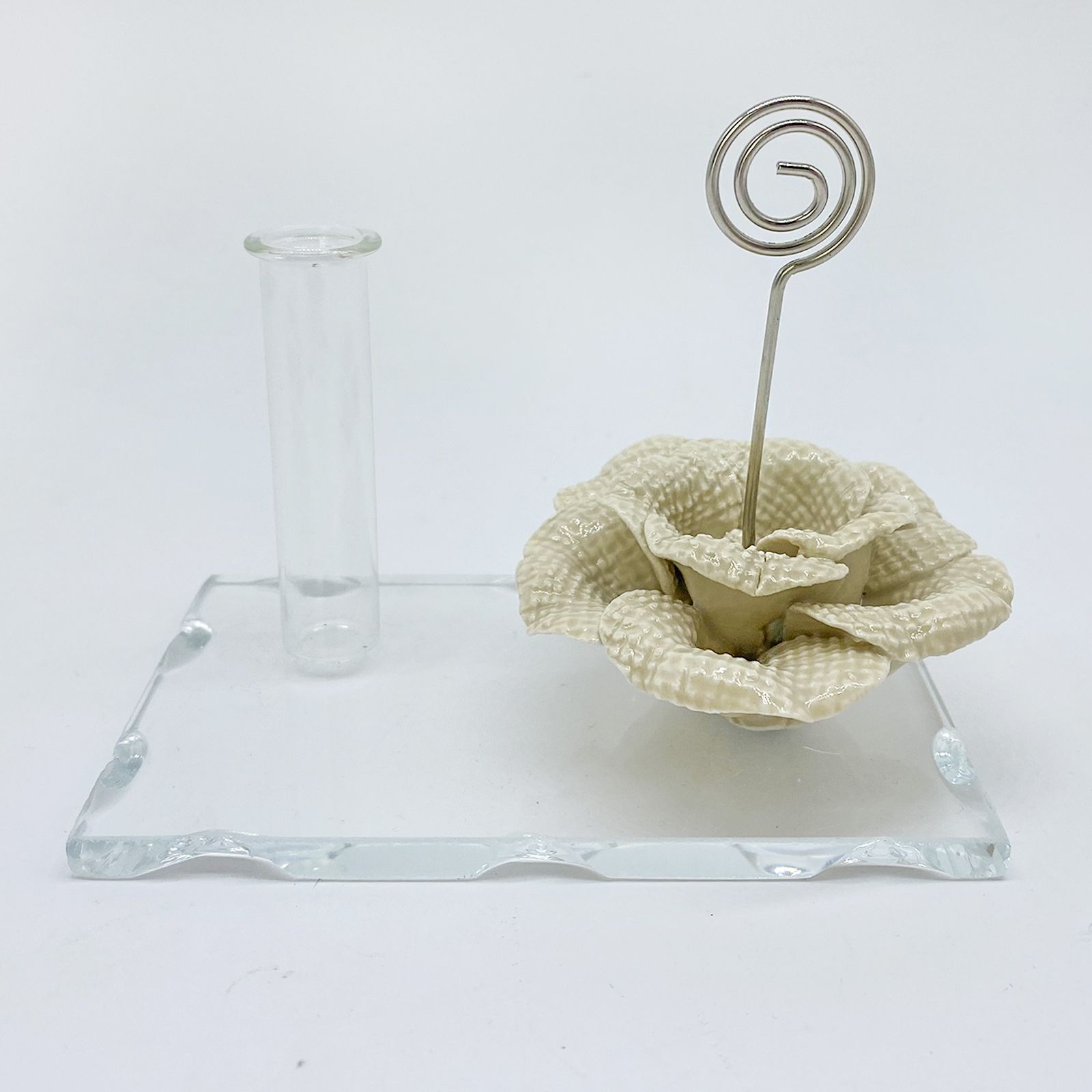 Scopri questa affascinante bomboniera che unisce l'eleganza di una base in vetro alla dolcezza di un memoclip a forma di rosa in resina, completa di fiala per essenze che può essere utilizzata anche come vaso monofiore o portapenne. Perfetta per ogni evento, questa bomboniera si adatta a diverse occasioni, dalle celebrazioni di matrimonio, compleanni, anniversari.