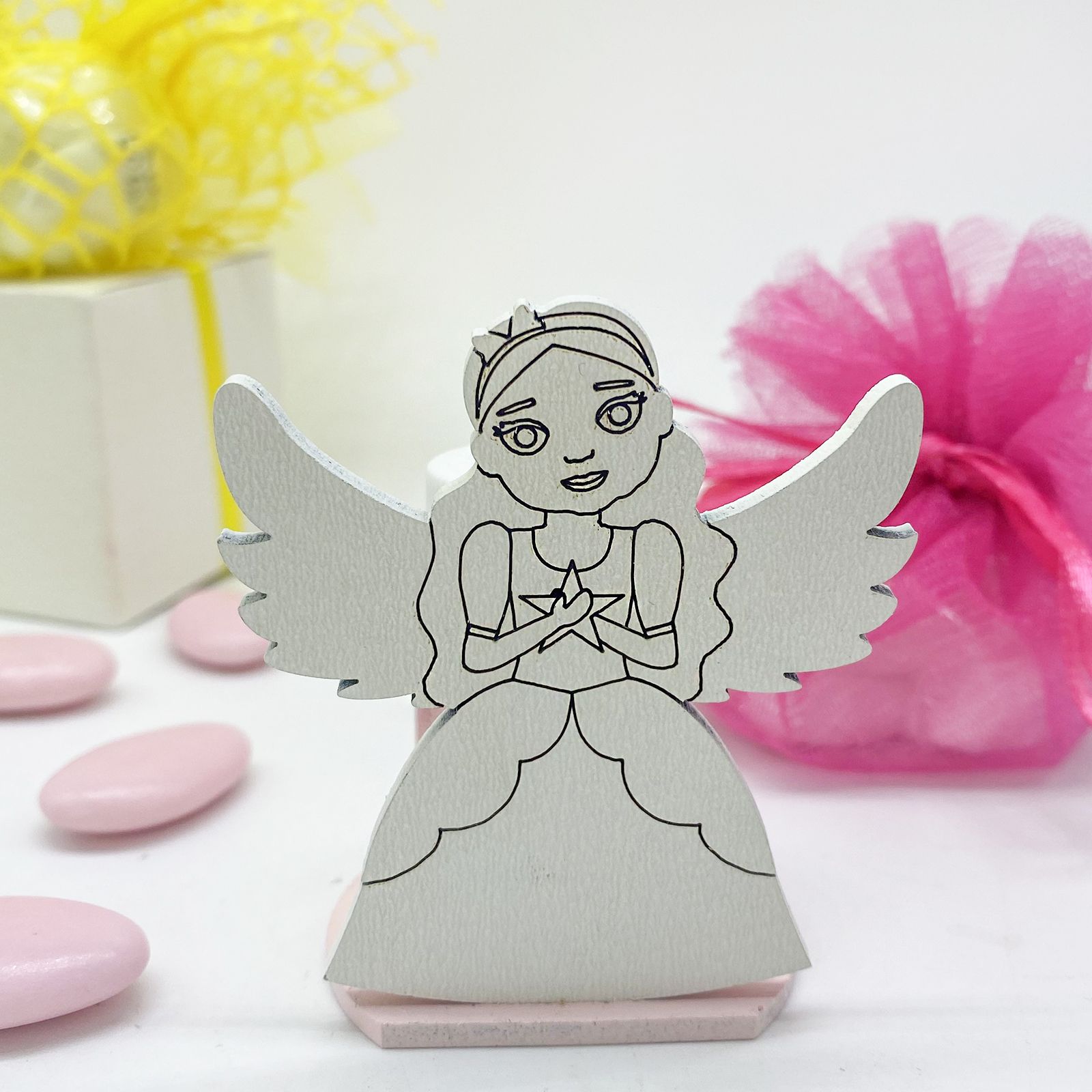 Una principessa alata è un'icona di bellezza e speranza, e donare una bomboniera con questa immagine è un modo di augurare all'evento e alla piccola protagonista una vita piena di avventure e felicità. È un gesto che lascia un'impronta d'amore e dolcezza nei cuori di coloro che la ricevono, un segno tangibile di quanto ci teniamo ai momenti speciali della vita.