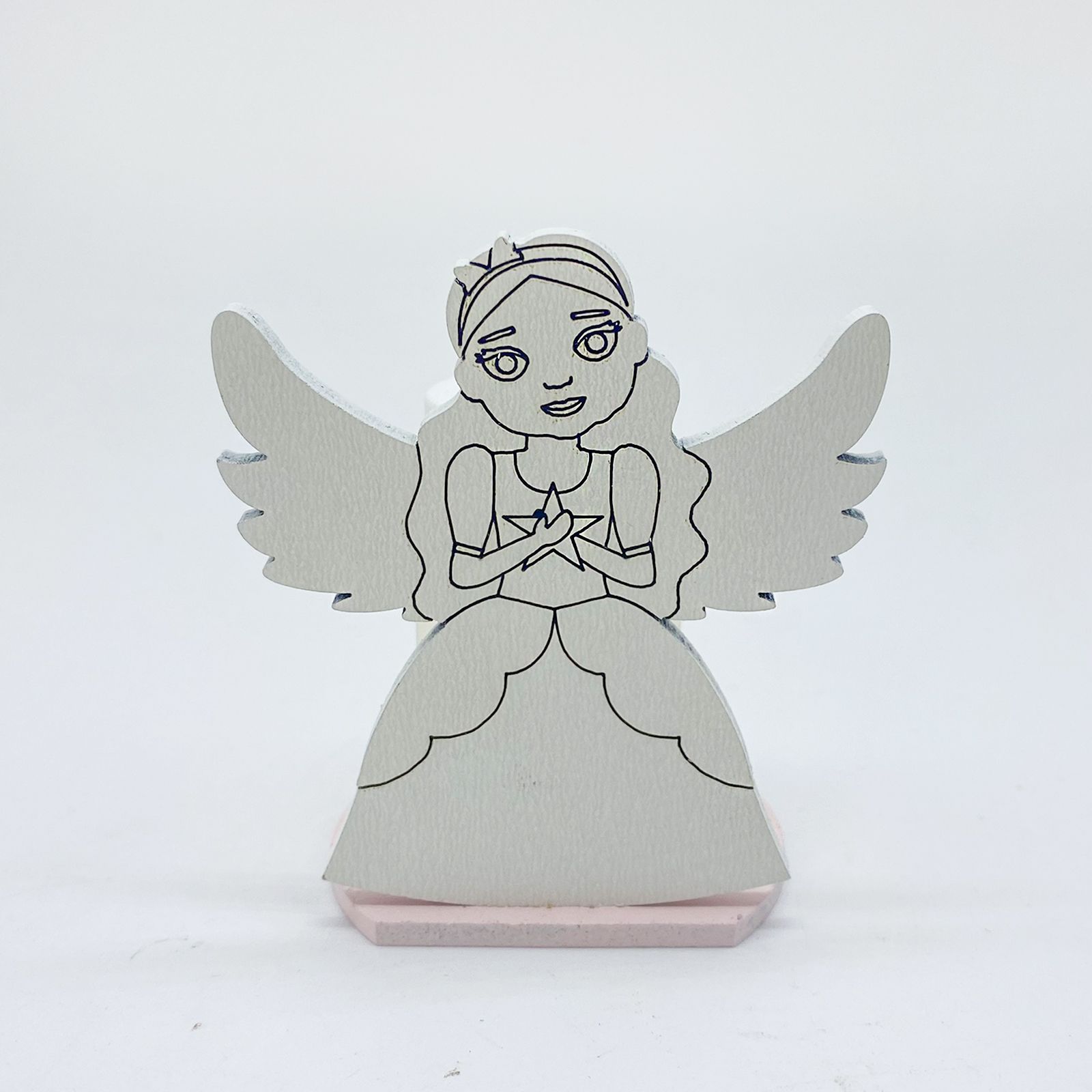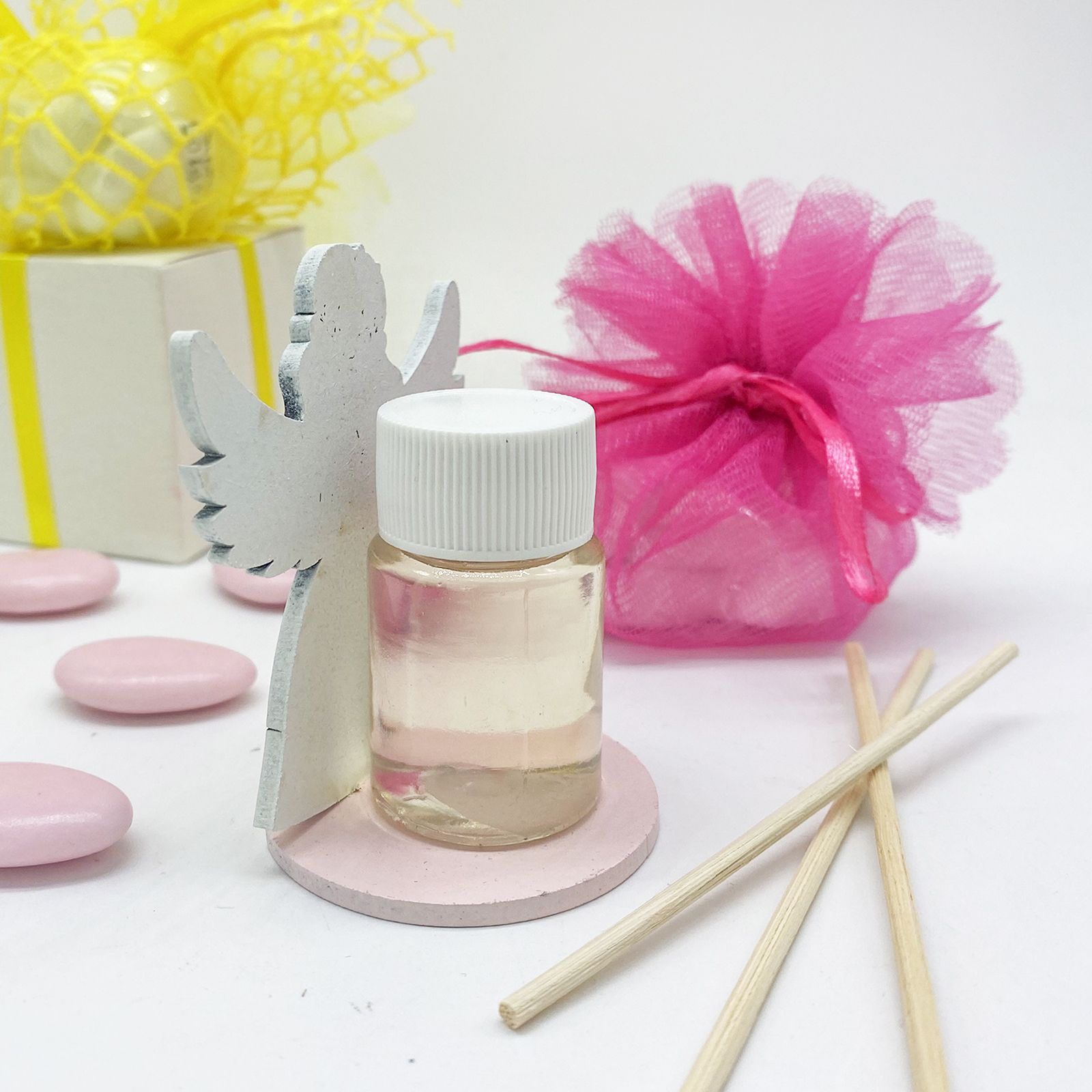 Porta la magia delle principesse al tuo evento con il nostro Mini Diffusore d'Essenza. Questa bomboniera incantevole è realizzata con una base in legno rosa, sopra la quale troverai una bellissima principessa con un elegante vestito, una stella tra le mani e ali spiegate. A completare il tutto, una boccettina d'essenza alle spalle della principessa diffonde una fragranza avvolgente.