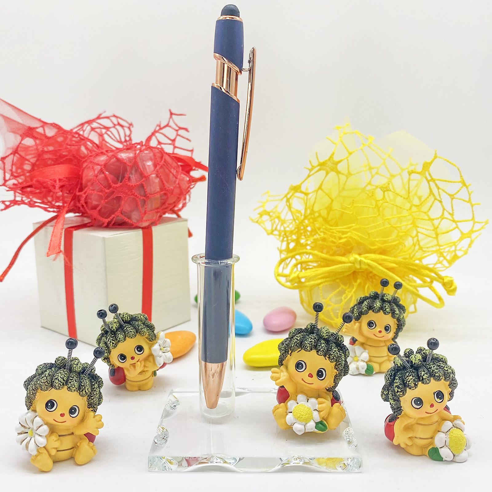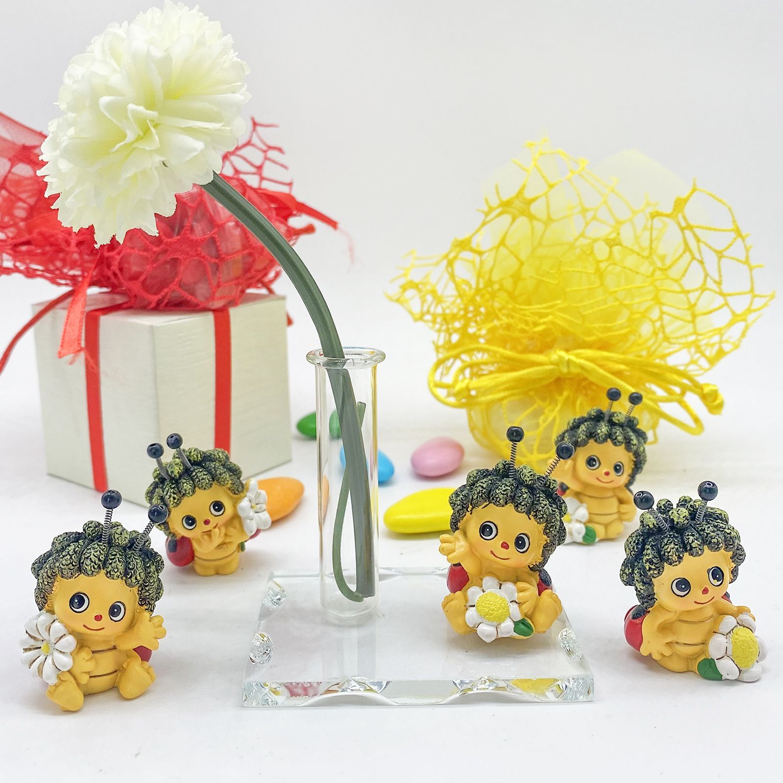 La bomboniera misura circa 10x4 cm per la base, mentre la fiala è alta 6 cm e la coccinella 6x4,5 cm. Realizzata con materiali di alta qualità come vetro e resina, è assortita in vari modelli. Questo oggetto particolare e originale è un modo raffinato per ringraziare gli invitati.
