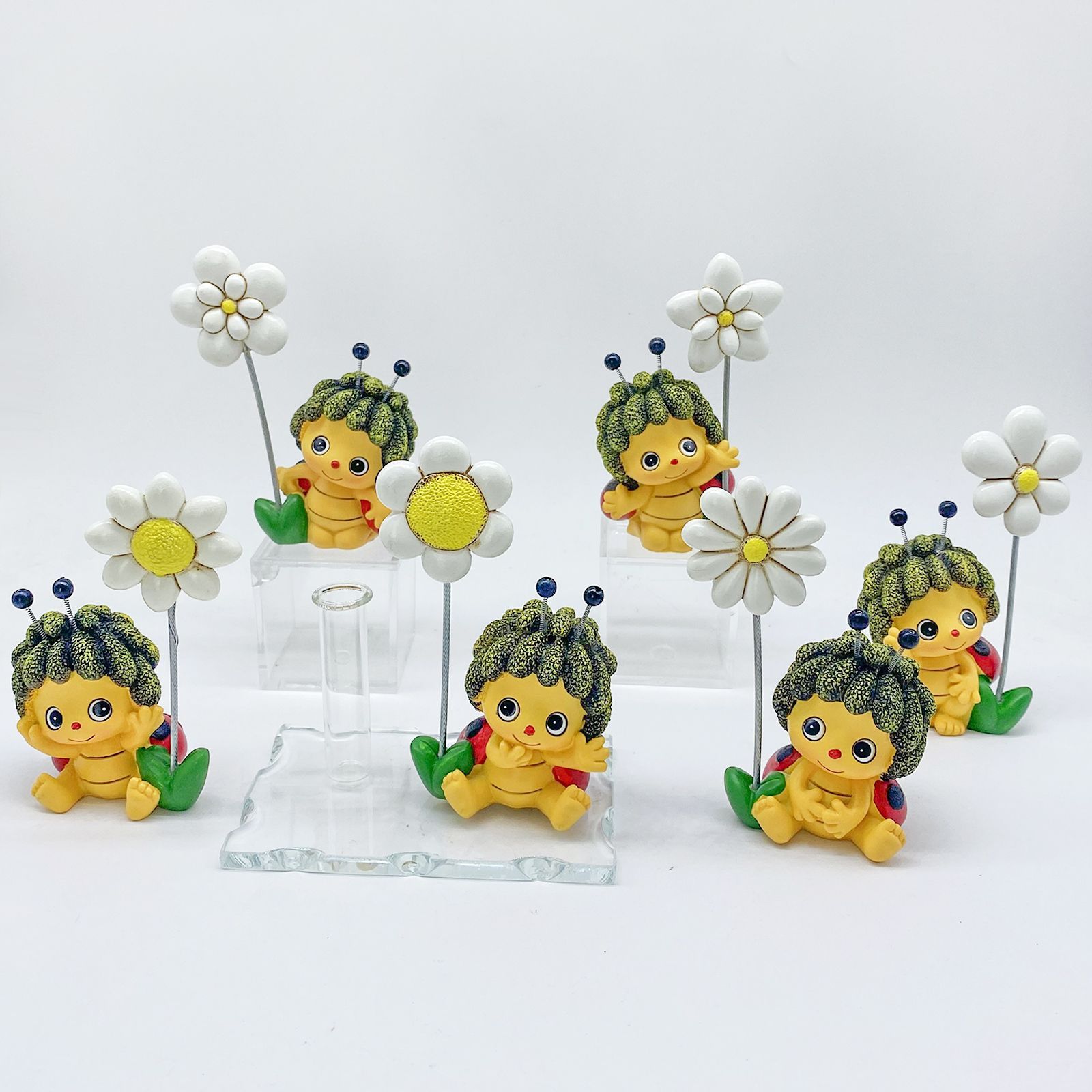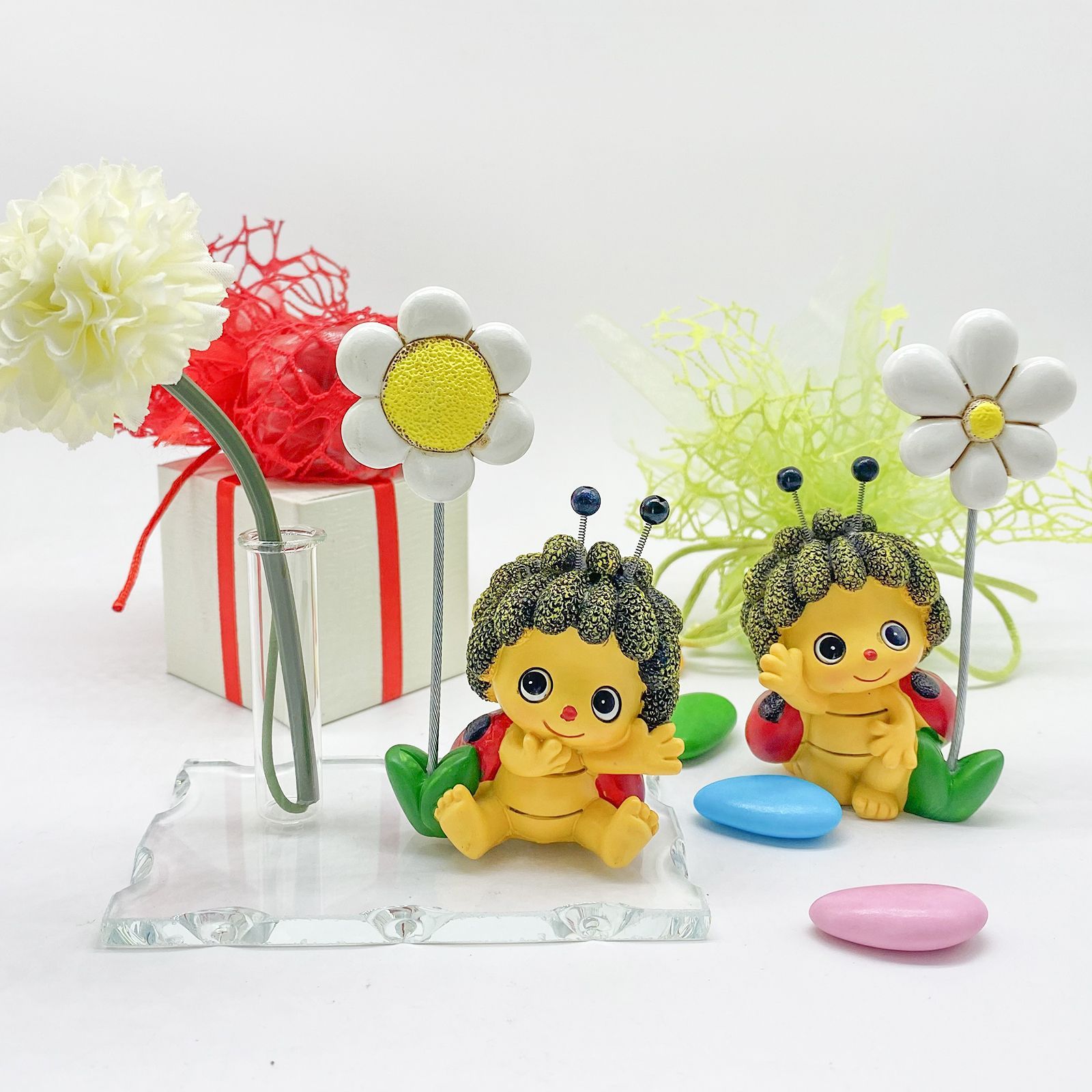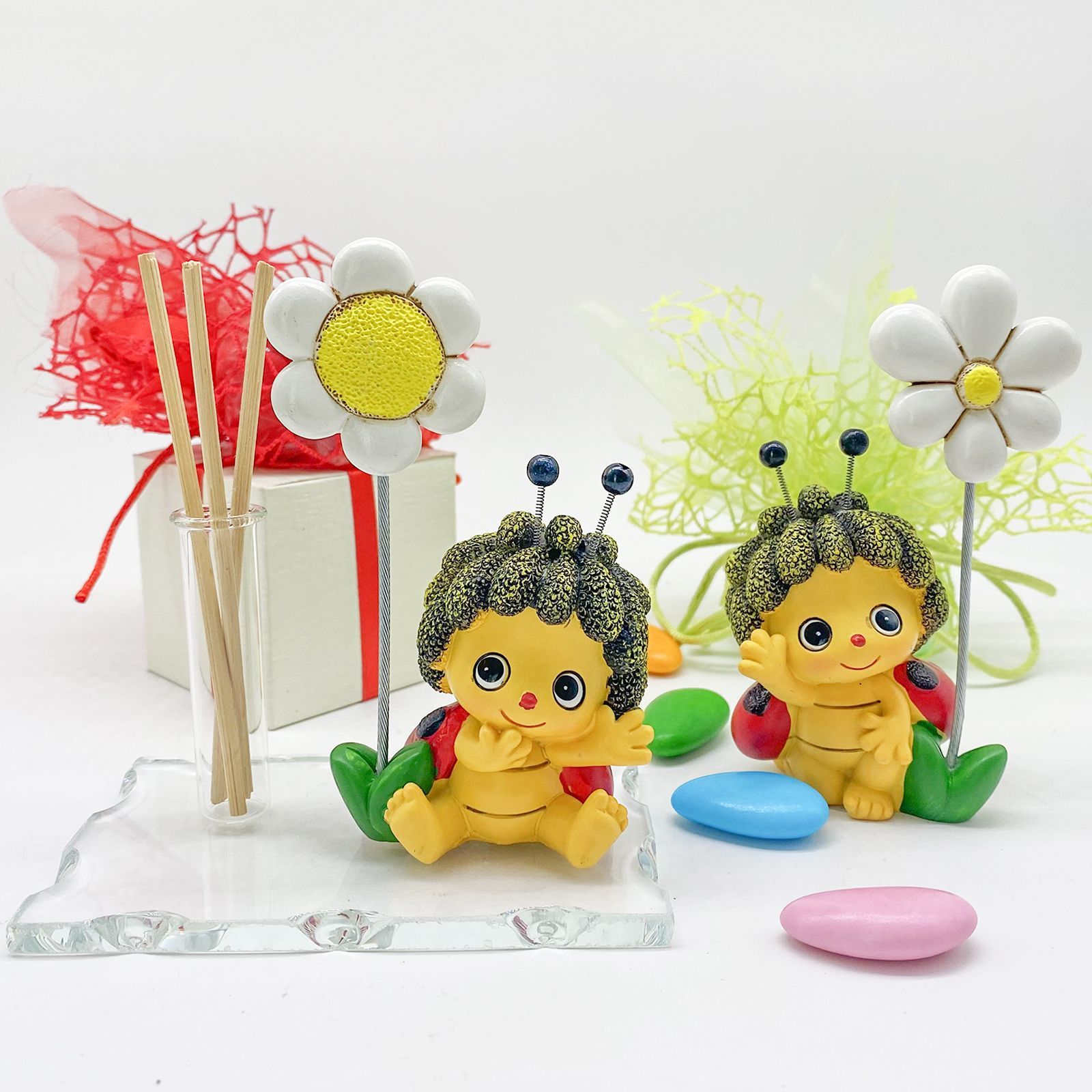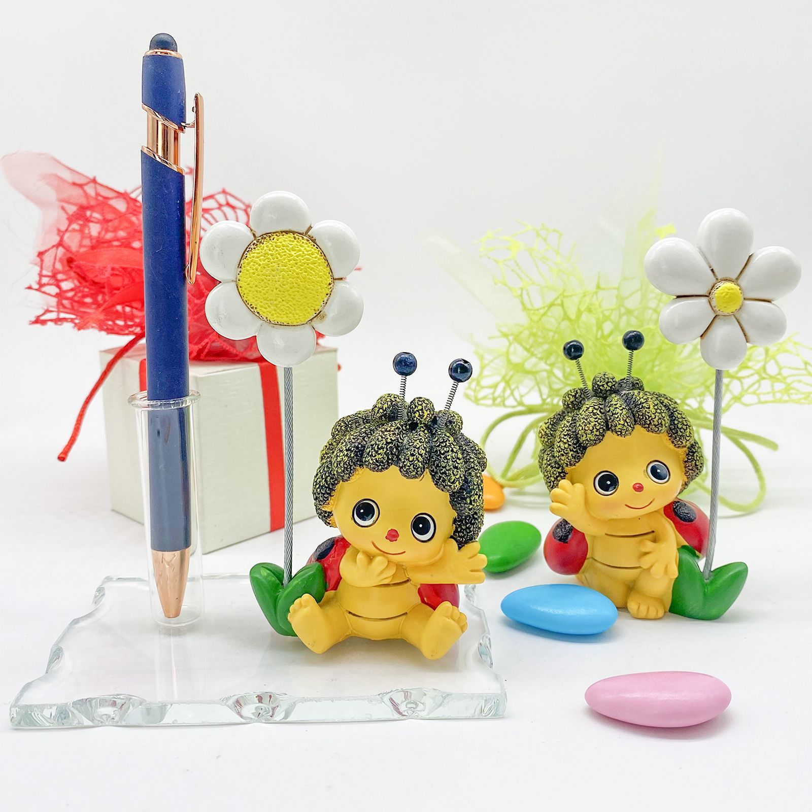 Caratterizzata da un simpatico memoclip con coccinella assortita in più varianti e un'asta che termina con un delicato fiorellino bianco, questa bomboniera è un'idea unica e particolare. La base in vetro, oltre ad essere esteticamente gradevole, offre la possibilità di utilizzare la fiala come porta essenza, monofiore o portapenne.