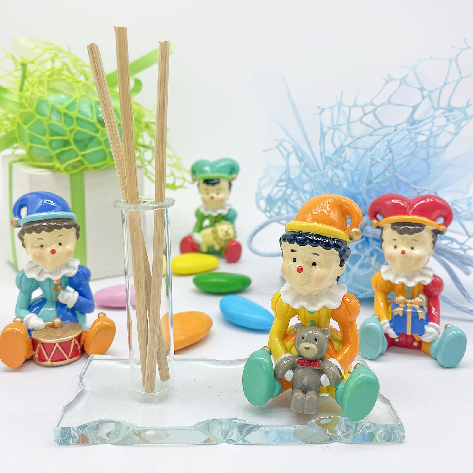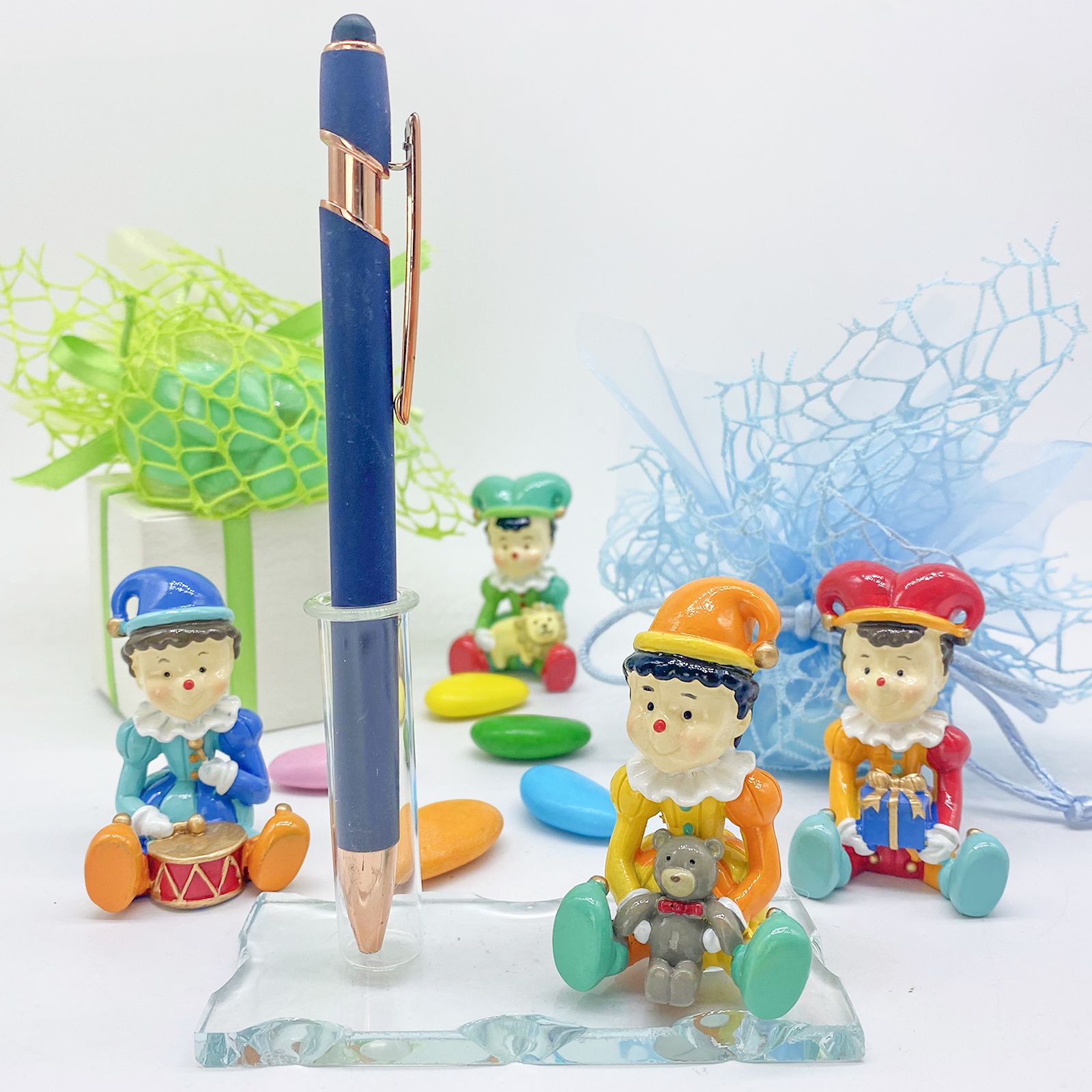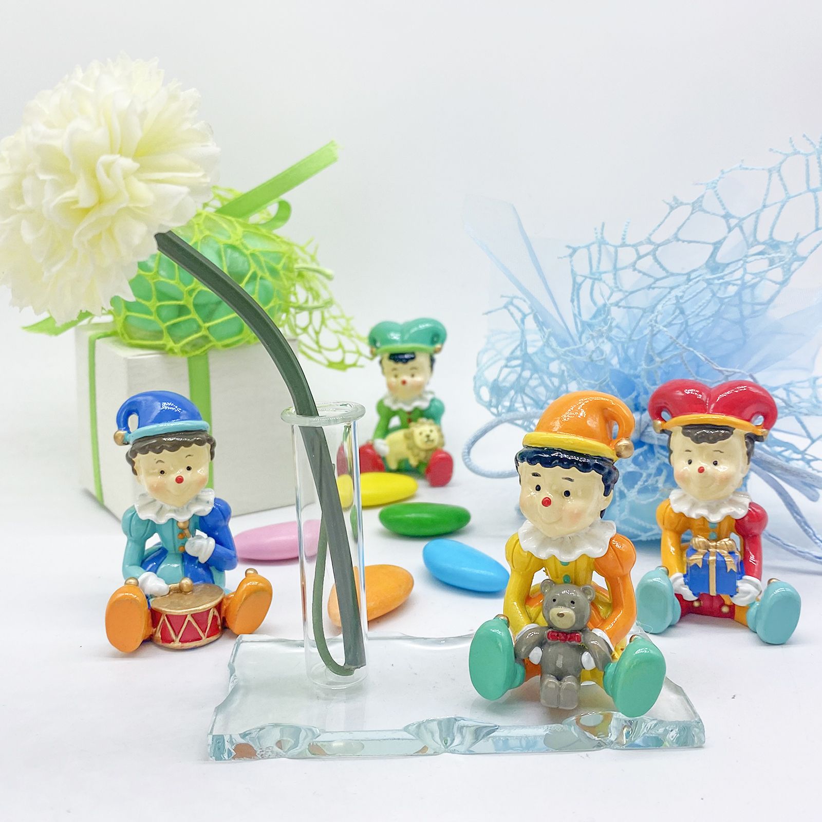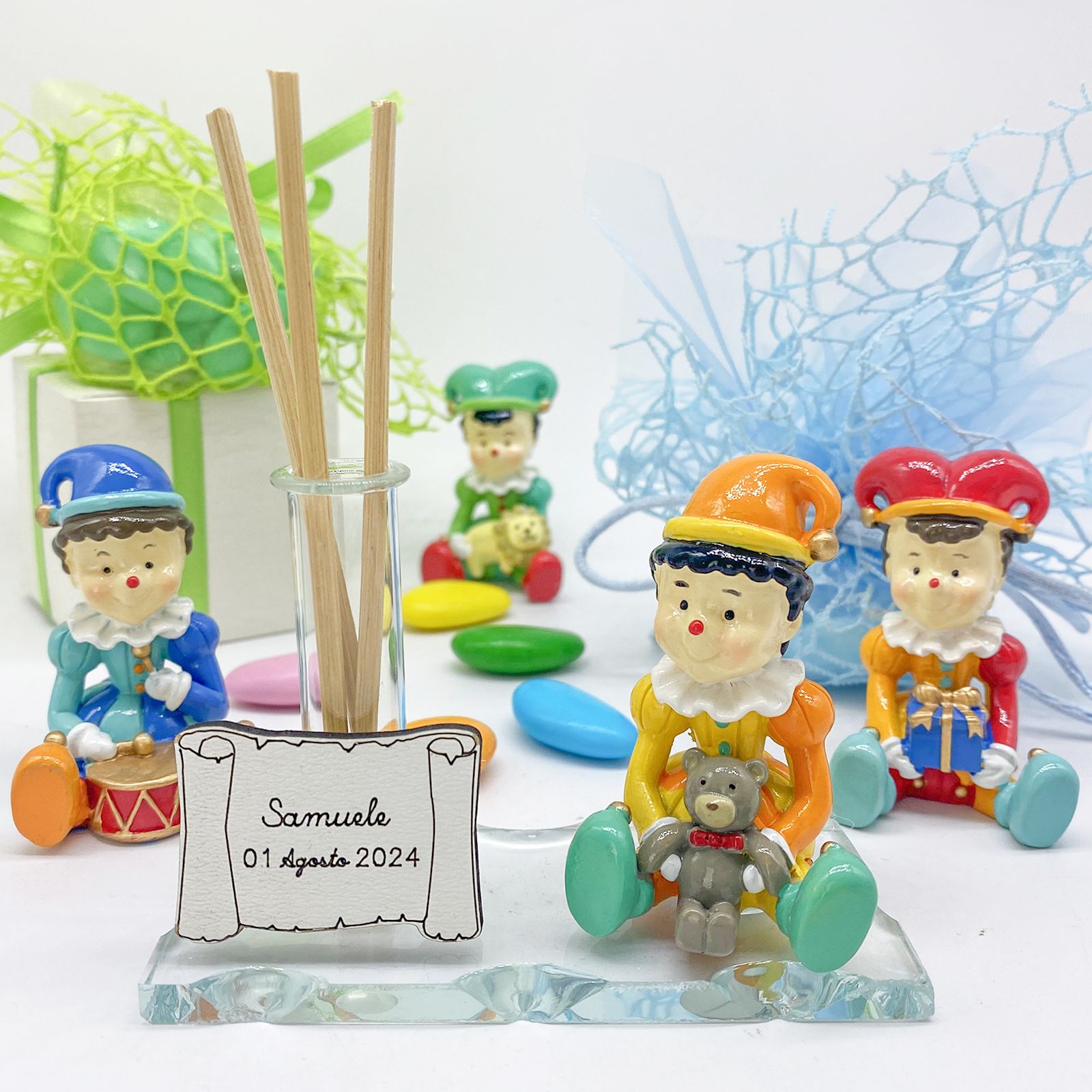 Offrire questa bomboniera significa condividere un messaggio di affetto e gratitudine con i tuoi ospiti, lasciando un ricordo indelebile della tua festa. Assortito in vari colori, la statuina jolly personalizza ogni bomboniera, facendo sentire ogni invitato speciale e apprezzato. Inoltre, la bomboniera è personalizzabile con l'aggiunta di una pergamena dove incidere il nome e la data dell'evento, rendendo il ricordo ancora più unico.