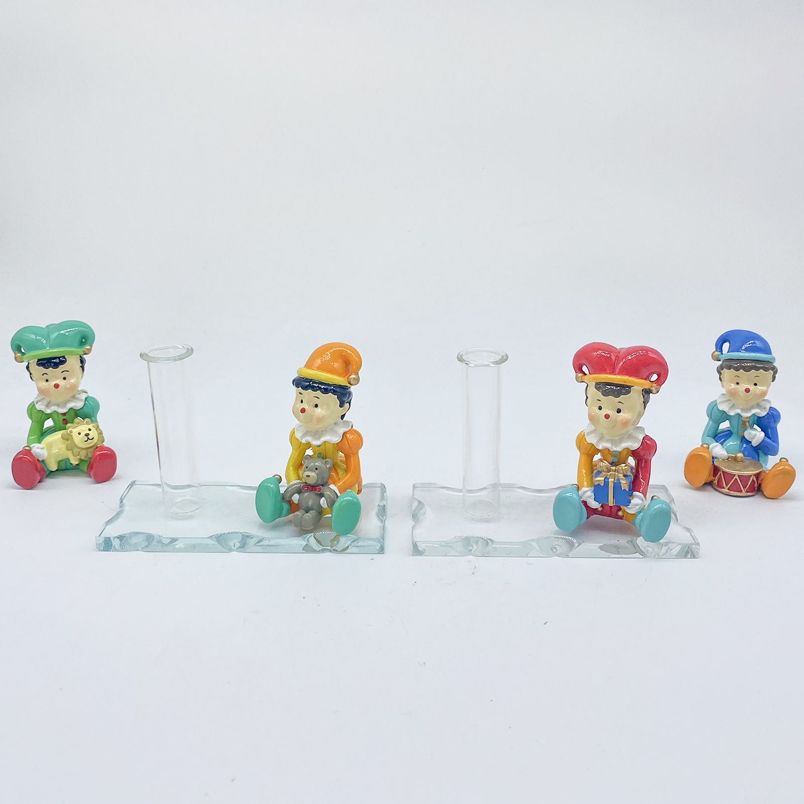 La base in vetro dalle dimensioni di 10x4 cm ospita una fiala alta 6 cm, ideale come profumatore, vaso monofiore o pratico portapenne. La statuina jolly, realizzata con cura in resina e misurante 4x7 cm, aggiunge un tocco di fantasia e colore, rendendo ogni pezzo un vero e proprio gioiello decorativo.