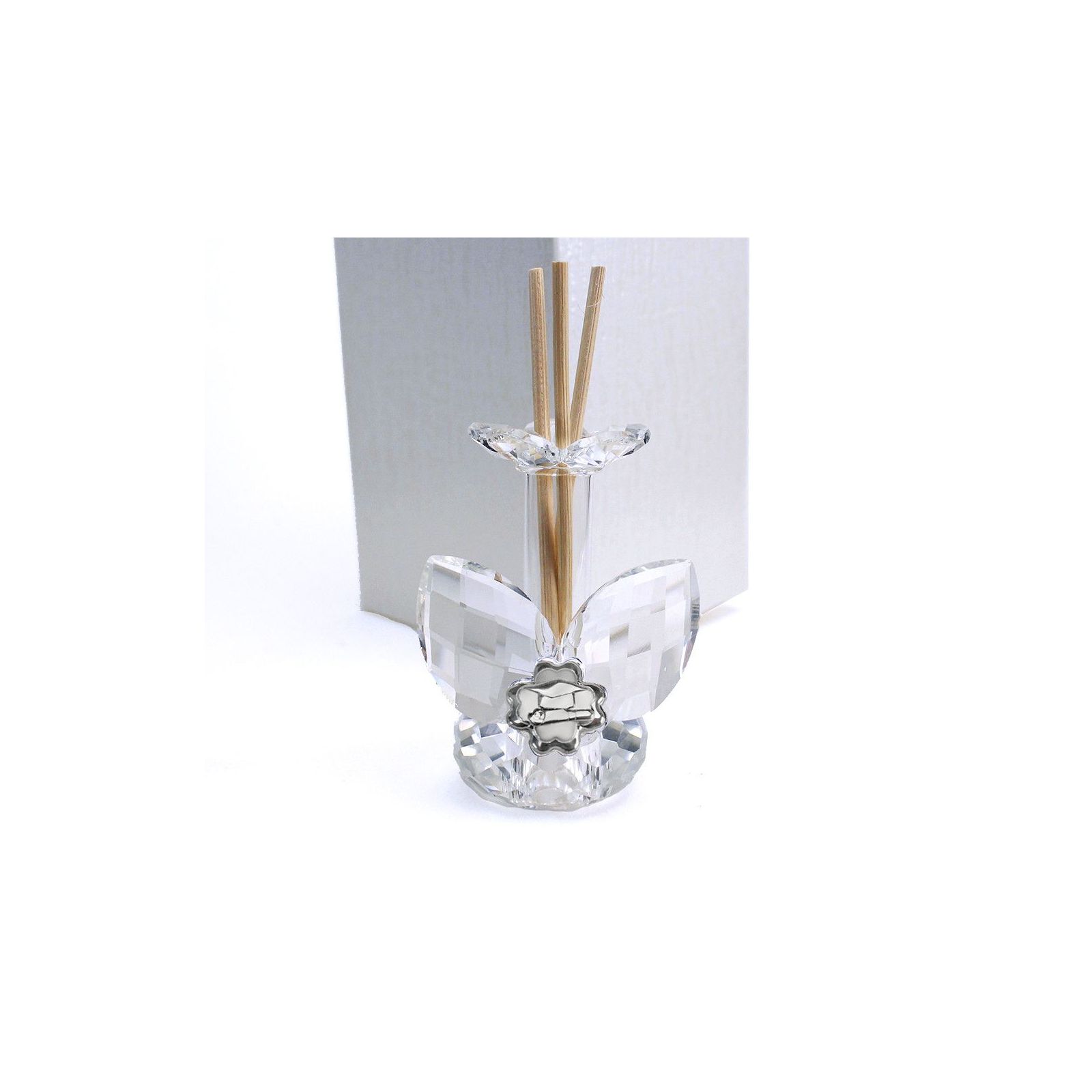 La placchetta argentata aggiunge un tocco di eleganza, mentre il cristallo e il metallo di alta qualità garantiscono una bomboniera resistente e di pregio.