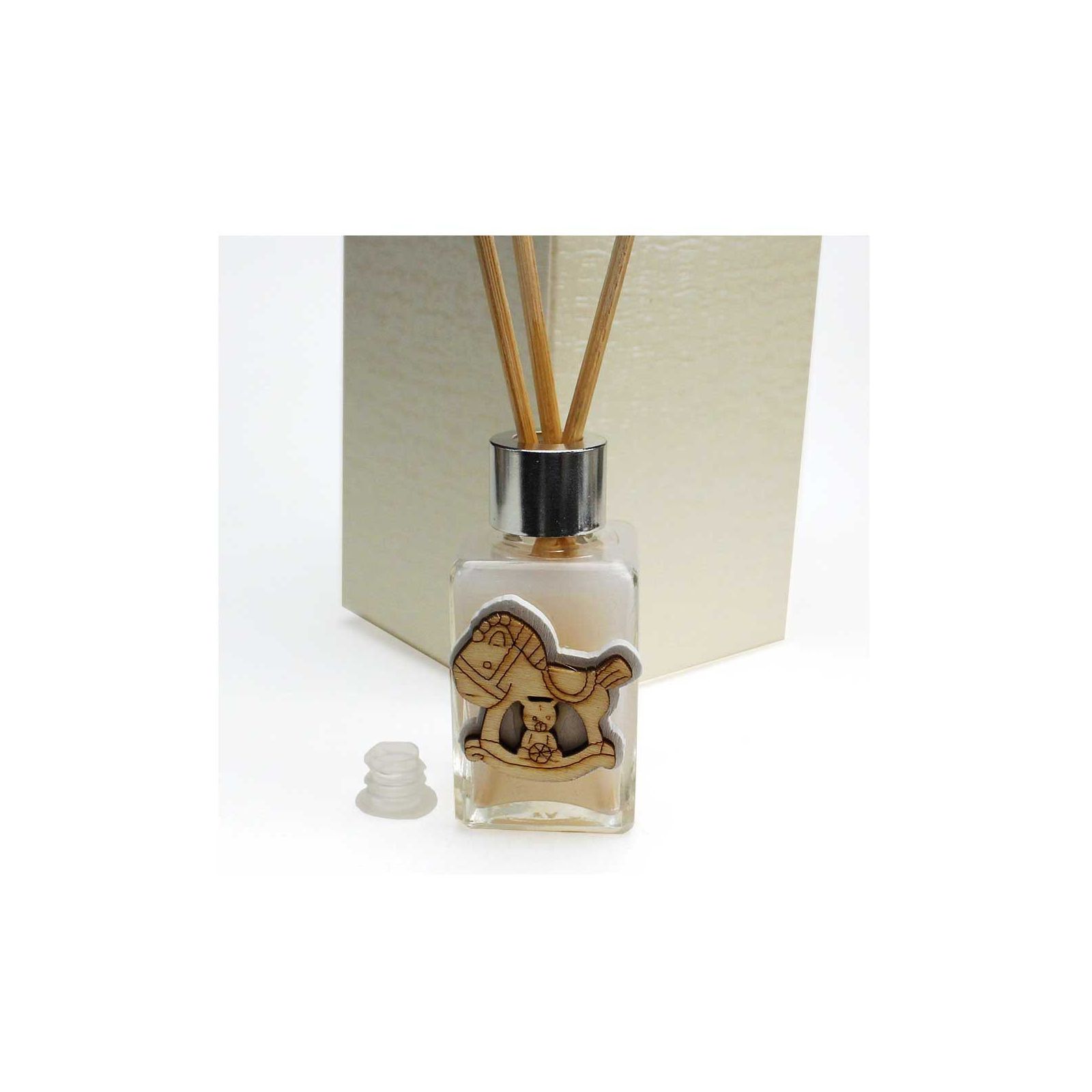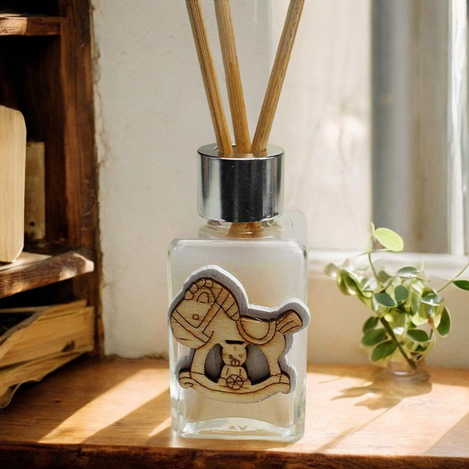 Celebra il battesimo con il nostro raffinato diffusore d'essenza, caratterizzato da un tappo color argento e un'applicazione in legno a forma di cavallo a dondolo. Realizzato in legno e vetro di alta qualità, questo diffusore combina eleganza e funzionalità.