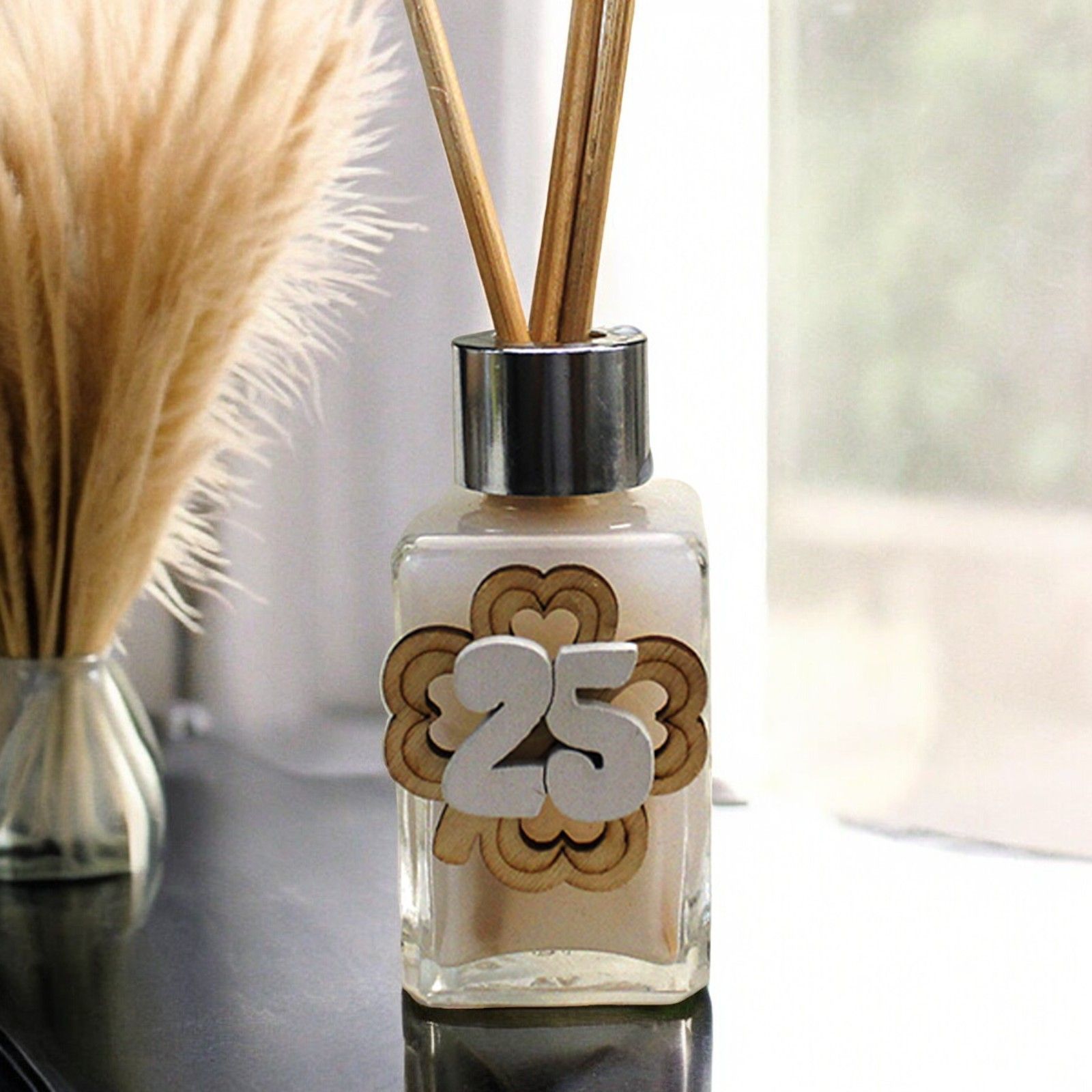 Un elegante profumatore ambiente che unisce stile e funzionalità, perfetto come bomboniera per celebrare un anniversario. Con dimensioni di circa 7x3x3 cm, questo profumatore è ideale per eventi speciali come le nozze d'argento.