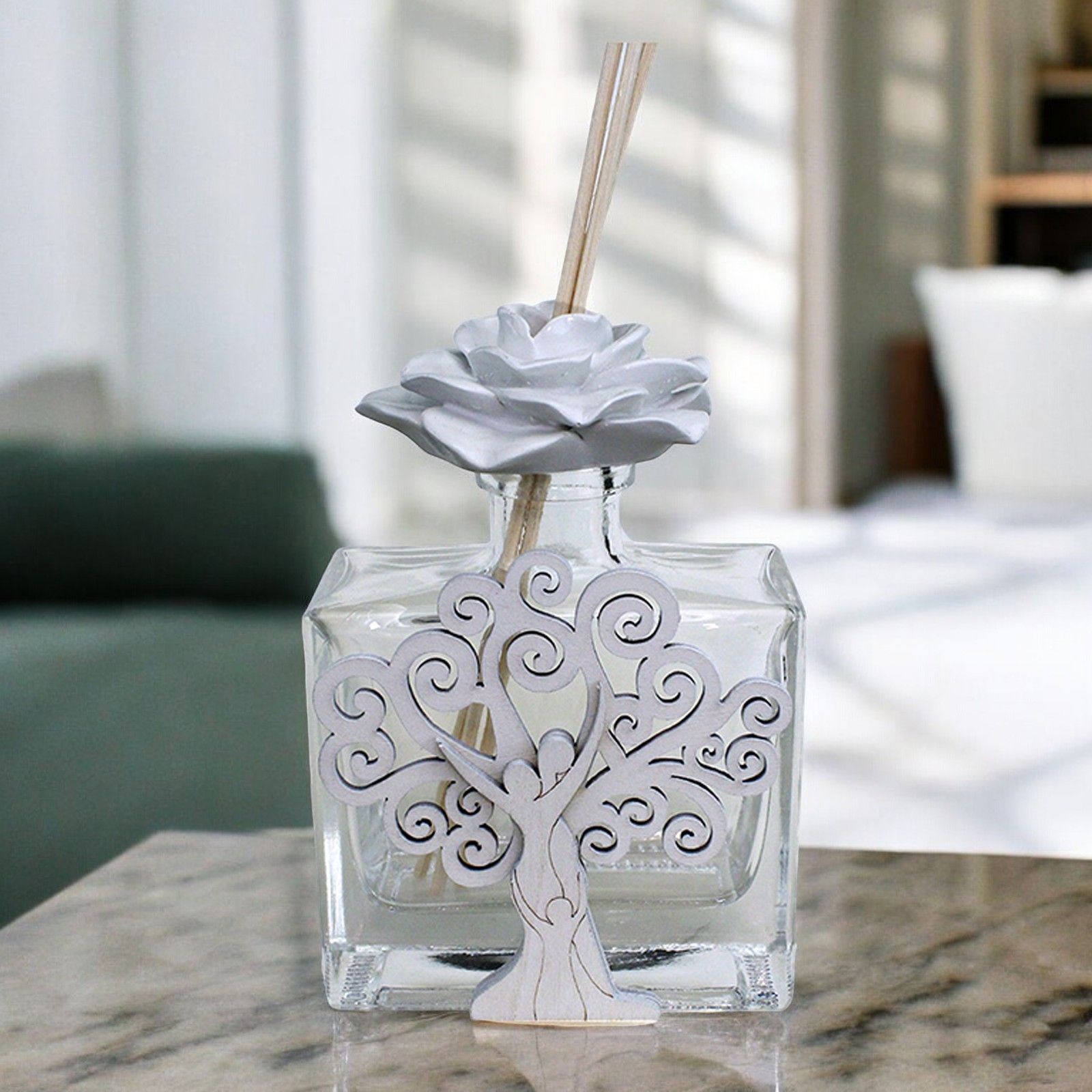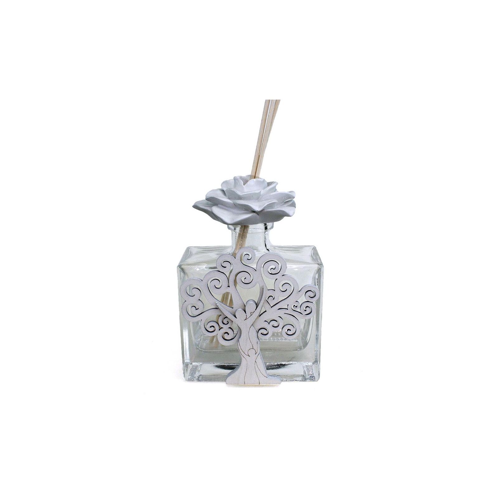 Rendi unico il tuo matrimonio o anniversario con il nostro raffinato profumatore ambiente. Questo elegante accessorio, con un'applicazione in legno che raffigura un albero della vita e una famiglia che si abbraccia, è completato da un tappo a forma di rosa bianca per un tocco di delicatezza.
