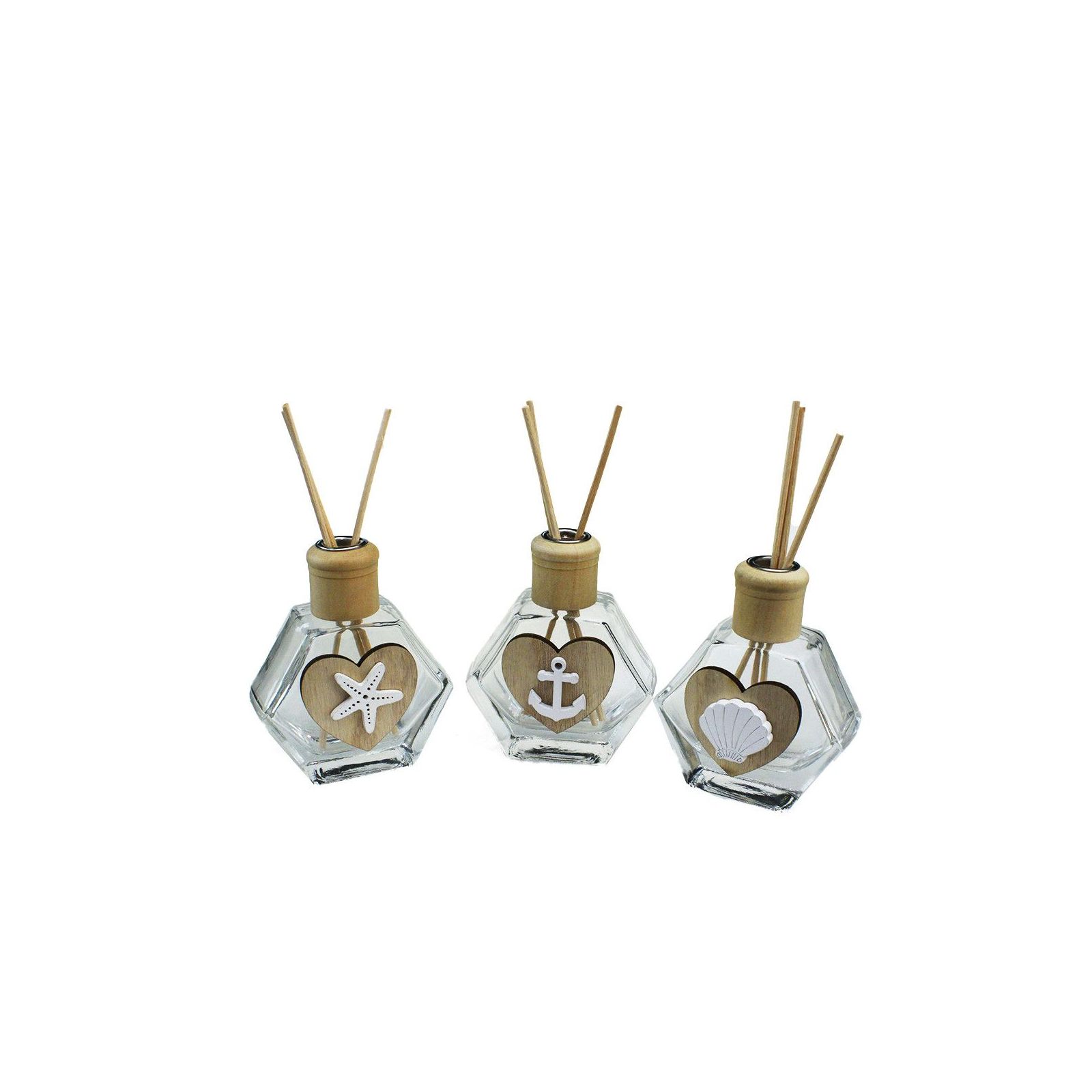 Questi profumatori sono impreziositi da un'icona in legno naturale a forma di Cuore e da un'icona in legno bianca dipinta a mano, disponibili in tre versioni assortite: stella marina, ancora, e conchiglia. Perfetti per occasioni come nascita, battesimo, compleanno, matrimonio, anniversario, e feste a tema Mare/Marinaio.