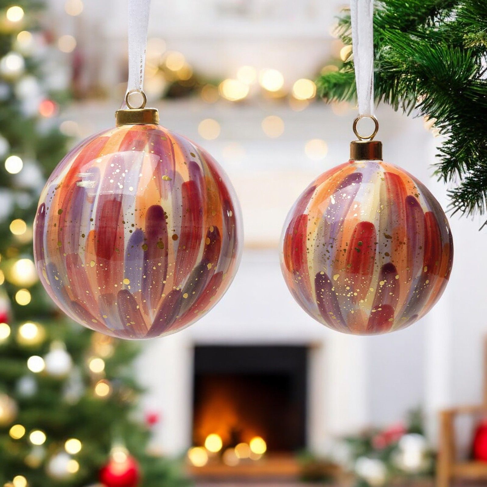 Aggiungi un tocco di magia alla tua casa con la nostra palla di Natale decorata a mano. Disponibile in due dimensioni: Standard (cm Ø 10) e Grande (cm Ø 12 circa), questa palla di Natale bianca con sfumature colori pastello e oro sarà la decorazione perfetta per il tuo albero di Natale.