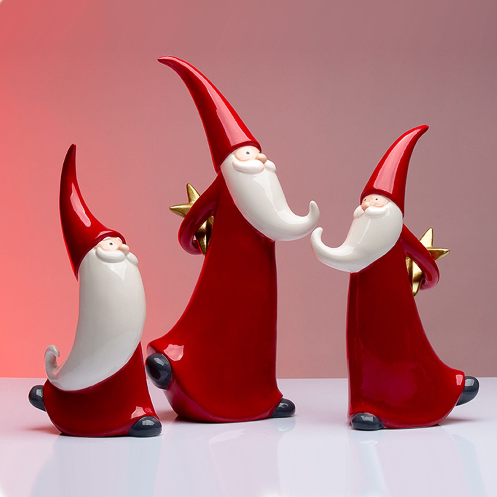Questo elegante oggetto, disponibile in tre dimensioni diverse, è perfetto per decorare la tua casa durante le festività. Realizzato in ceramica lucida, questa statuina rappresenta Babbo Natale con i tradizionali abiti rossi è disponibile in tre dimensioni: Standard:h.20, Grande: h. 23, Maxi: h.28 , solo nella versione Grande e Maxi ha la barba a punta e una stella color oro dietro la schiena, come se fosse pronto a distribuire regali a tutti i bambini buoni.