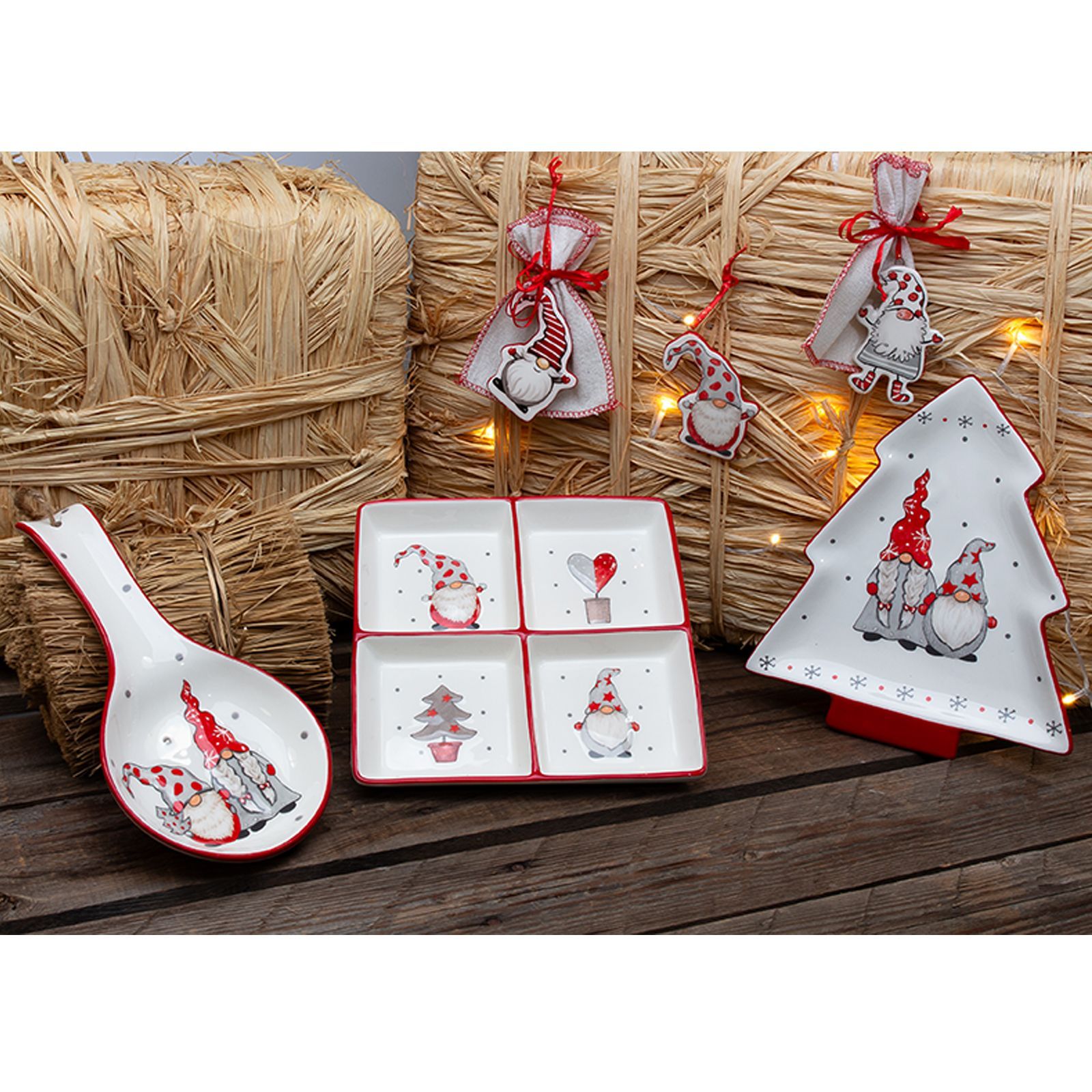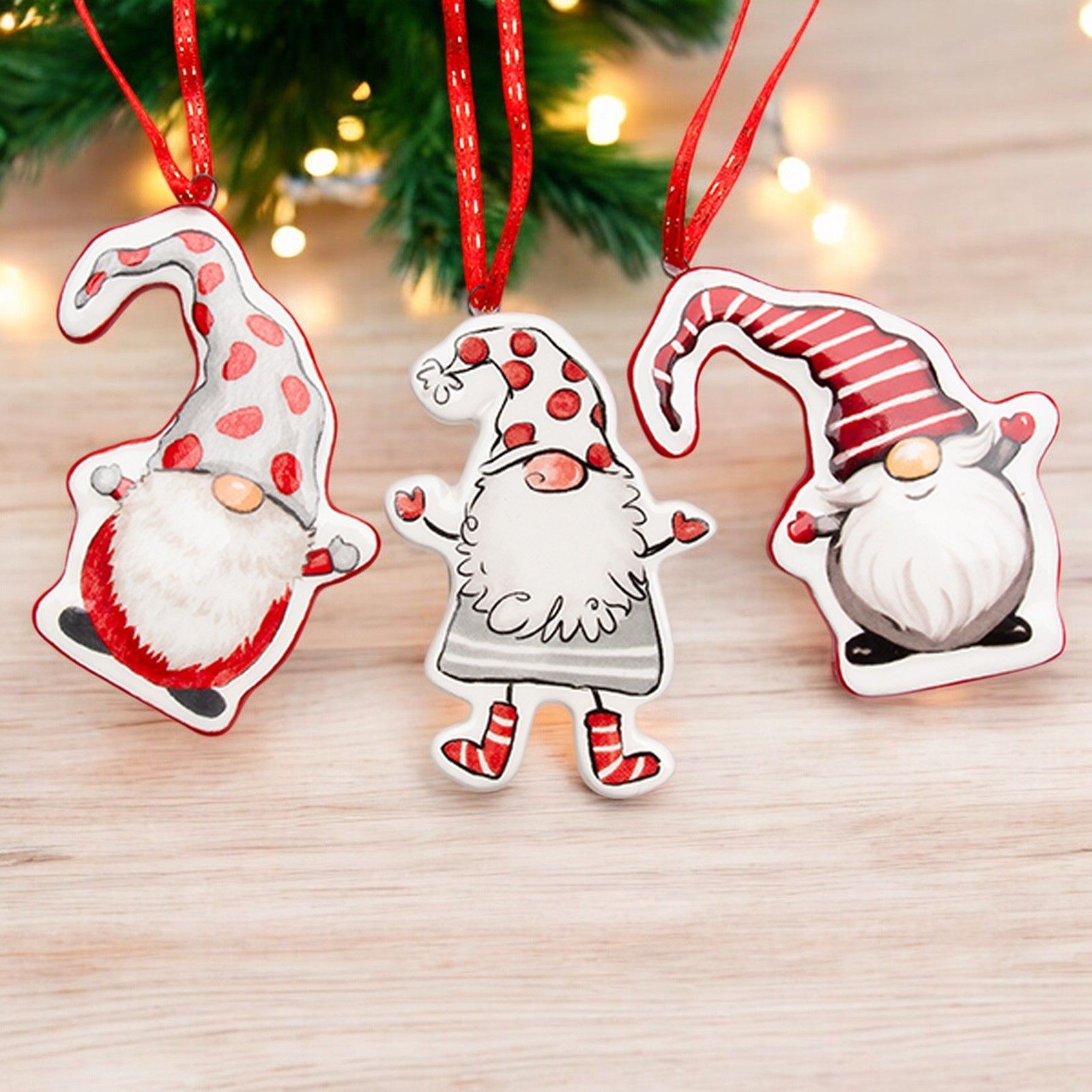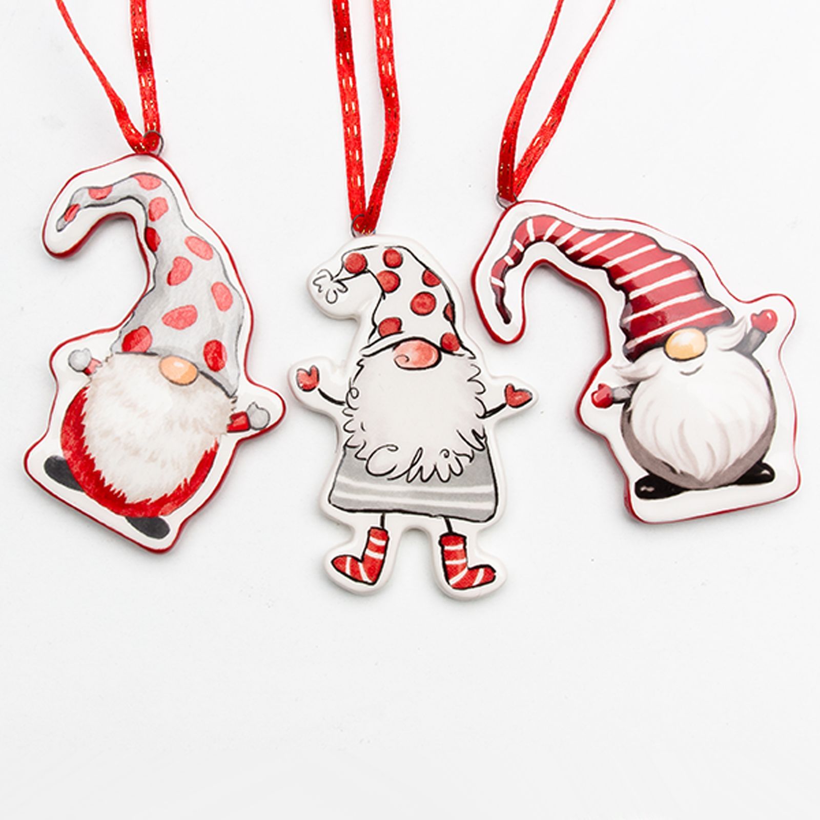 Queste decorazioni per Natale misurano circa cm 6x8 e sono realizzate in legno, rendendole sia resistenti che decorative. I colori rosso, grigio e bianco si integrano splendidamente in qualsiasi decorazione natalizia.
