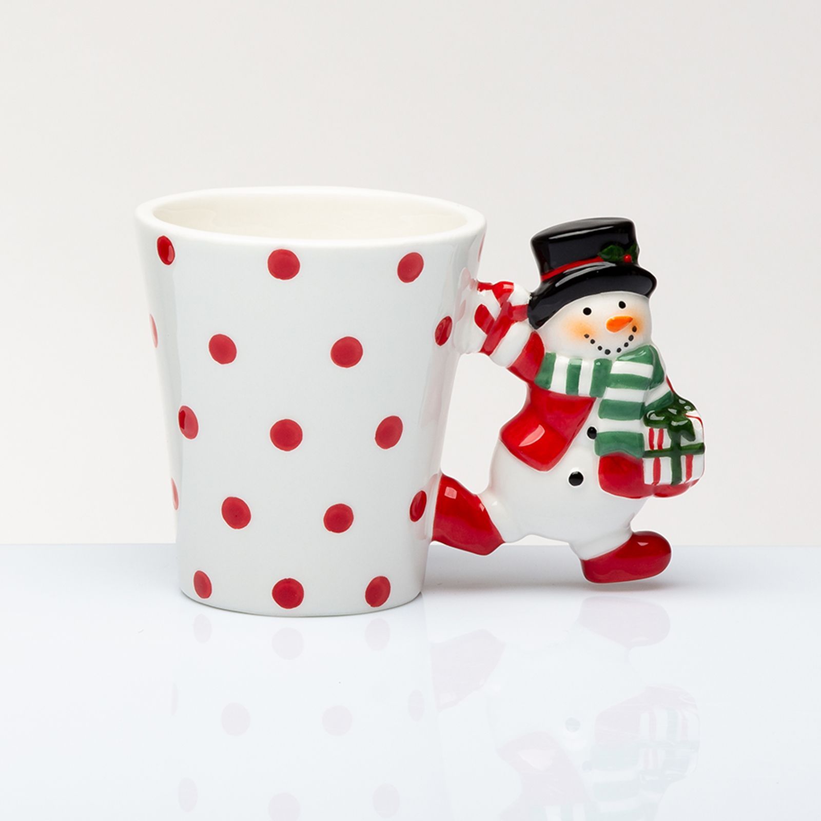 Regala un tocco di magia natalizia con questa deliziosa tazza mug con un simpatico pupazzo di neve! Con il suo cappello nero, giacca rossa e sciarpa verde e bianca, il pupazzo di neve tiene in mano un pacco regalo che aggiungerà un tocco di festa alla tua giornata.