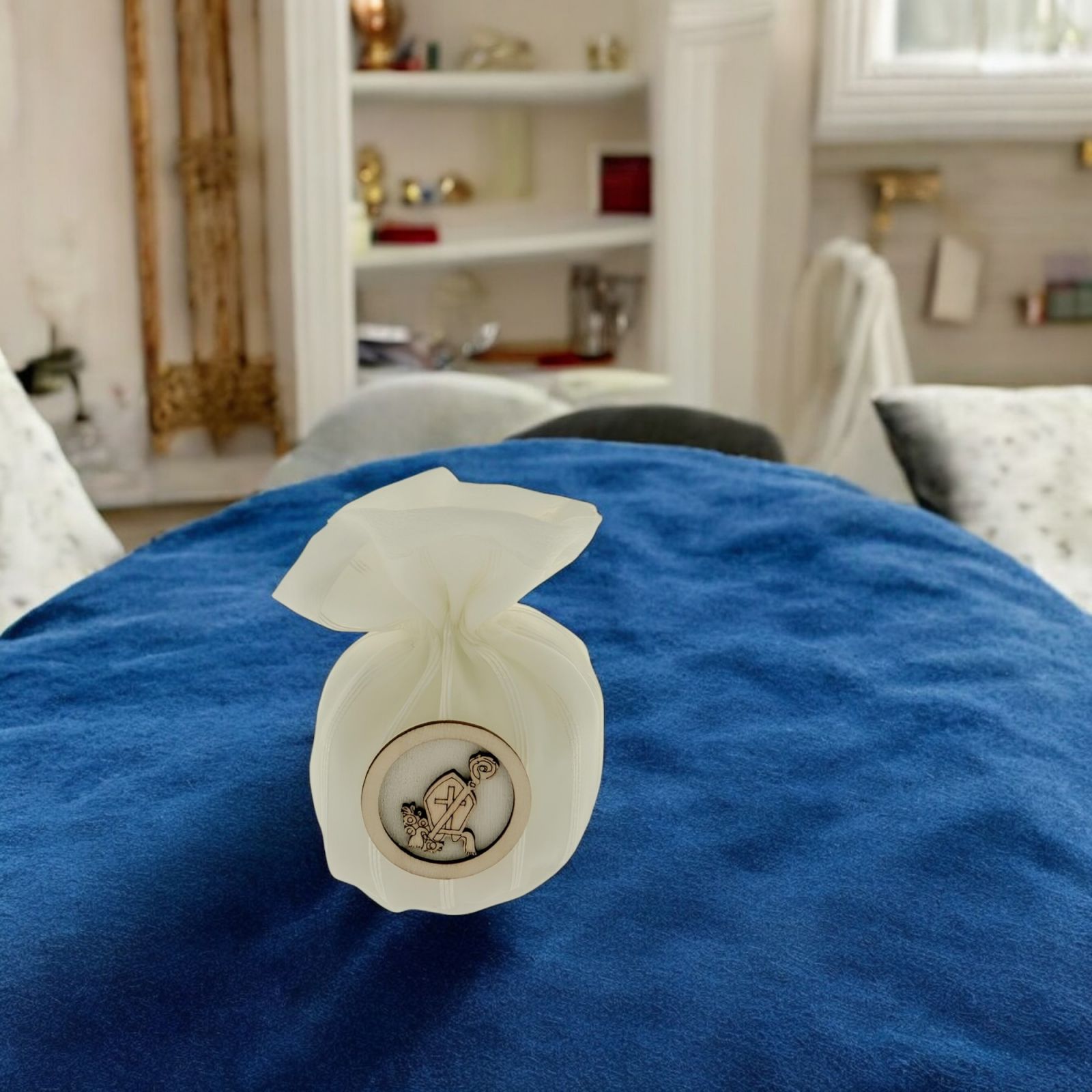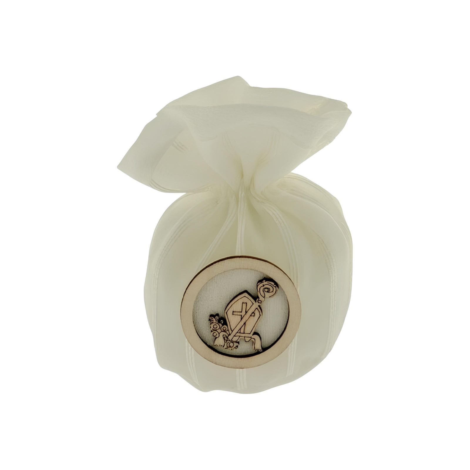 Un dettaglio unico per rendere speciale il giorno della Cresima. Questo elegante sacchetto portaconfetti a forma di palla, realizzato in morbido cotone con trama rigata, è impreziosito da un’applicazione tonda con simboli sacri Mitra e bastone del vescovo, Ideale per una confettata esclusiva, combina praticità ed estetica per creare un ricordo indimenticabile per i tuoi ospiti.