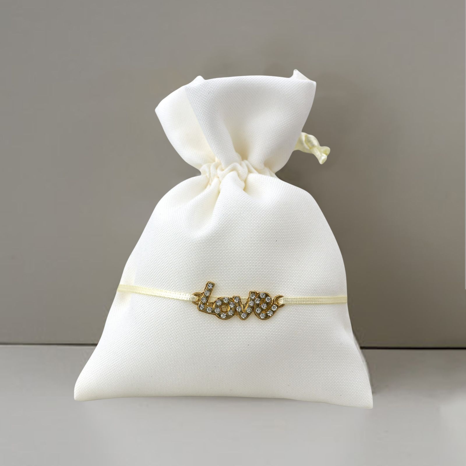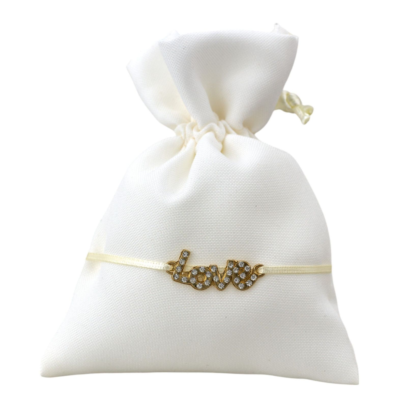 Il colore panna del sacchetto si abbina perfettamente al ciondolo color oro con la scritta "love", impreziosita da strass, creando un'atmosfera elegante e raffinata. Realizzato con materiali di alta qualità, come il cotone e il metallo, questa bomboniera è un pensiero ideale per i tuoi ospiti.