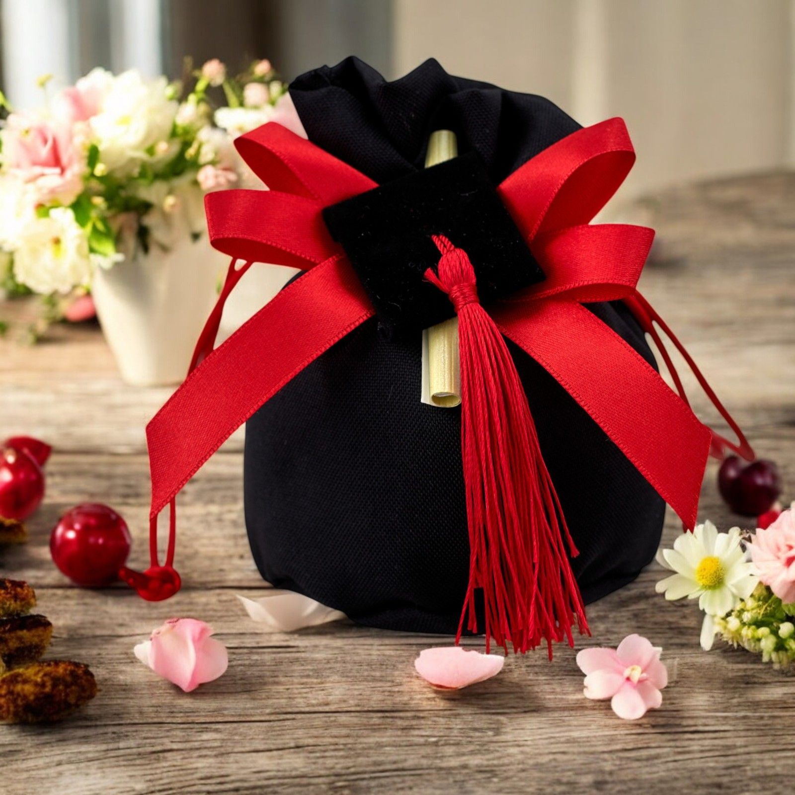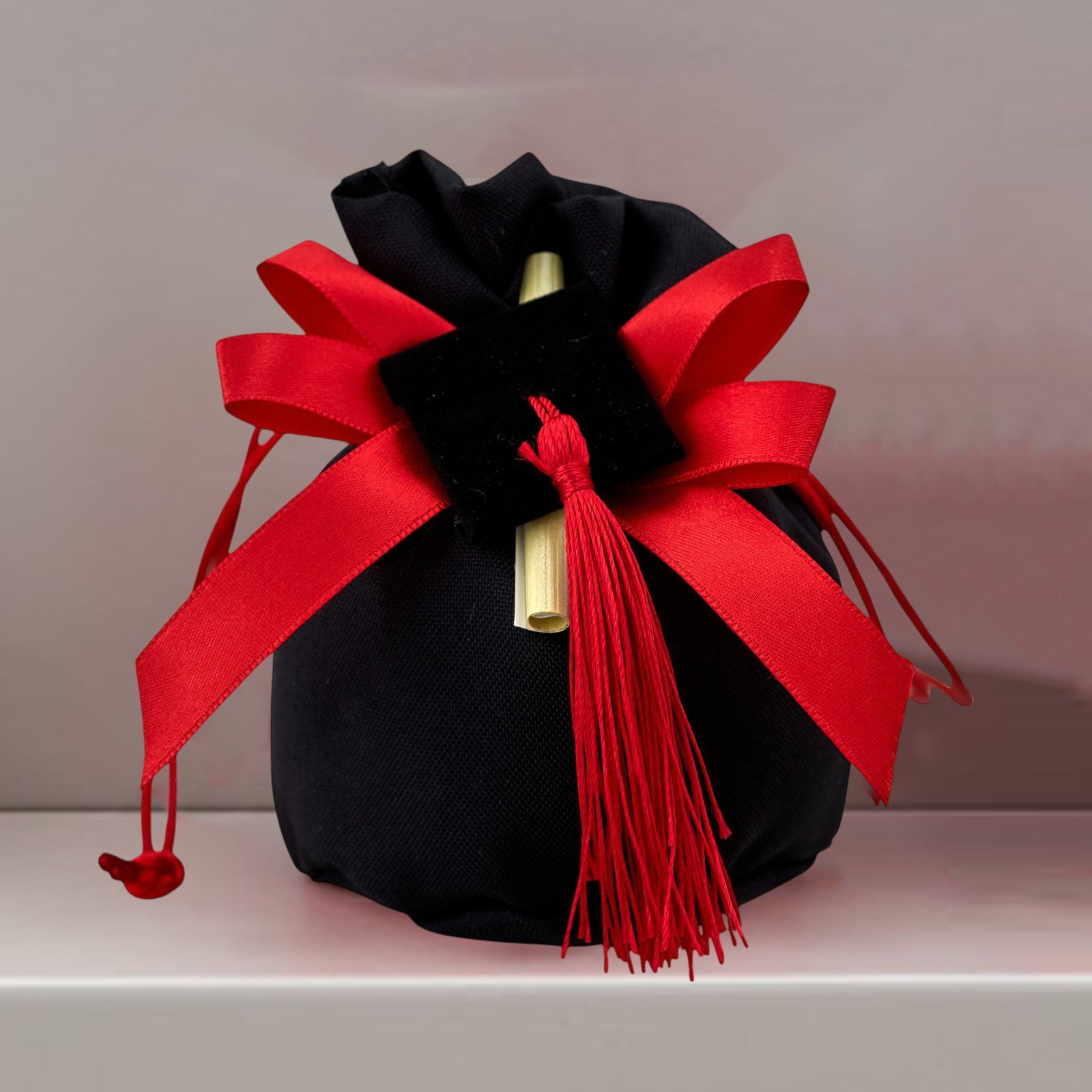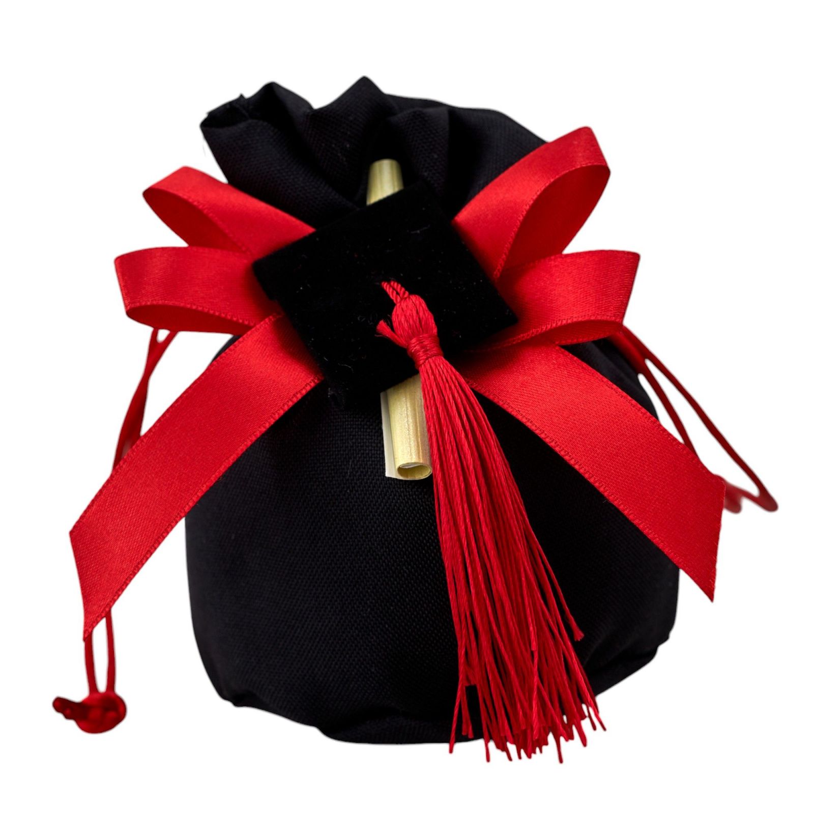 Stupisci i tuoi invitati con una bomboniera unica e originale per celebrare la tua laurea. Il Sacchetto a Palla con tiranti è realizzato in morbido cotone nero, impreziosito da un doppio fiocco rosso e un'elegante applicazione tocco con pergamena. Questa bomboniera è perfetta per un evento speciale come la laurea, aggiungendo un tocco di eleganza e originalità alla tua festa.
