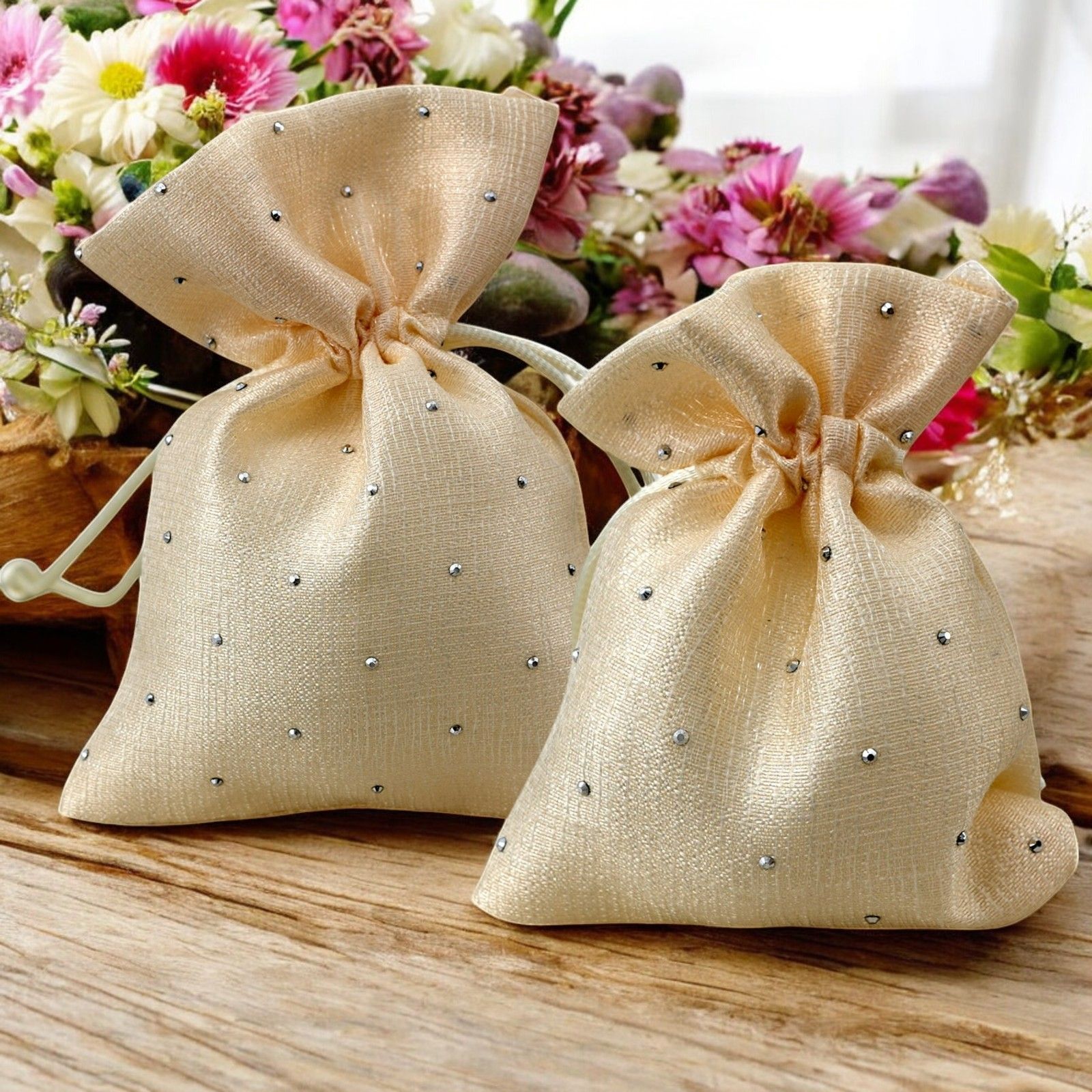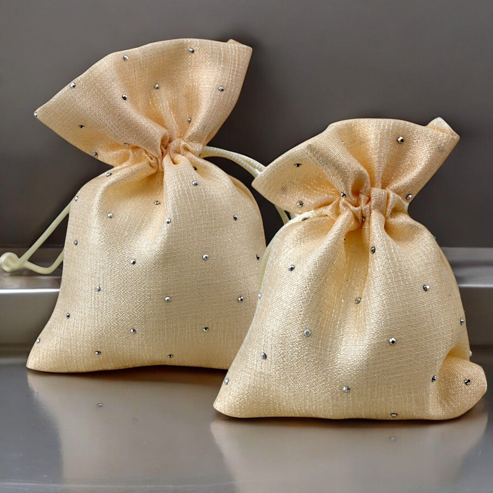 Per rendere speciale il tuo evento, scopri i nostri sacchettini portaconfetti decorati con strass. Realizzati in elegante raso color panna, sono disponibili in due dimensioni: Standard (8 x 10 cm circa) e Grande (10 x 14 cm circa). Ideali per eventi come comunione, cresima, anniversario e matrimonio, questi sacchetti sono perfetti per creare una confettata indimenticabile.
